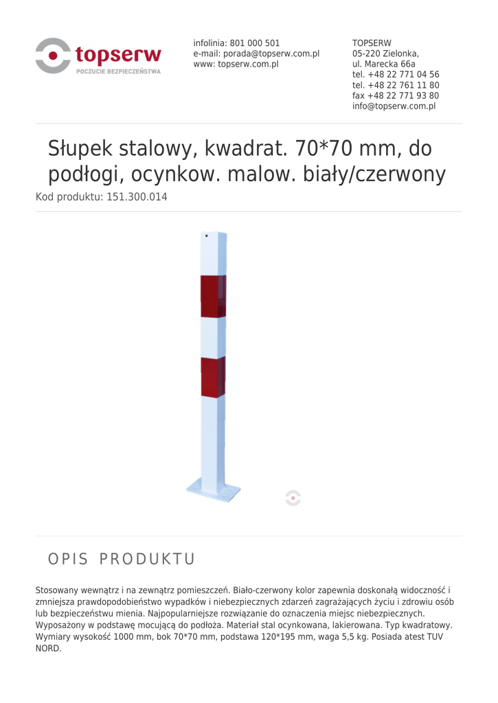 infolinia: 801 000 501 e-mail: [email protected] www: topserw.com.pl TOPSERW 05-220 Zielonka, ul. Marecka 66a tel. +48 22 771 04 56 tel. +48 22 761 11 80 fax +48 22 771 93 80 [email protected] Słupek stalowy, kwadrat. 70*70 mm, do podłogi, ocynkow. malow. biały/czerwony Kod produktu: 151.300.014 OPIS PRODUKTU Stosowany wewnątrz i na zewnątrz pomieszczeń. Biało-czerwony kolor zapewnia doskonałą widoczność i zmniejsza prawdopodobieństwo wypadków i niebezpiecznych zdarzeń zagrażających życiu i zdrowiu osób lub bezpieczeństwu mienia. Najpopularniejsze rozwiązanie do oznaczenia miejsc niebezpiecznych. Wyposażony w podstawę mocującą do podłoża. Materiał stal ocynkowana, lakierowana. Typ kwadratowy. Wymiary wysokość 1000 mm, bok 70*70 mm, podstawa 120*195 mm, waga 5,5 kg. Posiada atest TUV NORD. DANE TECHNICZNE Waga 5,5 kg Wysokość 1000 mm POWIĄZANE Produkt Szerokość całkowita [mm] Długość [mm] Szerokość przejścia [mm] Waga [kg] Słupek stalowy, kwadrat. 70*70 mm, do podłogi, 2*uchwyt oczkowy, ocynkow. malow. żółty/czarny -- -- -- 5,7 Słupek stalowy, kwadrat. 70*70 mm, do podłogi, ocynkow. malow. żółty/czarny -- -- -- 5,5 Słupek stalowy, kwadrat. 70*70 mm, do podłogi, 2*uchwyt oczkowy, ocynkow. malow. biały/czerwony -- -- -- 5,7 Słupek stalowy, kwadrat. 70*70 mm, do podłogi, ocynkow. malow. biały/czerwony -- -- -- 5,5 Słupek stalowy, kwadrat. 70*70 mm, do zabetonowania, 2*uchwyt oczkowy, ocynkow. malow. żółty/czarny -- -- -- 6,2 Słupek stalowy, kwadrat. 70*70 mm, do zabetonowania, ocynkow. malow. żółty/czarny -- -- -- 6 Słupek stalowy, kwadrat. 70*70 mm, do zabetonowania, 2*uchwyt oczkowy, ocynkow. malow. biały/czerwony -- -- -- 6,2 Słupek stalowy, kwadrat. 70*70 mm, do zabetonowania, ocynkow. malow. biały/czerwony -- -- -- 6