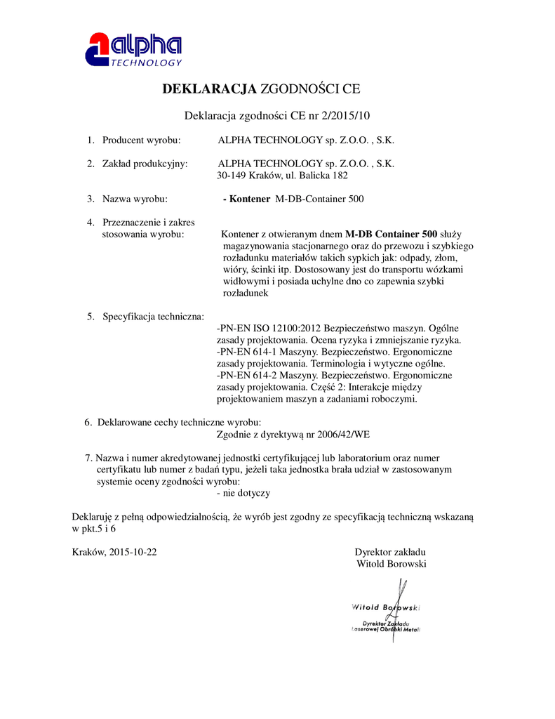 DEKLARACJA ZGODNOŚCI CE Deklaracja zgodności CE nr 2/2015/10 1. Producent wyrobu: ALPHA TECHNOLOGY sp. Z.O.O. , S.K. 2. Zakład produkcyjny: ALPHA TECHNOLOGY sp. Z.O.O. , S.K. 30-149 Kraków, ul. Balicka 182 3. Nazwa wyrobu: 4. Przeznaczenie i zakres stosowania wyrobu: - Kontener M-DB-Container 500 Kontener z otwieranym dnem M-DB Container 500 służy magazynowania stacjonarnego oraz do przewozu i szybkiego rozładunku materiałów takich sypkich jak: odpady, złom, wióry, ścinki itp. Dostosowany jest do transportu wózkami widłowymi i posiada uchylne dno co zapewnia szybki rozładunek 5. Specyfikacja techniczna: -PN-EN ISO 12100:2012 Bezpieczeństwo maszyn. Ogólne zasady projektowania. Ocena ryzyka i zmniejszanie ryzyka. -PN-EN 614-1 Maszyny. Bezpieczeństwo. Ergonomiczne zasady projektowania. Terminologia i wytyczne ogólne. -PN-EN 614-2 Maszyny. Bezpieczeństwo. Ergonomiczne zasady projektowania. Część 2: Interakcje między projektowaniem maszyn a zadaniami roboczymi. 6. Deklarowane cechy techniczne wyrobu: Zgodnie z dyrektywą nr 2006/42/WE 7. Nazwa i numer akredytowanej jednostki certyfikującej lub laboratorium oraz numer certyfikatu lub numer z badań typu, jeżeli taka jednostka brała udział w zastosowanym systemie oceny zgodności wyrobu: - nie dotyczy Deklaruję z pełną odpowiedzialnością, że wyrób jest zgodny ze specyfikacją techniczną wskazaną w pkt.5 i 6 Kraków, 2015-10-22 Dyrektor zakładu Witold Borowski