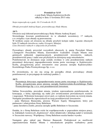 Protokół nr X/15 z sesji Rady Miasta Kędzierzyn-Koźle odbytej w dniu 15 kwietnia 2015 roku Sesja rozpoczęła się o godz. 16:15 trwała do 18:25. Obrady prowadził Andrzej Kopeć, przewodniczący Rady Miasta. Ad 1. Otwarcia sesji dokonał przewodniczący Rady Miasta Andrzej Kopeć. Stwierdzając kworum poinformował, że w obradach uczestniczy 17 radnych, a w związku z tym obrady są prawomocne. W krótkim czasie od otwarcia na obrady przybyli kolejni radni. Łącznie obecnych było 22 radnych (nieobecny radny Grzegorz Mateja). Lista obecności radnych w załączeniu do protokołu. Prowadzący obrady przywitał wszystkich obecnych, tj. panią Prezydent Miasta i Zastępców Prezydenta Miasta, kierowników wydziałów Urzędu Miasta oraz gminnych jednostek organizacyjnych, przedstawicieli inwestorów, radnych, przedstawicieli prasy i radia oraz przybyłych na dzisiejszą sesję mieszkańców. Poinformował, że dzisiejsza sesja została zwołana w celu przedstawienia radnym prezentacji dotyczącej zagospodarowania terenu portu rzecznego w KędzierzynieKoźlu, przygotowaną przez inwestorów oraz prezesa zarządu KędzierzyńskoKozielskiego Parku Przemysłowego Sp. z o.o. Po stwierdzeniu, że nie ma uwag do porządku obrad, prowadzący obrady poinformował, że przystępuje do realizacji punktu 2. Ad 2. Prezentacja dotycząca zagospodarowania terenu portu rzecznego w KędzierzynieKoźlu, przygotowana przez prezesa zarządu Kędzierzyńsko-Kozielskiego Parku Przemysłowego Sp. z o.o. oraz przedstawicieli inwestora. Sabina Nowosielska, prezydent miasta, tytułem wprowadzenia poinformowała, że koncepcja, z którą zapoznają się radni jest uwieńczeniem prowadzonych rozmów i negocjacji. Wdrożenie koncepcji ożywi port, co wpłynie korzystnie na rozwój miasta. Następnie przedstawiła zaproszonych na sesję przedstawicieli inwestorów: - pana Mariusza Banaszuka, prezesa Warsaw Equity Management, który jest partnerem i właścicielem firmy Baltchem; - pana Jarosława Żemło, prezesa zarządu spółki Baltchem w Szczecinie. Dodała, że z firmą Baltchem wiele lat współpracowała w poprzednim miejscu pracy, tj. Zakładach Azotowych „Kędzierzyn”, które składowały i składują nadal w terminalu w Szczecinie nawozy. Współpracę i firmę Baltchem ocenia bardzo wysoko. Następnie głos zabrał pan Mariusz Banaszuk. Podziękował za możliwość zaprezentowania Radzie Miasta i mieszkańcom projektu rozbudowy portu 1 w Kędzierzynie-Koźlu. Szczególnie podziękował pani Sabinie Nowosielskiej, prezydent miasta, i Wiesławowi Skwarko, prezesowi KKPP Sp. z o.o,. za ogromne zaufanie w procesie rozmów i dyskusji na temat możliwości zagospodarowania portu. W dalszej części radni zapoznali się z multimedialną prezentacją. I część prezentacji zawierała informację na temat spółki Warsaw Equity Management i Baltchem S.A. II część prezentacji, którą omówił pan Jarosław Żemło, przedstawiała założenia ogólne realizacji projektu, koncepcję rozwoju portu, w tym budowę terminala na masowe produkty płynne, terminala na kontenery i terminala na produkty sypkie (kruszywa, minerały, stal itp.) Łączne nakłady inwestycyjne: 300-420 milionów zł, termin realizacji: 5-8 lat (w zależności od warunków rynkowych). Harmonogram realizacji aktualnie jest bardzo ogólny i zależy od warunków umowy, a pierwszą rzeczą jest negocjacja umowy dzierżawy z opcją kupna terenów pod planowane inwestycje. Po zawarciu umowy dalsze działania będą związane z wystąpieniem i uzyskaniem warunków środowiskowych, wykonaniem analizy geologicznej i geotechnicznej. Kolejne etapy będą dotyczyły uzgodnień z właściwymi podmiotami zasad i harmonogramów dostarczania mediów, komunikacji kolejowej i drogowej itp., wykonanie projektu koncepcyjnego i budowlanego dla inwestycji, a następnie rozpoczęcia prac budowlanych. Realizacja powyższych inwestycji zależy od zakończenia negocjacji umowy dzierżawy/zakupu terenów inwestycyjnych i uzyskania wymaganych zgód. (prezentacja w wersji papierowej – dołączona do protokołu) Andrzej Kopeć poprosił o informację na temat przewidywanej wielkości zatrudnienia na terenie portu. Mariusz Banaszuk wyjaśnił, że liczba ta zależy nie tylko od samej infrastruktury, ale również od biznesów, które będą usytuowane na terenie portu i będą współpracowały pośrednio lub bezpośrednio. Jeżeli pierwszy terminal zostanie wybudowany, to będzie możliwość zatrudnienia 50 osób, a przy uruchomieniu kolejnych terminali szacuje, że zatrudnienie będzie podobne, czyli w sumie ok. 120-150 osób bezpośrednio zatrudnionych i zaangażowanych w działalność operacyjną. Jeżeli port stanie się takim centrum handlowym, to tych biznesów będzie więcej. Ryszard Masalski zauważył, że prowadzenie portu ma być powierzone spółce Warsaw Equity Management. Zwrócił się z pytaniem, czy przewiduje się utworzenie wzmiankowanej spółki celowej, z kilkoma udziałowcami – w tym KKPP, który jako wkład własny mógłby wnieść aportem do spółki-córki grunty. Drugie pytanie dotyczyło struktury finansowania: środków własnych, kredytów i obligacji. Jaką wielkość będzie posiadał kapitał założycielski projektowanej spółki. Czy siedzibą tej spółki będzie Kędzierzyn-Koźle. Kolejne pytanie dotyczyło dat określających termin rozpoczęcia inwestycji (2016 r.) i termin rozpoczęcia działalności (2017 r.). Dodał, że takie daty zostały podane na sesji 15 października 2014 r. Poprosił o informacje, czy podane wówczas daty są realne. Czy znana są powody opóźnienia o dwa lata budowy 2 stopnia wodnego w Malczycach za Wrocławiem, od którego wybudowania zależy żeglowność Odry od Gliwic do Świnoujścia. Mariusz Banaszuk odpowiadając na pytanie dot. struktury transakcji, polegającej na wydzierżawieniu, a potem zakupieniu przez inwestora terenu portu wyjaśnił, że w pierwszym etapie dzierżawa grunt