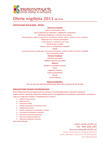 Oferta wigilijna 2011 dla firm SPOTKANIE WIGILIJNE - MENU Zimne przekąski Uszka w czerwonym oczku Karp w galarecie po żydowsku z migdałami i rodzynkami Miniaturki świąteczne z różnych stron świata Kolorowe ptysie, babeczki i smartinki ze szlachetnymi rybami, rakami, owocami morza, i grzybami Śledziowe trio z kresów wschodnich w oleju lnianym, w śmietanie, pod szubą Pomorski zylc ze śledzi Owoce morza w szampaoskim auszpiku Sałatki Jarzynowa, kresowa z białą rybą i czerwonymi buraczkami, cocktail z krabów i krewetek , Waldorff Sosy, pieczywo, masło Gorąca tradycja Półmisek ryb z pieca Wigilijna kapusta z grzybami Desery Kompot z suszonych owoców Kutia Legumina makowa Ciasto cynamonowe Piernik Torcik makowy Koszt na osobę 40 zł. W cenę wliczono zastawę jednorazową. Minimalne zamówienie dla 20 osób ŚWIĄTECZNE KOSZE UPOMINKOWE Nasze eleganckie kosze przygotowujemy w klimacie mazowieckiego dworu zakręcamy odrobiną nowoczesności. Zawierają wyłącznie produkty przez nas przygotowane od podstaw z naturalnych surowców w oparciu o tradycyjne przepisy. Przykładowy kosz zawiera: Śledzia w oleju lnianym Pikle korzenne Smalczyk po zbóju Dwikłę staropolską na czerwonym winie Miodówkę korzenną Piernik z bakaliami na prawdziwym miodzie Smakoblok czekoladowy z bakaliami Koncentrat lemoniady imbirowej Pierniczki świąteczne Babci Asi Mieszankę wędzonych owoców Cena 150 zł./brutto www.smakowidla.pl Tel. 889-686-209 [email protected] Amazu Group Zuzanna Madeyska-Świderska Wola Gołkowska, Kolonia 12A, 05-503 Głosków NIP: 524-25-69-172