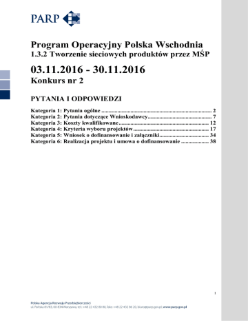 Program Operacyjny Polska Wschodnia 1.3.2 Tworzenie sieciowych produktów przez MŚP 03.11.2016 - 30.11.2016 Konkurs nr 2 PYTANIA I ODPOWIEDZI Kategoria 1: Pytania ogólne ............................................................................ 2 Kategoria 2: Pytania dotyczące Wnioskodawcy ............................................ 7 Kategoria 3: Koszty kwalifikowane .............................................................. 12 Kategoria 4: Kryteria wyboru projektów .................................................... 17 Kategoria 5: Wniosek o dofinansowanie i załączniki.................................. 34 Kategoria 6: Realizacja projektu i umowa o dofinansowanie ................... 38 1 Kategoria 1: Pytania ogólne Idź do spisu treści Pytanie 1: Czy mając doświadczenie pierwszej edycji konkursu, nie uważają Państwo, że złagodzenie kryteriów wejścia: - z 20 mln do 10 mln - z 10 konsorcjantów do 5 nie byłoby skuteczniejsze? Możliwość zmiany kryteriów w działaniu 1.3.2 zostanie rozważona po zakończeniu naboru wniosków w ramach drugiego naboru. Uwzględnione zostaną przy tym dotychczasowe doświadczenia i sygnały płynące od wnioskodawców. Wprowadzenie takich zmian wymaga akceptacji przez Komitet Monitorujący Programu Operacyjnego, po wcześniej przeprowadzonych konsultacjach społecznych. Pytanie 2: Kategoria 1: Pytania ogólne Proszę o informację czy w ramach Działania 1.3 Ponadregionalne powiązania kooperacyjne, poddziałania 1.3.2 Tworzenie sieciowych produktów przez MŚP Programu Operacyjnego Polska Wschodnia 2014-2020 jest planowany nabór konkursów w roku 2017? Czy jest gdzieś do wglądu harmonogram konkursów na cały okres realizacji Programu Operacyjnego Polska Wschodnia 2014-2020? Planowane jest przeprowadzenie kolejnego naboru w 2017 r. Zgodnie z zapisami Ustawy z dnia 11 lipca 2014 r. o zasadach realizacji programów w zakresie polityki spójności finansowanych w perspektywie finansowej 2014-2020 (Dz.U.2016.217 j.t. z dnia 2016.02.22), Art. 47 Harmonogram naborów wniosków o dofinansowanie projektu w trybie konkursowym, ust. 1 „Instytucja zarządzająca do dnia 30 listopada każdego roku zamieszcza na swojej stronie internetowej oraz na portalu harmonogram naborów wniosków o dofinansowanie projektu w trybie konkursowym, których przeprowadzenie jest planowane na kolejny rok kalendarzowy.” Aktualne informacje odnośnie naborów, w tym harmonogram naborów wniosków są dostępne na stronie PARP www.parp.gov.pl. Pytanie 3: Czy na Państwa stronie została może opublikowana lista wniosków złożonych w ramach 1.3.2? https://www.polskawschodnia.gov.pl/nabory/13-ponadregionalne-powiazaniakooperacyjne-132-tworzenie-sieciowych-produktow-przez-msp/ Jeśli tak to uprzejmie proszę o wskazanie linku, a jeśli nie - proszę o przesłanie listy. W ramach pierwszego konkursu w poddziałaniu 1.3.2 Tworzenie sieciowych produktów przez MSP Programu Operacyjnego Polska Wschodnia 2014-2020 publikacji podlegała lista projektów spełniających kryteria formalne wyboru projektów i zakwalifikowanych do oceny merytorycznej oraz lista projektów, które zostały wybrane do dofinansowania. Listy są dostępne na stronie http://popw.parp.gov.pl/lista-projektow/popw-lista-projektow-1-3-2. Publikacji nie podlega natomiast lista wszystkich wniosków złożonych w ramach 1.3.2 POPW. Nie ma również możliwości jej przesłania. 2 Pytanie 4: Rozwój produktu sieciowego Y w oparciu o nowy model sprzedaży usług w branży X. W ramach projektu planuje się wdrożenie pakietu usług świadczonych przez podmioty z branży X, przy czym innowację stanowić będzie model sprzedaży. Projekt przewiduje prace zw. utworzeniem spójnej infrastruktury zapewniającej jednolity wizerunek marketingowy (projekt, prace budowlano-remontowe w zakresie utworzenia salonów sprzedaży usług, dodatkowo oznakowanie śr, transportu), rozwój aplikacji i usług inf-komunikacyjnych (zakup systemu do zarządzania klientami i usługami, strona www promująca usługi pod jedną marką wraz z możliwością sprzedaży usług) opracowanie i wdrożenie jednolitych standardów - opracowanie standardów i szkolenia (marketingowych, promocyjnych, obsługi klienta, dokumentacji, świadczenia usług wraz ze standardami rozbudowy podmiotów itp.) Kategoria 1: Pytania ogólne Ocena konkretnych rozwiązań, ich poprawność i wpisywanie się w zasady konkursu, będzie przedmiotem szczegółowych analiz na etapie oceny wniosku o dofinansowanie. Zgodnie z § 8 ust. 2 Regulaminu konkursu ocena projektów dokonywana jest przez Komisję Oceny Projektów, w tym na spotkaniu z wnioskodawcą na Panelu Ekspertów. Ocena ta dokonywana jest za pośrednictwem kryteriów oceny, które zostały opublikowane wraz z ogłoszeniem o konkursie na stronach internetowych PARP. Można tam znaleźć również pozostałe dokumenty, które dostarczą niezbędnych informacji pozwalających na wstępną ocenę możliwości sfinansowania / kwalifikowania się projektu w ramach poddziałania 1.3.2 POPW. Zwracamy uwagę na fakt, że projekty realizowane w ramach poddziałania 1.3.2 POPW muszą być innowacyjne (innowacja produktowa – zgodnie z kryterium merytorycznym rankingującym nr 1 „Innowacyjność produktu”). Pod pojęciem innowacji produktowej rozumieć należy wprowadzenie do praktyki w gospodarce nowego lub znacząco ulepszonego rozwiązania wyłącznie w odniesieniu do produktu (wyrobu lub usługi). W przypadku poddziałania 1.3.2 odnosi się ona do innowacyjnego przynajmniej na poziomie kraju produktu sieciowego, który ma być efektem realizacji projektu. Pytanie 5: Po spotkaniu informacyjnym 11.10 w Warszawie miała być opublikowana na stronie PARPu prezentacja z tego spotkania. Proszę o informację czy została umieszczona na stronie i nie mogę jej znaleźć czy może nie została umieszczona. Przy rejestracji na spotkanie informacyjne mogliśmy poprzez formularz zadać pytanie. Zrobiliśmy 