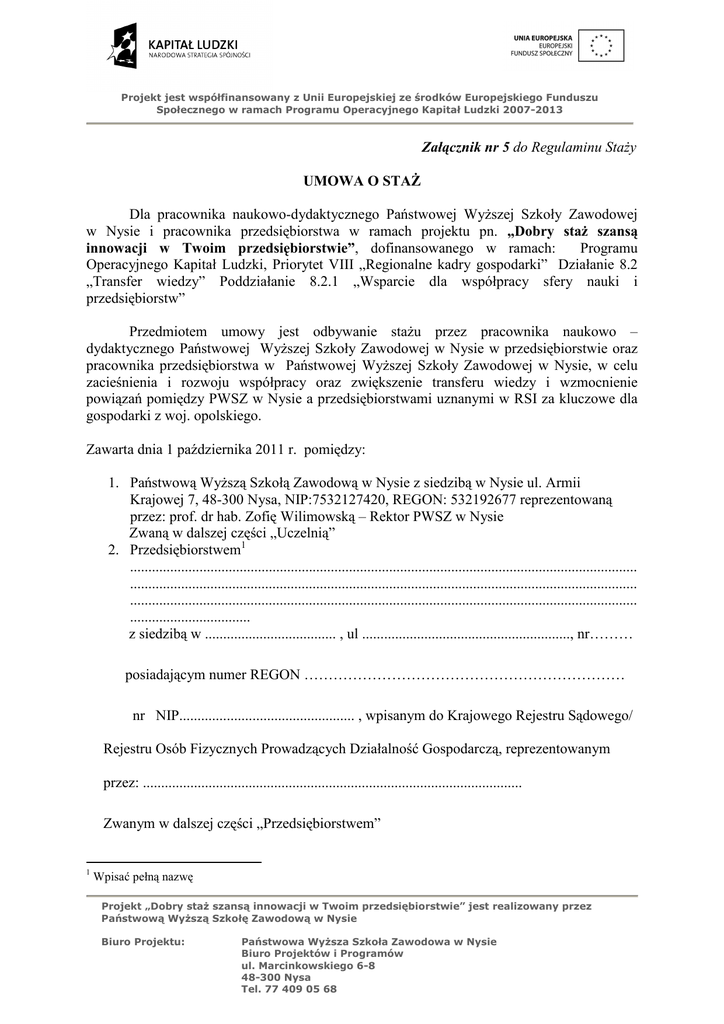 Projekt jest współfinansowany z Unii Europejskiej ze środków Europejskiego Funduszu Społecznego w ramach Programu Operacyjnego Kapitał Ludzki 2007-2013 Załącznik nr 5 do Regulaminu StaŜy UMOWA O STAś Dla pracownika naukowo-dydaktycznego Państwowej WyŜszej Szkoły Zawodowej w Nysie i pracownika przedsiębiorstwa w ramach projektu pn. „Dobry staŜ szansą innowacji w Twoim przedsiębiorstwie”, dofinansowanego w ramach: Programu Operacyjnego Kapitał Ludzki, Priorytet VIII „Regionalne kadry gospodarki” Działanie 8.2 „Transfer wiedzy” Poddziałanie 8.2.1 „Wsparcie dla współpracy sfery nauki i przedsiębiorstw” Przedmiotem umowy jest odbywanie staŜu przez pracownika naukowo – dydaktycznego Państwowej WyŜszej Szkoły Zawodowej w Nysie w przedsiębiorstwie oraz pracownika przedsiębiorstwa w Państwowej WyŜszej Szkoły Zawodowej w Nysie, w celu zacieśnienia i rozwoju współpracy oraz zwiększenie transferu wiedzy i wzmocnienie powiązań pomiędzy PWSZ w Nysie a przedsiębiorstwami uznanymi w RSI za kluczowe dla gospodarki z woj. opolskiego. Zawarta dnia 1 października 2011 r. pomiędzy: 1. Państwową WyŜszą Szkołą Zawodową w Nysie z siedzibą w Nysie ul. Armii Krajowej 7, 48-300 Nysa, NIP:7532127420, REGON: 532192677 reprezentowaną przez: prof. dr hab. Zofię Wilimowską – Rektor PWSZ w Nysie Zwaną w dalszej części „Uczelnią” 2. Przedsiębiorstwem1 ........................................................................................................................................... ........................................................................................................................................... ........................................................................................................................................... ................................. z siedzibą w .................................... , ul ........................................................., nr……… posiadającym numer REGON ………………………………………………………… nr NIP................................................ , wpisanym do Krajowego Rejestru Sądowego/ Rejestru Osób Fizycznych Prowadzących Działalność Gospodarczą, reprezentowanym przez: ........................................................................................................ Zwanym w dalszej części „Przedsiębiorstwem” 1 Wpisać pełną nazwę Projekt „Dobry staŜ szansą innowacji w Twoim przedsiębiorstwie” jest realizowany przez Państwową WyŜszą Szkołę Zawodową w Nysie Biuro Projektu: Państwowa WyŜsza Szkoła Zawodowa w Nysie Biuro Projektów i Programów ul. Marcinkowskiego 6-8 48-300 Nysa Tel. 77 409 05 68 Projekt jest współfinansowany z Unii Europejskiej ze środków Europejskiego Funduszu Społecznego w ramach Programu Operacyjnego Kapitał Ludzki 2007-2013 3. Panem/Panią2 ................................................................................................ , zamieszkałym/łą w ................................ , ul. ....................................... , nr ...... , m .............. , legitymującym się dowodem osobistym seria ............... Nr ............................. posiadającym/ą nr PESEL ………………………., nr NIP …………….….…............... synem/ córką3 ………………………… i ………………………………….................... rozliczającym/ą się z Urzędem Skarbowym4 .................................................................. ………………………………………………………………………………………….. Zwanym/zwaną w dalszej części umowy „StaŜystą uczelni” 4. Panem/Panią5 ................................................................................................ , zamieszkałym/łą w ................................ , ul. ....................................... , nr ...... , m .............. , legitymującym się dowodem osobistym seria ............... Nr ............................. posiadającym/ą nr PESEL ………………………., nr NIP …………….….…............... synem/ córką6 ………………………… i ………………………………….................... rozliczającym/ą się z Urzędem Skarbowym7 .................................................................. ………………………………………………………………………………………….. Zwanym/zwaną w dalszej części umowy „StaŜystą przedsiębiorstwa” Umowa zostaje zawarta na czas oznaczony od od dnia: 1 października 2011 r. do dnia: 31 marca 2012 r. §1 Państwowa WyŜsza Szkoła Zawodowa w Nysie oświadcza, Ŝe: 1. jest wykonawcą projektu o nazwie: „Dobry staŜ szansą innowacji w Twoim przedsiębiorstwie” i na podstawie zawartej umowy o dofinansowanie projektu w ramach Programu Operacyjnego Kapitał Ludzki zawartej w dniu: 26 lipca 2011 r. nr – POKL.08.02.01-16-011/11-00 posiada zagwarantowane środki na realizację programu staŜowego będącego przedmiotem niniejszej umowy, 2. nie ponosi odpowiedzialności za szkody wyrządzone przez StaŜystę wskutek jego działań lub zaniechań podczas odbywania staŜu, w szczególności PWSZ w Nysie nie 2 Wpisać oba imiona StaŜysty uczelni Wpisać imiona rodziców StaŜysty uczelni 4 Wpisać nazwę i adres Urzędu Skarbowego 5 Wpisać oba imiona StaŜysty przedsiębiorstwa 6 Wpisać imiona rodziców StaŜysty przedsiębiorstwa 7 Wpisać nazwę i adres Urzędu Skarbowego 3 Projekt „Dobry staŜ szansą innowacji w Twoim przedsiębiorstwie” jest realizowany przez Państwową WyŜszą Szkołę Zawodową w Nysie Biuro Projektu: Państwowa WyŜsza Szkoła Zawodowa w Nysie Biuro Projektów i Programów ul. Marcinkowskiego 6-8 48-300 Nysa Tel. 77 409 05 68 Projekt jest współfinansowany z Unii Europejskiej ze środków Europejskiego Funduszu Społecznego w ramach Programu Operacyjnego