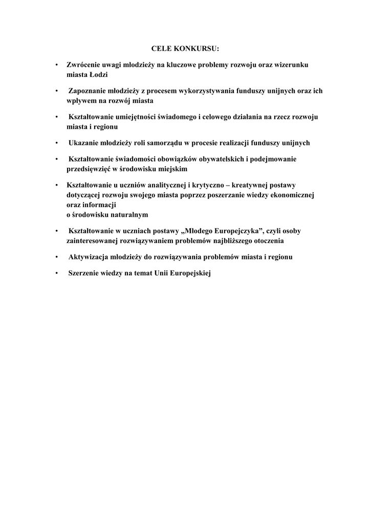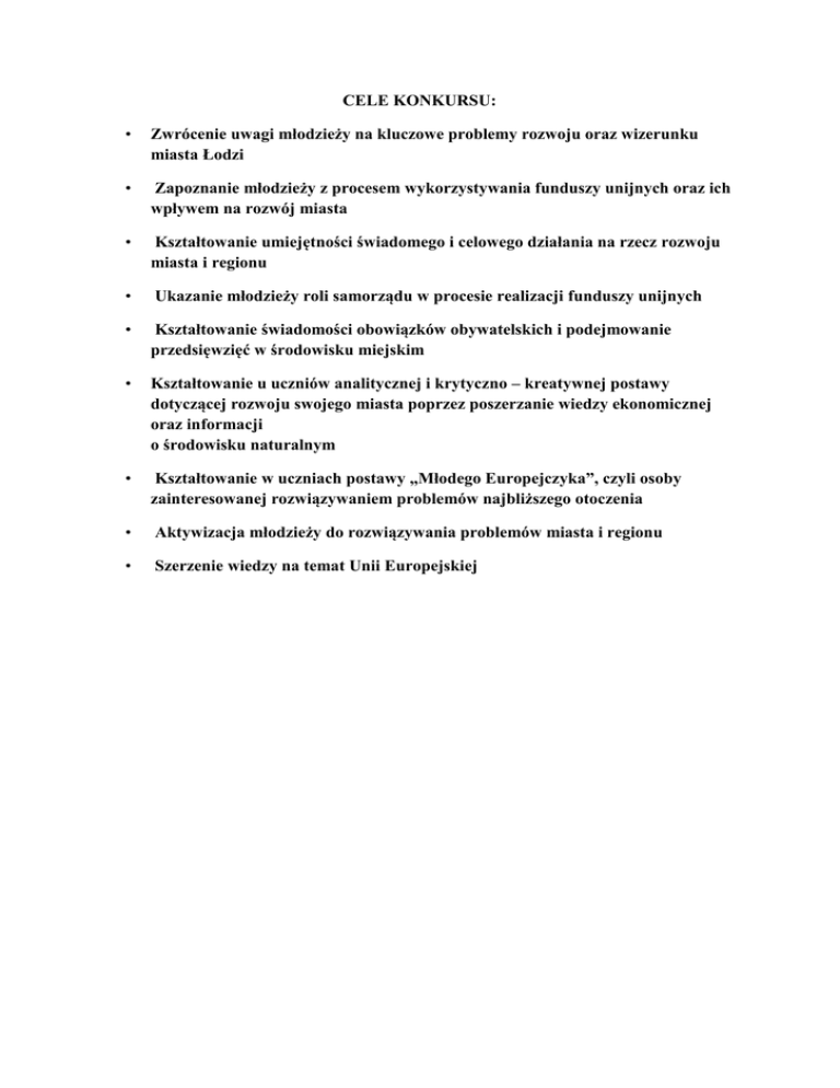 CELE KONKURSU: • Zwrócenie uwagi młodzieży na kluczowe problemy rozwoju oraz wizerunku miasta Łodzi • Zapoznanie młodzieży z procesem wykorzystywania funduszy unijnych oraz ich wpływem na rozwój miasta • Kształtowanie umiejętności świadomego i celowego działania na rzecz rozwoju miasta i regionu • Ukazanie młodzieży roli samorządu w procesie realizacji funduszy unijnych • Kształtowanie świadomości obowiązków obywatelskich i podejmowanie przedsięwzięć w środowisku miejskim • Kształtowanie u uczniów analitycznej i krytyczno – kreatywnej postawy dotyczącej rozwoju swojego miasta poprzez poszerzanie wiedzy ekonomicznej oraz informacji o środowisku naturalnym • Kształtowanie w uczniach postawy „Młodego Europejczyka”, czyli osoby zainteresowanej rozwiązywaniem problemów najbliższego otoczenia • Aktywizacja młodzieży do rozwiązywania problemów miasta i regionu • Szerzenie wiedzy na temat Unii Europejskiej REGULAMIN KONKURSU: 1. POSTANOWIENIA OGÓLNE ORGANIZATORZY KONKURSU: • Publiczne Gimnazjum nr 3 im. F. Chopina w Łodzi • Europoseł Ziemi Łódzkiej Jacek Saryusz-Wolski UCZESTNICY KONKURSU: • Uczestnikiem konkursu mogą być uczniowie gimnazjów z Łodzi i Województwa Łódzkiego. • Każda szkoła może zgłosić do udziału w konkursie maksymalnie dwa zespoły dwuosobowe 2. PRZEBIEG KONKURSU: • Realizacja konkursu będzie odbywała się w oparciu o serię wykładów tematycznych, warsztatów oraz ćwiczeń mających na celu dostarczenie uczestnikom niezbędnej wiedzy • Konkurs będzie realizowany od 1 lutego do 8 lutego 2016 roku, w budynku Publicznego Gimnazjum nr 3 w Łodzi, przy ulicy Zacisze 7 / 9. Gala finałowa odbędzie się w marcu (termin do uzgodnienia) – ze względu na terminarz Europosła Jacka Saryusz–Wolskiego • Zadaniem uczestników będzie napisanie konkursowego wniosku o dofinansowanie z Unii Europejskiej swojego projektu i przekazanie go komisji konkursowej do dnia 4 marca 2016 roku 3. KRYTERIA OCENY: Uczniowie w części podstawowej mogą łącznie uzyskać 100 pkt. Ocenie podlegają następujące elementy: 1. TEST (30 pkt) - Pytania obejmują tematykę wykładów: 15 pytań zamkniętych jednokrotnego wyboru (15 x 2 pkt) 2. PRÓBNE WYPEŁNIENIE WNIOSKU (10 pkt) Punkty zostaną przyznane przez niezależną komisję konkursową po bezpośredniej rozmowie z uczestnikami o ich projekcie 3. WNIOSEK (60 pkt) – ocena całego wypełnionego wniosku LICZBA UZYSKANYCH PUNKTÓW ZADECYDUJE O WEJŚCIU DO FINAŁU – W KTÓRYM ZAPREZENTUJĄ SIĘ JEDYNIE TRZY NAJLEPSZE ZESPOŁY. PODCZAS FINAŁU KAŻDY ZESPÓŁ BĘDZIE MÓGŁ ZDOBYĆ DODATKOWE 75 PUNKTÓW (Każdy z pięciu jurorów będzie mógł przyznać po maksymalnie 5 punktów w trzech kategoriach – prezentacja multimedialna, umiejętność zaprezentowania się, odpowiedzi na pytania ekspertów) 4. NAGRODY I nagroda: Wyjazd studyjny do Brukseli ufundowany przez europosła Jacka Saryusz-Wolskiego (dla 2-osobowej drużyny wraz z opiekunem) W ramach wyjazdu uczestnikom zapewnione zostaną następujące świadczenia: - Przejazd autokarem do/z Brukseli z/do Łodzi; - 2 noclegi w hotelu w pokojach minimum 2-osobowych; - Wyżywienie podstawowe w miejscu docelowym; - Opiekun grupy podczas całego wyjazdu, tj. od momentu wyjazdu z miejsca zbiórki do momentu przyjazdu na miejsce zbiórki. W ramach wyjazdu współorganizator nie odpowiada za rzeczy zaginione lub skradzione uczestnikom wyjazdu studyjnego. Współorganizator nie pokrywa kosztów ubezpieczenia na czas wyjazdu studyjnego. Uczestnicy wyjazdu studyjnego zobowiązani są do posiadania ważnej Europejskiej Karty Ubezpieczenia Zdrowotnego (EKUZ). II i III nagroda: Cenne nagrody rzeczowe Ponadto wszyscy uczestnicy i ich opiekunowie otrzymają certyfikaty oraz upominki. Szkoły biorące udział w konkursie otrzymają dyplomy. 5. POSTANOWIENIA KOŃCOWE • Decyzje komisji konkursowej są niezależne i nie przysługuje od nich odwołanie • Organizatorzy zastrzegają sobie prawo do zmiany ilości przyznawanych nagród, bądź dokonania zmian w terminie konkursu • Organizatorzy zastrzegają sobie prawo do opublikowania imion, nazwisk, zdjęć i informacji o zwycięzcach i uczestnikach konkursu • Wszyscy uczestnicy konkursu poprzez przystąpienie do niego akceptują warunki niniejszego regulaminu HARMONOGRAM KONKURSU 1 II 2016 r. (poniedziałek) godz. 15:00 cz. 1 Zapoznanie z regulaminem konkursu, jego celami oraz prezentacja nagród. (Dyrektor Gimnazjum nr 3 w Łodzi – Sławomir Wołczyk, Tomasz Wójcik, Rafał Nowak – organizatorzy konkursu, Przedstawiciel Biura Poselskiego dr. Jacka Saryusz–Wolskiego Agata Roksela) cz. 2 Wykład: Jak zdobywać środki z Unii Europejskiej? (mgr Konrad Gucwa / Alior Bank, zastępca wójta Gminy Andrespol) Ćwiczenia: Jak wypełnić wniosek o dofinansowanie projektu? (mgr Konrad Gucwa / Alior Bank) + Zadanie do wykonania dla uczniów – próbne wypełnienie wniosku 4 II 2016 r. (czwartek) godz. 15:00 Wykład o instytucjach oraz budżecie Unii Europejskiej (dr A. Rosiak / Wyższa Szkoła Handlowa w Piotrkowie Trybunalskim, VIII Liceum Ogólnokształcące w Łodzi) 8 II 2016 r. (poniedziałek) godz. 15:00 cz. 1 Rozmowa na temat wstępnie wypełnionych wniosków. Pytania (mgr Konrad Gucwa / Alior Bank, zastępca wójta Gminy Andrespol) cz. 2 TEST (przeprowadzony przez niezależną komisję konkursową) 4 III 2016 r. (piątek) Ostateczny termin złożenia gotowych projektów. FINAŁ (TERMIN DO UZGODNIENIA) • Trzy najlepsze zespoły uczniowskie prezentują przed komisją konkursową swoje projekty (do 5 minut) oraz odpowiadają na pytania ekspertów (ok. 5 minut) • Przerwa • Ogłoszenie zwycięzców i wręczenie nagród