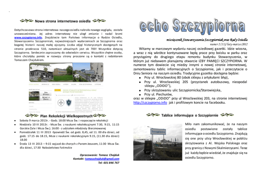 ` Nowa strona internetowa osiedla Dotychczasowa strona internetowa naszego osiedla nabrała nowego wyglądu, została unowocześniona. Jej adres internetowy nie uległ zmianie i nadal brzmi www.szczypiorno.info. Znajdziecie tam Paostwo informacje o Radzie Osiedla, Stowarzyszeniu Szczypiorniak, najważniejszych wydarzeniach ze Szczypiorna oraz bogatej historii naszej małej ojczyzny. Liczba zdjęd historycznych dostępnych na stronie przekracza 510, natomiast aktualnych jest ok 700! Wszystkie dotyczą Szczypiorna. Serdecznie zapraszamy do odwiedzin serwisu. Wszystkie chętne osoby, które chciałyby pomóc w rozwoju strony proszone są o kontakt z redaktorem Tomaszem Chajdukiem. Plan Rekolekcji Wielkopostnych Sobota 9 marca 2013r. - Godz. 18:00 Msza Św. i rozpoczęcie rekolekcji Niedziela 10 III 2013r. - Msze Św. z naukami rekolekcyjnymi 7:30, 9:15, 11:15 Gorzkie Żale i Msza Św.). 16:00 - z udziałem młodzieży Bierzmowanej Poniedziałek 11 III 2013 -Spowiedź Św. od godz. 8,45, od 11. 00 dla dzieci, od godz. 17.15 do 18.15, Msze z naukami rekolekcyjnym 9.15, (11.30 dla dzieci) 18.00 Środa 13 III 2013 – 9:15 wyjazd do chorych z Panem Jezusem, 11:30 Msza Św. dla dzieci, 17:30 Nabożeostwo Fatimskie Opracowanie: Tomasz Chajduk Kontakt: [email protected] Tel: 601 846 767 miesięcznik Stowarzyszenia Szczypiorniak oraz Rady Osiedla numer 2 (13)/ luty-marzec2012 Witamy w marcowym wydaniu naszej osiedlowej gazetki. Idzie wiosna, a wraz z nią wkrótce kontynuowane będą prace przy boisku w parku oraz przystąpimy do drugiego etapu remontu budynku Stowarzyszenia, w którym już niebawem planujemy otwarcie IZBY PAMIĘCI SZCZYPIORNA. W numerze tym dowiecie się miedzy innymi o nowej stronie internetowej, zamontowaniu tablic informacyjnych o Szczypiornie, jak i przeczytacie o Dniu Seniora na naszym osiedlu. Tradycyjnie gazetka dostępna będzie: Przy ul. Wrocławskiej 80 (obok sklepu z artykułami bhp), Przy ul. Wrocławskiej 205 (przystanek autobusowy, nieopodal sklepu „ODIDO”), Przy skrzyżowaniu ulic Szczypiornicka/Starowiejska, Przy ul. Piechurów, oraz w sklepie „ODiDO” przy ul Wrocławskiej 203, na stronie internetowej http://szczypiorno.info jak i profilowym koncie na facebooku. Tablice informujące o Szczypiornie Miło nam zakomunikowad, że na naszym osiedlu postawione zostały tablice informujące o osiedlu Szczypiorno. Znajdują się one przy ulicy Wrocławskiej w pobliżu skrzyżowania z Al. Wojska Polskiego oraz przy granicy z Nowymi Skalmierzycami. Teraz już każdy będzie wiedział, że znajduje się na osiedlu Szczypiorno. ` Dzieo seniora Drzwi otwarte w przedszkolu oraz szkole podst. Dnia 25 stycznia odbył się dzieo seniora zorganizowany przez Radę Osiedla Szczypiorno oraz Stowarzyszenie Szczypiorniak. Wydarzenie to, odbyło się w restauracji „Pod Karocą” przy ul. Wrocławskiej. W spotkaniu uczestniczyło ok 40 osób. O godzinie 16 przewodniczący Rady Osiedla Szczypiorno Pan Edward Prus otworzył spotkanie życząc zgromadzonym przede-wszystkim dużo zdrowia. Następnie zgromadzeni podziękowali za zorganizowane „Dnia Seniora”. Poczęstunek przygotowany przez Radę Osiedla oraz Stowarzyszenie obejmował początkowo owoce, ciasto, kawę i herbatę. Następnie przygotowano dla uczestników pizzę. W drugiej części spotkania zaprezentowano prezentacje multimedialną, która obejmowała stare zdjęcia dotyczące naszego osiedla wyświetlone na rzutniku multimedialnym. Wszystkim zgromadzonym, ta częśd programu bardzo się podobała i chyba każdy uczestnik odnalazł się na przynajmniej jednym zdjęciu. Pod koniec spotkania Pani Zofia Ozimek zaśpiewała piosenkę, która wymyślona została przed wojną, kiedy to w Szczypiornie była drużyna harcerska „Czarna Jedynka”. O godzinie 20 spotkanie się zakooczyło, zadowoleni zgromadzeni wyrazili nadzieje na powtórne spotkanie w przyszłym roku w jeszcze większym gronie. Poniżej prezentujemy kilka zdjęd ze spotkania, jednocześnie informując, że na stronie internetowej osiedla znajduje się ok Szkoła Podstawowa nr 21 oraz Publiczne Przedszkole nr 22 serdecznie zapraszają na drzwi otwarte, które odbędą się 14 marca 2013 roku. Dla przedszkola będzie to godzina 9:30 do 12:00 natomiast wszystkich zainteresowanych szkołą podstawową zapraszamy o godzinie 17:00. W ramach „drzwi otwartych” będzie możliwośd zwiedzenia placówki oraz zapoznania się z nauczycielami zatrudnionymi w szkole. 60 zdjęd z tego spotkania oraz 2 filmy. Dyrektor Szkoły Podstawowej nr 21 im. Legionów Józefa Piłsudskiego w Kaliszu, informuje o zapisach do klasy pierwszej szkoły podstawowej na rok szkolny 2013/2014. Zgłoszenia będą przyjmowane w sekretariacie szkoły w terminie od 1.03. do 29.03.2013 roku w godzinach od 8.00 do 15.30. Wymagane dokumenty: zgłoszenie elektroniczne potwierdzone wersją papierową z podpisem rodzica / opiekuna złożone w sekretariacie szkoły, kwestionariusz ucznia, kserokopia odpisu aktu urodzenia dziecka, 2 zdjęcia legitymacyjne. Nasyp kolejowy posprzątany Nasyp kolejowy na naszym osiedlu został oczyszczony. Wiązało się to z bezpieczeostwem podróżnych. Prace odbywały się na całym odcinku linii kolejowej. Wszelkie krzewy, które porastały nasyp zostały wycięte. Mamy tylko nadzieję że prace będą kontunowane, a co za tym idzie pozostałości wycinki zostaną uprzątnietę i wywiezione.