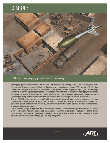 XM395 120mm precyzyjny granat moździerzowy Precyzyjny granat moździerzowy XM395 jest odpowiedzią na wymogi Armii USA na program APMI (Accelerated Precision Mortar Initiative). Opracowany i produkowany przez ATK granat XM 395 daje dowódcom rzeczywistą możliwość posiadania precyzyjnego środka artyleryjskiego ognia pośredniego. Umożliwia to szybką i precyzyjną reakcję, w szczególności w terenie górzystym i niedostępnym dla artylerii jak również w terenie zurbanizowanym, gdzie dowódca nie może skorzystać z konwencjonalnego wsparcia ogniowego z uwagi na możliwe nadmierne straty wśród ludności cywilnej i zniszczenia infrastruktury. Granat XM395 daje dowódcom możliwość prowadzenia precyzyjnego ognia pośredniego w celu obezwładnienia przeciwnika za wzgórzami, w wąskich wąwozach, terenie zróżnicowanym, trudnym do porażania ogniem bezpośrednim. Ponadto, umożliwia dowódcy zniszczenie celów z większą skutecznością i zmniejszoną ilością amunicji. Granat XM395 bazuje na systemie PGK do amunicji 155mm. Łączy w sobie naprowadzanie na podstawie GPS i sterowania lotkami. Zastępując standardowe zapalniki, przekształca klasyczny 120mm granat moździerzowy w amunicję precyzyjnego rażenia. To rozwiązanie zmniejsza czasochłonność i koszty związane z wprowadzeniem nowego typu amunicji precyzyjnej. www.atk.com Zespół stabilizatora Korpus Zespół zapalnika • Ładunek miotający Hi-Hat M47 – zwiększenie zasięgu • Składane tylne brzechwy – Zapewniają zwiększoną stabilność w czasie lotu • Standardowy korpus granatu M9933/34 • Zapalnik z zespołem precyzyjnego naprowadzania – interfejs EPIAFS – łatwy sposób montażu Zestaw precyzyjnego naprowadzania 120mm granatu Zestaw precyzyjnego naprowadzania120mm granatu Możliwości Charakterystyka • • • Kompatybilny ze wszystkimi systemami 120mm moździerzy Zapewnia możliwość naprowadzania precyzyjnego dla istniejących M933/934 granatów moździerzowych Wykorzystuje zaawansowane technologie • • • • • Informacji udziela : Zapewnia potrzebną precyzję przy zmieniających się warunkach operacyjnych Zwiększa możliwości systemu moździerzowego do precyzyjnego rażenia celów w polu martwym Minimalizuje niepożądane ofiary i zniszczenia Odporny na wysokie przeciążenia podczas strzelania Idealny do neutralizowania celów za wzgórzami, w wąskich wąwozach, terenie zróżnicowanym, trudnym do porażania ogniem bezpośrednim ATK Armament Systems 4700 Nathan Lane Plymouth, MN 55442 Tel 763-744-5312 email: [email protected] 108747_01 Approved For Public Release. PAO# 92-10, 11/19/2009 www.atk.com