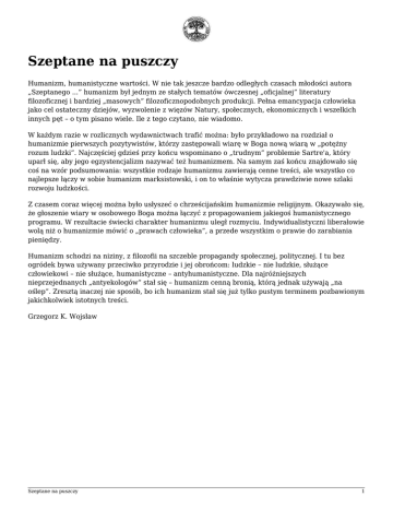 Szeptane na puszczy Humanizm, humanistyczne wartości. W nie tak jeszcze bardzo odległych czasach młodości autora „Szeptanego ...” humanizm był jednym ze stałych tematów ówczesnej „oficjalnej” literatury filozoficznej i bardziej „masowych” filozoficznopodobnych produkcji. Pełna emancypacja człowieka jako cel ostateczny dziejów, wyzwolenie z więzów Natury, społecznych, ekonomicznych i wszelkich innych pęt – o tym pisano wiele. Ile z tego czytano, nie wiadomo. W każdym razie w rozlicznych wydawnictwach trafić można: było przykładowo na rozdział o humanizmie pierwszych pozytywistów, którzy zastępowali wiarę w Boga nową wiarą w „potężny rozum ludzki”. Najczęściej gdzieś przy końcu wspominano o „trudnym” problemie Sartre'a, który uparł się, aby jego egzystencjalizm nazywać też humanizmem. Na samym zaś końcu znajdowało się coś na wzór podsumowania: wszystkie rodzaje humanizmu zawierają cenne treści, ale wszystko co najlepsze łączy w sobie humanizm marksistowski, i on to właśnie wytycza prawdziwie nowe szlaki rozwoju ludzkości. Z czasem coraz więcej można było usłyszeć o chrześcijańskim humanizmie religijnym. Okazywało się, że głoszenie wiary w osobowego Boga można łączyć z propagowaniem jakiegoś humanistycznego programu. W rezultacie świecki charakter humanizmu uległ rozmyciu. Indywidualistyczni liberałowie wolą niż o humanizmie mówić o „prawach człowieka”, a przede wszystkim o prawie do zarabiania pieniędzy. Humanizm schodzi na niziny, z filozofii na szczeble propagandy społecznej, politycznej. I tu bez ogródek bywa używany przeciwko przyrodzie i jej obrońcom: ludzkie – nie ludzkie, służące człowiekowi – nie służące, humanistyczne – antyhumanistyczne. Dla najróżniejszych nieprzejednanych „antyekologów” stał się – humanizm cenną bronią, którą jednak używają „na oślep”. Zresztą inaczej nie sposób, bo ich humanizm stał się już tylko pustym terminem pozbawionym jakichkolwiek istotnych treści. Grzegorz K. Wojsław Szeptane na puszczy 1