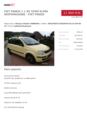 FIAT PANDA 1.1 8V 55KM KLIMA WSPOMAGANIE - FIAT PANDA 11 900 PLN cena BRUTTO Miejscowość: Olszyny Okolice TARNOWA | Telefon: 502103619 518163670 lub 14 678 96 74 | Email: [email protected] 2006 rok 122 000 km Benzyna 55KM (40KW) Używany 19-10-2016 Opis pojazdu auto komis olszyny (pomiÄ™dzy wojniczem a zakliczynem) 32-831 Olszyny 192 okolice tarnowa woj.maÅ‚opolskie pow.tarnowski czynne pon-pt 9-18 sobota 9-16 niedziela 13-16 Tel: 502103619 andrzej Tel; 518163670 Å‚ukasz Codziennie w ofercie ponad 80 aut na placu udzielamy kredyty samochodowe, decyzja o kredycie w ciÄ…gu 3 godzin !!! kredyty i leasingi grzegorz getin bank Tel;605663366 przygotowujemy wszystkie formalnoÅ›ci potrzebne do rejestracji !!! udostÄ™pniamy podnoÅ›nik ,kanaÅ‚ oraz istnieje możliwość sprawdzenia samochodu na stacji diagnostycznej!!! przed przyjazdem prosimy o kontakt telefoniczny w celu potwierdzenia aktualnoÅ›ci oferty !!! wystawiamy fakture VAT-marża kupujÄ…cy zwolniony z podatku 2% Wszystkie auta sÄ… opÅ‚acone-gotowe do rejestracji. powyższy opis nie stanowi w rozumieniu prawa oferty handlowej, jest jedynie treÅ›ciÄ… informacyjnÄ… w myÅ›l art. 66, § 1. kodeksu cywilnego. sprzedajÄ…cy nie odpowiada za ewentualne błędy lub nieaktualność ogÅ‚oszenia. - I wÅ‚aÅ›ciciel - serwisowany - welurowa tapicerka - ABS - alarm - centr. zamek - el. szyby - immobiliser - klimatyzacja automatyczna - poduszki - radio z CD - wsp. kierownicy