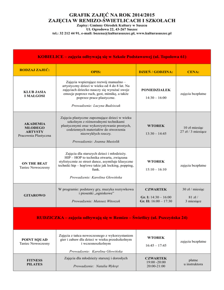 GRAFIK ZAJĘĆ NA ROK 2014/2015 ZAJĘCIA W REMIZO-ŚWIETLICACH I SZKOŁACH Zapisy: Gminny Ośrodek Kultury w Suszcu Ul. Ogrodowa 22, 43-267 Suszec tel.: 32 212 44 91, e-mail: [email protected], www.kulturasuszec.pl KOBIELICE – zajęcia odbywają się w Szkole Podstawowej (ul. Topolowa 61) RODZAJ ZAJEĆ: KLUB JASIA I MAŁGOSI OPIS: DZIEŃ / GODZINA: Zajęcia wspierające rozwój manualno – artystyczny dzieci w wieku od 4 do 8 lat. Na zajęciach dziecko nauczy się wyrażać swoje emocje poprzez ruch, gest, mimikę, a także poprzez prace plastyczne. PONIEDZIAŁEK CENA: zajęcia bezpłatne 14:30 – 16:00 Prowadzenie: Lucyna Budziszak AKADEMIA MŁODEGO ARTYSTY Pracownia Plastyczna Zajęcia plastyczne zapoznające dzieci w wieku szkolnym z różnorodnymi technikami plastycznymi oraz wykorzystywanie prostych, codziennych materiałów do stworzenia niezwykłych rzeczy. WTOREK 13:30 – 14:45 10 zł miesiąc 27 zł / 3 miesiące Prowadzenie: Joanna Musiolik ON THE BEAT Taniec Nowoczesny Zajęcia dla starszych dzieci i młodzieży. HIP – HOP to technika otwarta, związana stylistycznie ze street dance, asymiluje klasyczne techniki hip – hop'owe takie jak locking, popping, funk. WTOREK zajęcia bezpłatne 15:10 – 16:10 Prowadzenie: Karolina Głowińska GITAROWO W programie: podstawy gry, muzyka rozrywkowa i piosenki „ogniskowe” Prowadzenie: Mateusz Witoszek CZWARTEK 30 zł / miesiąc Gr. I: 14:30 – 16:00 Gr. II: 16:00 – 17:30 81 zł / 3 miesiące RUDZICZKA – zajęcia odbywają się w Remizo – Świetlicy (ul. Pszczyńska 24) POINT SQUAD Taniec Nowoczesny Zajęcia z tańca nowoczesnego z wykorzystaniem gier i zabaw dla dzieci w wieku przedszkolnym i wczesnoszkolnym WTOREK zajęcia bezpłatne 16:45 – 17:45 Prowadzenie: Karolina Głowińska FITNESS PILATES Zajęcia dla młodzieży starszej i dorosłych Prowadzenie: Natalia Wykręt CZWARTEK 19:00 -20:00 20:00-21:00 płatne u instruktora GRAFIK ZAJĘĆ NA ROK 2014/2015 ZAJĘCIA W REMIZO-ŚWIETLICACH I SZKOŁACH Zapisy: Gminny Ośrodek Kultury w Suszcu Ul. Ogrodowa 22, 43-267 Suszec tel.: 32 212 44 91, e-mail: [email protected], www.kulturasuszec.pl KLUB JASIA I MAŁGOSI Zajęcia wspierające rozwój manualno – artystyczny dzieci w wieku od 4 do 8 lat. Na zajęciach dziecko nauczy się wyrażać swoje emocje poprzez ruch, gest, mimikę, a także poprzez prace plastyczne. PIĄTEK zajęcia bezpłatne 15:00 – 16:30 prowadzi: Lucyna Budziszak RADOSTOWICE - zajęcia odbywają się w Szkole Podstawowej (ul. Dworcowa 56) i Gimnazjum (ul. Dworcowa 56) AKADEMIA MŁODEGO ARTYSTY Pracownia Plastyczna Zajęcia plastyczne zapoznające dzieci w wieku szkolnym z różnorodnymi technikami plastycznymi oraz wykorzystywanie prostych, codziennych materiałów do stworzenia niezwykłych rzeczy. WTOREK SP Radostowice 15:00 – 16:30 10 zł miesiąc 27 zł / 3 miesiące Prowadzenie: Joanna Musiolik ZUMBA Zumba dla młodzieży i dorosłych to fuzja tańca i aerobiku zainspirowana latynoskimi rytmami. Jest to innowacyjny system fitness kształtujący sylwetkę, poprawiający kondycję, wyzwalający potężne dawki pozytywnej energii. WTOREK GP Radostowice 18:00-19:00 15 zł / spotkanie 45 zł / miesiąc Prowadzenie: Marzena Simańska MODELARSTWO Uczestnicy warsztatów modelarstwa lotniczego będą projektować, konstruować i pilotować swoje modele stworzone podczas zajęć. Kurs jest przeznaczony głównie dla młodzieży szkolnej i gimnazjalnej. ŚRODA GP Radostowice 16:00-18:00 40 zł / miesiąc 108 zł / 3 miesiące Powadzenie: Jan Pietrzykowski REGIONALNY ZESPÓŁ SPIEWACZY RADOSTOWIANKI ŚRODA Prowadzenie: Jadwiga Masny zajęcia bezpłatne 17:00 MIZERÓW – zajęcia odbywają się w Remizo – Świetlicy (ul. Wyzwolenia 279) JUMP CREW / FREESMILE Taniec nowoczesny Zajęcia dla starszych dzieci i młodzieży. HIP – HOP to technika otwarta, związana stylistycznie ze street dance, asymiluje klasyczne techniki hip – hop'owe takie jak locking, popping, funk. Prowadzenie: Karolina Głowińska PONIEDZIAŁEK Gr I: 18:00 – 19:00 Gr. II: 19:00 – 20:00 zajęcia bezpłatne GRAFIK ZAJĘĆ NA ROK 2014/2015 ZAJĘCIA W REMIZO-ŚWIETLICACH I SZKOŁACH Zapisy: Gminny Ośrodek Kultury w Suszcu Ul. Ogrodowa 22, 43-267 Suszec tel.: 32 212 44 91, e-mail: [email protected], www.kulturasuszec.pl DISCO ROBACZKI Taniec nowoczesny Zajęcia z tańca nowoczesnego z wykorzystaniem gier i zabaw dla dzieci w wieku wczesnoszkolnym i przedszkolnym WTOREK Gr I: 17:15 – 18:00 Gr. II: 18:00 – 18:45 zajęcia bezpłatne Prowadzenie: Anna Kiermaszek ZESPÓŁ ŚPIEWACZY MIZEROWIANIE KLUB JASIA I MAŁGOSI Próba zespołu Prowadzenie: Halina Gryszko Zajęcia wspierające rozwój manualno – artystyczny dzieci w wieku od 4 do 8 lat. Na zajęciach dziecko nauczy się wyrażać swoje emocje poprzez ruch, gest, mimikę, a także poprzez prace plastyczne. WTOREK 20:00 zajęcia bezpłatne ŚRODA zajęcia bezpłatne 15:00 – 16:30 Prowadzenie: Lucyna Budziszak JĘZYK ANGIELSKI DLA DZIECI Zajęcia dla dzieci w wieku od 5 do 10 lat, opierające się na zabawie, grach słownych i językowych, a także na naturalnej umiejętności dzieci do przyswajania nowych rzeczy. ŚRODA Gr. I: 5-6 lat: 16:3017:15 Gr. II: 7-9 lat: 17:3018:15 30 zł / miesiąc Zajęcia dla młodzieży i dorosłych. ŚRODA Prowadzenie: Natalia Wykręt 19:00 – 20:00 płatne u instruktora Zajęcia plastyczne zapoznające dzieci w wieku szkolnym z różnorodnymi technikami plastycznymi oraz wykorzystywanie prostych, codziennych materiałów do stworzenia niezwykłych rzeczy. CZWARTEK 81 zł / 3 miesiące Prowadzenie: Anna Urynowicz PILATES AKADEMIA MŁODEGO ARTYSTY Pracownia Plastyczna 10 zł miesiąc 15:00 – 16:30 27 zł / 3 miesiące CZWARTEK 60 zł / miesiąc Gr. I: 17:00 – 18:30 Gr. II: 18:30 – 20:00 162 zł / 3 miesiące Prowadzenie: Joanna Musiolik Zajęcia z j. rosyjskiego w małych grupach i przyjaznej atmosferze dla początkujących. JĘZYK ROSYJSKI Grupa I – początkująca Grupa II – średni