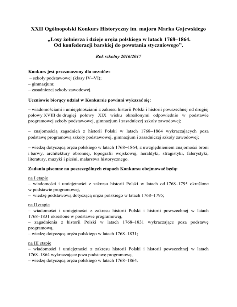 XXII Ogólnopolski Konkurs Historyczny im. majora Marka Gajewskiego „Losy żołnierza i dzieje oręża polskiego w latach 1768–1864. Od konfederacji barskiej do powstania styczniowego”. Rok szkolny 2016/2017 Konkurs jest przeznaczony dla uczniów: – szkoły podstawowej (klasy IV–VI); – gimnazjum; – zasadniczej szkoły zawodowej. Uczniowie biorący udział w Konkursie powinni wykazać się: – wiadomościami i umiejętnościami z zakresu historii Polski i historii powszechnej od drugiej połowy XVIII do drugiej połowy XIX wieku określonymi odpowiednio w podstawie programowej szkoły podstawowej, gimnazjum i zasadniczej szkoły zawodowej; – znajomością zagadnień z historii Polski w latach 1768–1864 wykraczających poza podstawę programową szkoły podstawowej, gimnazjum i zasadniczej szkoły zawodowej; – wiedzą dotyczącą oręża polskiego w latach 1768–1864, z uwzględnieniem znajomości broni i barwy, architektury obronnej, topografii wojskowej, heraldyki, sfragistyki, falerystyki, literatury, muzyki i pieśni, malarstwa historycznego. Zadania pisemne na poszczególnych etapach Konkursu obejmować będą: na I etapie – wiadomości i umiejętności z zakresu historii Polski w latach od 1768–1795 określone w podstawie programowej, – wiedzę podstawową dotyczącą oręża polskiego w latach 1768–1795; na II etapie – wiadomości i umiejętności z zakresu historii Polski i historii powszechnej w latach 1768–1831 określone w podstawie programowej, – zagadnienia z historii Polski w latach 1768–1831 wykraczające poza podstawę programową, – wiedzę dotyczącą oręża polskiego w latach 1768–1831; na III etapie – wiadomości i umiejętności z zakresu historii Polski i historii powszechnej w latach 1768–1864 wykraczające poza podstawę programową, – wiedzę dotyczącą oręża polskiego w latach 1768–1864. Zalecana literatura Atlas historii Polski. Mapy, komentarze, Warszawa 2000. Encyklopedia szkolna. Historia, Warszawa 1993. Chwalba A., Historia Polski 1795–1918, Kraków 2007. Jasienica P., Rzeczpospolita Obojga Narodów, część III Dzieje agonii, Warszawa 1997. Kobyliński, S. Gawędy o broni i mundurze, Warszawa 1984. Nowak T., Wimmer J., Historia oręża polskiego 963–1795, Warszawa 1981. Samsonowicz H., Historia Polski do roku 1795, Warszawa 1990. Kieniewicz S., Historia Polski 1795-1918, Warszawa 1997. Wacholc M., Śpiewnik polski. Wybór pieśni, Warszawa 1995. Wielki atlas historyczny, Warszawa 2002. Wołek J., Dzieje Polski w malarstwie i poezji, Warszawa 1991. Seria wydawnicza Dzieje narodu i państwa polskiego: Zielińska Z., Ostatnie lata Pierwszej Rzeczypospolitej, III–41, Warszawa 1986. Grodzicki S., Kozłowski E., Polska zniewolona 1795–1806, III–42, Warszawa 1987. Grochulska B., Małe państwo wielkich nadziei, III–43, Warszawa 1987. Skowronek J., Od Kongresu Wiedeńskiego do Nocy Listopadowej, III–44, Warszawa 1987. Łepkowski T., Powstanie Listopadowe, III–45, Warszawa 1987. Zdrada J., Wielka Emigracja po Powstaniu Listopadowym, III–46, Warszawa 1987. Skowronek J., Od konspiracji do kapitulacji, III–47, Warszawa 1989. Zgórniak M., Za Waszą i naszą wolność, III–48, Warszawa 1987. Kieniewicz S., Powstanie Styczniowe, III–49, Warszawa 1987. Łukasiewicz J., Początki cywilizacji przemysłowej na ziemiach polskich, III–50, Warszawa 1988. Zapraszamy i życzymy powodzenia. Organizatorzy Konkursu
