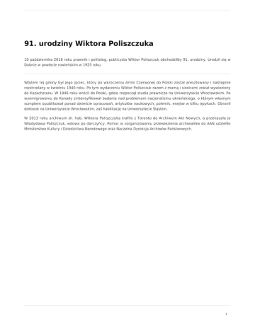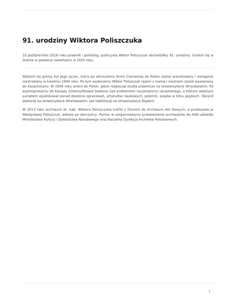 91. urodziny Wiktora Poliszczuka 10 października 2016 roku prawnik i politolog, publicysta Wiktor Poliszczuk obchodziłby 91. urodziny. Urodził się w Dubnie w powiecie rowieńskim w 1925 roku. Wójtem tej gminy był jego ojciec, który po wkroczeniu Armii Czerwonej do Polski został aresztowany i następnie rozstrzelany w kwietniu 1940 roku. Po tym wydarzeniu Wiktor Poliszczuk razem z mamą i siostrami został wywieziony do Kazachstanu. W 1946 roku wrócił do Polski, gdzie rozpoczął studia prawnicze na Uniwersytecie Wrocławskim. Po wyemigrowaniu do Kanady zintensyfikował badania nad problemem nacjonalizmu ukraińskiego, o którym własnym sumptem opublikował ponad dwieście opracowań, artykułów naukowych, polemik, esejów w kilku językach. Obronił doktorat na Uniwersytecie Wrocławskim, zaś habilitację na Uniwersytecie Śląskim. W 2013 roku archiwum dr. hab. Wiktora Poliszczuka trafiło z Toronto do Archiwum Akt Nowych, a przekazała je Władysława Poliszczuk, wdowa po darczyńcy. Pomoc w zorganizowaniu przewiezienia archiwaliów do AAN udzieliło Ministerstwo Kultury i Dziedzictwa Narodowego oraz Naczelna Dyrekcja Archiwów Państwowych. 1