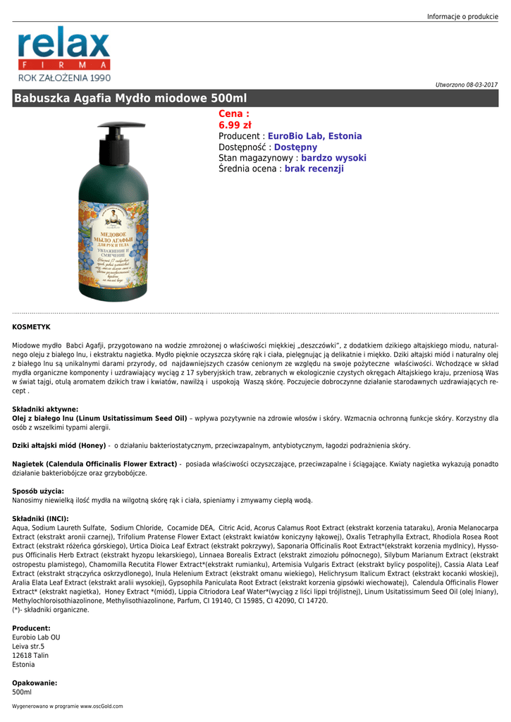 Informacje o produkcie Utworzono 08-03-2017 Babuszka Agafia Mydło miodowe 500ml Cena : 6.99 zł Producent : EuroBio Lab, Estonia Dostępność : Dostępny Stan magazynowy : bardzo wysoki Średnia ocena : brak recenzji KOSMETYK Miodowe mydło Babci Agafji, przygotowano na wodzie zmrożonej o właściwości miękkiej „deszczówki”, z dodatkiem dzikiego ałtajskiego miodu, naturalnego oleju z białego lnu, i ekstraktu nagietka. Mydło pięknie oczyszcza skórę rąk i ciała, pielęgnując ją delikatnie i miękko. Dziki ałtajski miód i naturalny olej z białego lnu są unikalnymi darami przyrody, od najdawniejszych czasów cenionym ze względu na swoje pożyteczne właściwości. Wchodzące w skład mydła organiczne komponenty i uzdrawiający wyciąg z 17 syberyjskich traw, zebranych w ekologicznie czystych okręgach Ałtajskiego kraju, przeniosą Was w świat tajgi, otulą aromatem dzikich traw i kwiatów, nawilżą i uspokoją Waszą skórę. Poczujecie dobroczynne działanie starodawnych uzdrawiających recept . Składniki aktywne: Olej z białego lnu (Linum Usitatissimum Seed Oil) – wpływa pozytywnie na zdrowie włosów i skóry. Wzmacnia ochronną funkcje skóry. Korzystny dla osób z wszelkimi typami alergii. Dziki ałtajski miód (Honey) - o działaniu bakteriostatycznym, przeciwzapalnym, antybiotycznym, łagodzi podrażnienia skóry. Nagietek (Calendula Officinalis Flower Extract) - posiada właściwości oczyszczające, przeciwzapalne i ściągające. Kwiaty nagietka wykazują ponadto działanie bakteriobójcze oraz grzybobójcze. Sposób użycia: Nanosimy niewielką ilość mydła na wilgotną skórę rąk i ciała, spieniamy i zmywamy ciepłą wodą. Składniki (INCI): Aqua, Sodium Laureth Sulfate, Sodium Chloride, Cocamide DEA, Citric Acid, Acorus Calamus Root Extract (ekstrakt korzenia tataraku), Aronia Melanocarpa Extract (ekstrakt aronii czarnej), Trifolium Pratense Flower Extact (ekstrakt kwiatów koniczyny łąkowej), Oxalis Tetraphylla Extract, Rhodiola Rosea Root Extract (ekstrakt różeńca górskiego), Urtica Dioica Leaf Extract (ekstrakt pokrzywy), Saponaria Officinalis Root Extract*(ekstrakt korzenia mydlnicy), Hyssopus Officinalis Herb Extract (ekstrakt hyzopu lekarskiego), Linnaea Borealis Extract (ekstrakt zimoziołu północnego), Silybum Marianum Extract (ekstrakt ostropestu plamistego), Chamomilla Recutita Flower Extract*(ekstrakt rumianku), Artemisia Vulgaris Extract (ekstrakt bylicy pospolitej), Cassia Alata Leaf Extract (ekstrakt strączyńca oskrzydlonego), Inula Helenium Extract (ekstrakt omanu wiekiego), Helichrysum Italicum Extract (ekstrakt kocanki włoskiej), Aralia Elata Leaf Extract (ekstrakt aralii wysokiej), Gypsophila Paniculata Root Extract (ekstrakt korzenia gipsówki wiechowatej), Calendula Officinalis Flower Extract* (ekstrakt nagietka), Honey Extract *(miód), Lippia Citriodora Leaf Water*(wyciąg z liści lippi trójlistnej), Linum Usitatissimum Seed Oil (olej lniany), Methylochloroisothiazolinone, Methylisothiazolinone, Parfum, CI 19140, CI 15985, CI 42090, CI 14720. (*)- składniki organiczne. Producent: Eurobio Lab OU Leiva str.5 12618 Talin Estonia Opakowanie: 500ml Wygenerowano w programie www.oscGold.com