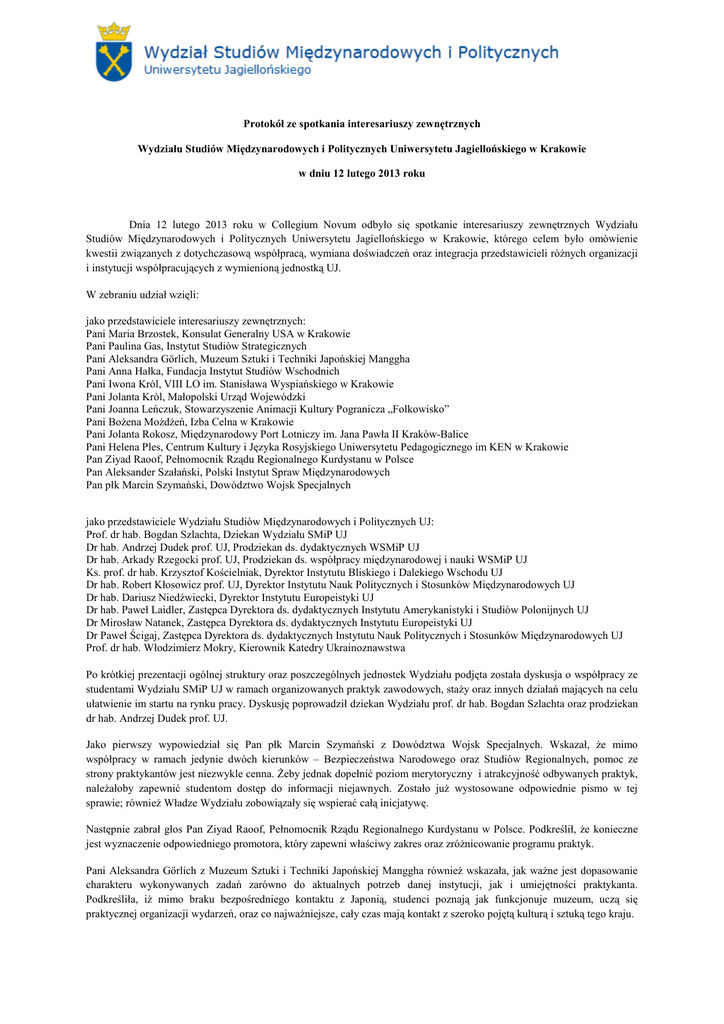 Protokół ze spotkania interesariuszy zewnętrznych Wydziału Studiów Międzynarodowych i Politycznych Uniwersytetu Jagiellońskiego w Krakowie w dniu 12 lutego 2013 roku Dnia 12 lutego 2013 roku w Collegium Novum odbyło się spotkanie interesariuszy zewnętrznych Wydziału Studiów Międzynarodowych i Politycznych Uniwersytetu Jagiellońskiego w Krakowie, którego celem było omówienie kwestii związanych z dotychczasową współpracą, wymiana doświadczeń oraz integracja przedstawicieli różnych organizacji i instytucji współpracujących z wymienioną jednostką UJ. W zebraniu udział wzięli: jako przedstawiciele interesariuszy zewnętrznych: Pani Maria Brzostek, Konsulat Generalny USA w Krakowie Pani Paulina Gas, Instytut Studiów Strategicznych Pani Aleksandra Görlich, Muzeum Sztuki i Techniki Japońskiej Manggha Pani Anna Hałka, Fundacja Instytut Studiów Wschodnich Pani Iwona Król, VIII LO im. Stanisława Wyspiańskiego w Krakowie Pani Jolanta Król, Małopolski Urząd Wojewódzki Pani Joanna Leńczuk, Stowarzyszenie Animacji Kultury Pogranicza „Folkowisko” Pani Bożena Możdżeń, Izba Celna w Krakowie Pani Jolanta Rokosz, Międzynarodowy Port Lotniczy im. Jana Pawła II Kraków-Balice Pani Helena Ples, Centrum Kultury i Języka Rosyjskiego Uniwersytetu Pedagogicznego im KEN w Krakowie Pan Ziyad Raoof, Pełnomocnik Rządu Regionalnego Kurdystanu w Polsce Pan Aleksander Szałański, Polski Instytut Spraw Międzynarodowych Pan płk Marcin Szymański, Dowództwo Wojsk Specjalnych jako przedstawiciele Wydziału Studiów Międzynarodowych i Politycznych UJ: Prof. dr hab. Bogdan Szlachta, Dziekan Wydziału SMiP UJ Dr hab. Andrzej Dudek prof. UJ, Prodziekan ds. dydaktycznych WSMiP UJ Dr hab. Arkady Rzegocki prof. UJ, Prodziekan ds. współpracy międzynarodowej i nauki WSMiP UJ Ks. prof. dr hab. Krzysztof Kościelniak, Dyrektor Instytutu Bliskiego i Dalekiego Wschodu UJ Dr hab. Robert Kłosowicz prof. UJ, Dyrektor Instytutu Nauk Politycznych i Stosunków Międzynarodowych UJ Dr hab. Dariusz Niedźwiecki, Dyrektor Instytutu Europeistyki UJ Dr hab. Paweł Laidler, Zastępca Dyrektora ds. dydaktycznych Instytutu Amerykanistyki i Studiów Polonijnych UJ Dr Mirosław Natanek, Zastępca Dyrektora ds. dydaktycznych Instytutu Europeistyki UJ Dr Paweł Ścigaj, Zastępca Dyrektora ds. dydaktycznych Instytutu Nauk Politycznych i Stosunków Międzynarodowych UJ Prof. dr hab. Włodzimierz Mokry, Kierownik Katedry Ukrainoznawstwa Po krótkiej prezentacji ogólnej struktury oraz poszczególnych jednostek Wydziału podjęta została dyskusja o współpracy ze studentami Wydziału SMiP UJ w ramach organizowanych praktyk zawodowych, staży oraz innych działań mających na celu ułatwienie im startu na rynku pracy. Dyskusję poprowadził dziekan Wydziału prof. dr hab. Bogdan Szlachta oraz prodziekan dr hab. Andrzej Dudek prof. UJ. Jako pierwszy wypowiedział się Pan płk Marcin Szymański z Dowództwa Wojsk Specjalnych. Wskazał, że mimo współpracy w ramach jedynie dwóch kierunków – Bezpieczeństwa Narodowego oraz Studiów Regionalnych, pomoc ze strony praktykantów jest niezwykle cenna. Żeby jednak dopełnić poziom merytoryczny i atrakcyjność odbywanych praktyk, należałoby zapewnić studentom dostęp do informacji niejawnych. Zostało już wystosowane odpowiednie pismo w tej sprawie; również Władze Wydziału zobowiązały się wspierać całą inicjatywę. Następnie zabrał głos Pan Ziyad Raoof, Pełnomocnik Rządu Regionalnego Kurdystanu w Polsce. Podkreślił, że konieczne jest wyznaczenie odpowiedniego promotora, który zapewni właściwy zakres oraz zróżnicowanie programu praktyk. Pani Aleksandra Görlich z Muzeum Sztuki i Techniki Japońskiej Manggha również wskazała, jak ważne jest dopasowanie charakteru wykonywanych zadań zarówno do aktualnych potrzeb danej instytucji, jak i umiejętności praktykanta. Podkreśliła, iż mimo braku bezpośredniego kontaktu z Japonią, studenci poznają jak funkcjonuje muzeum, uczą się praktycznej organizacji wydarzeń, oraz co najważniejsze, cały czas mają kontakt z szeroko pojętą kulturą i sztuką tego kraju. To jak dużą rolę odgrywają zainteresowania studenta oraz chęć do aktywnego udziału w bieżących działaniach danej organizacji, potwierdziła wypowiedź Pani Joanny Leńczuk ze Stowarzyszenia Animacji Kultury Pogranicze „Folkowisko”. Opowiedziała o niezwykle pozytywnych doświadczeniach ze studentami ukrainoznawstwa, którzy w ramach praktyk pomagali przy organizacji Festiwalu Kultury Pogranicza Folkowisko. Pani Jolanta Rokosz z Krakow Airport równie entuzjastycznie odniosła się do swojej współpracy ze studentami, którzy realizowali specjalistyczny program praktyk kończący się opracowaniem własnego projektu na dowolny temat związany z lotnictwem. Zaznaczyła, jak ważne jest rozwijanie miękkich umiejętności, takich jak etykieta biznesowa czy też efektywna komunikacja z pasażerami i załogą. Podkreśliła, że struktury lotnictwa wciąż poszerzają się o nowe systemy i standardy usługowe, a tym samym tworzy się wiele nowych miejsc pracy dla najlepszych studentów nie tylko kierunków ścisłych lecz także humanistycznych. Temat przyszłej kariery zawodowej praktykantów poruszył również Pan Aleksander Szałański z Polskiego Instytutu Spraw Zagranicznych. Nawiązał on do problemu, jaki może stanowić brak wynagrodzenia za odbywane praktyki. Zasugerował, że doskonałym rozwiązaniem jest sytuacja, kiedy studenci sami zgłaszają się z gotowymi pomysłami na zrealizowanie projektu. W takim wypadku, opracowanie merytoryczne i koordynacja poszczególnych zadań jest realizowana w ramach praktyk, natomiast wynagrodzenie za włożoną pracę zawiera się w budżecie danego projektu. Kolejną ważną kwestą, jaka została poruszona w toku dyskusji, jest konieczność podnoszenia zdolności interpersonalnych oraz organizacyjnych studentów. Zarówno Pani Maria Brzostek