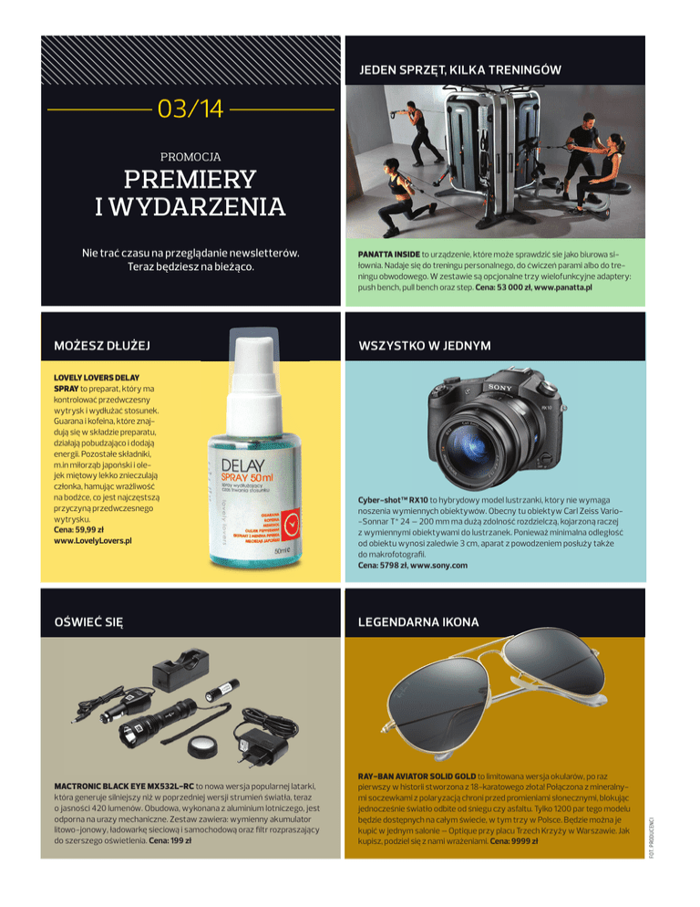 JEDEN SPRZĘT, KILKA TRENINGÓW 03/14 PROMOCJA PREMIERY I WYDARZENIA MOŻESZ DŁUŻEJ LOVELY LOVERS DELAY SPRAY to preparat, który ma kontrolować przedwczesny wytrysk i wydłużać stosunek. Guarana i kofeina, które znajdują się w składzie preparatu, działają pobudzająco i dodają energii. Pozostałe składniki, m.in miłorząb japoński i olejek miętowy lekko znieczulają członka, hamując wrażliwość na bodźce, co jest najczęstszą przyczyną przedwczesnego wytrysku. Cena: 59,99 zł www.LovelyLovers.pl PANATTA INSIDE to urządzenie, które może sprawdzić sie jako biurowa siłownia. Nadaje się do treningu personalnego, do ćwiczeń parami albo do treningu obwodowego. W zestawie są opcjonalne trzy wielofunkcyjne adaptery: push bench, pull bench oraz step. Cena: 53 000 zł, www.panatta.pl WSZYSTKO W JEDNYM Cyber-shot™ RX10 0 to h hybrydowy b d model d l llustrzanki, k k który nie wymaga noszenia wymiennych obiektywów. Obecny tu obiektyw Carl Zeiss Vario-Sonnar T* 24 – 200 mm ma dużą zdolność rozdzielczą, kojarzoną raczej z wymiennymi obiektywami do lustrzanek. Ponieważ minimalna odległość od obiektu wynosi zaledwie 3 cm, aparat z powodzeniem posłuży także do makrofotografii. Cena: 5798 zł, www.sony.com OŚWIEĆ SIĘ LEGENDARNA IKONA MACTRONIC BLACK EYE MX532L-RC to nowa wersja popularnej latarki, która generuje silniejszy niż w poprzedniej wersji strumień światła, teraz o jasności 420 lumenów. Obudowa, wykonana z aluminium lotniczego, jest odporna na urazy mechaniczne. Zestaw zawiera: wymienny akumulator litowo-jonowy, ładowarkę sieciową i samochodową oraz filtr rozpraszający do szerszego oświetlenia. Cena: 199 zł RAY-BAN AVIATOR SOLID GOLD to limitowana wersja okularów, po raz pierwszy w historii stworzona z 18-karatowego złota! Połączona z mineralnymi soczewkami z polaryzacją chroni przed promieniami słonecznymi, blokując jednocześnie światło odbite od śniegu czy asfaltu. Tylko 1200 par tego modelu będzie dostępnych na całym świecie, w tym trzy w Polsce. Będzie można je kupić w jednym salonie – Optique przy placu Trzech Krzyży w Warszawie. Jak kupisz, podziel się z nami wrażeniami. Cena: 9999 zł FOT. PRODUCENCI Nie trać czasu na przeglądanie newsletterów. Teraz będziesz na bieżąco.