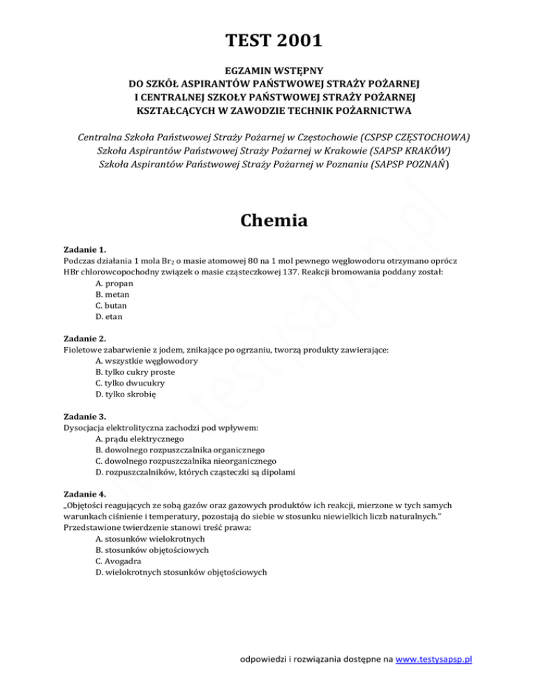TEST 2001 EGZAMIN WSTĘPNY DO SZKÓŁ ASPIRANTÓW PAŃSTWOWEJ STRAŻY POŻARNEJ I CENTRALNEJ SZKOŁY PAŃSTWOWEJ STRAŻY POŻARNEJ KSZTAŁCĄCYCH W ZAWODZIE TECHNIK POŻARNICTWA Centralna Szkoła Państwowej Straży Pożarnej w Częstochowie (CSPSP CZĘSTOCHOWA) Szkoła Aspirantów Państwowej Straży Pożarnej w Krakowie (SAPSP KRAKÓW) Szkoła Aspirantów Państwowej Straży Pożarnej w Poznaniu (SAPSP POZNAŃ) Chemia Zadanie 1. Podczas działania 1 mola Br2 o masie atomowej 80 na 1 mol pewnego węglowodoru otrzymano oprócz HBr chlorowcopochodny związek o masie cząsteczkowej 137. Reakcji bromowania poddany został: A. propan B. metan C. butan D. etan Zadanie 2. Fioletowe zabarwienie z jodem, znikające po ogrzaniu, tworzą produkty zawierające: A. wszystkie węglowodory B. tylko cukry proste C. tylko dwucukry D. tylko skrobię Zadanie 3. Dysocjacja elektrolityczna zachodzi pod wpływem: A. prądu elektrycznego B. dowolnego rozpuszczalnika organicznego C. dowolnego rozpuszczalnika nieorganicznego D. rozpuszczalników, których cząsteczki są dipolami Zadanie 4. „Objętości reagujących ze sobą gazów oraz gazowych produktów ich reakcji, mierzone w tych samych warunkach ciśnienie i temperatury, pozostają do siebie w stosunku niewielkich liczb naturalnych.” Przedstawione twierdzenie stanowi treść prawa: A. stosunków wielokrotnych B. stosunków objętościowych C. Avogadra D. wielokrotnych stosunków objętościowych odpowiedzi i rozwiązania dostępne na www.testysapsp.pl Zadanie 5. Proces twardnienia zaprawy wapiennej przebiega tym szybciej im jest: A. mniejsze stężenie pary wodnej w powietrzu B. większe stężenie dwutlenku węgla w powietrzu C. . większe stężenie pary wodnej w powietrzu D. mniejsze stężenie dwutlenku węgla w powietrzu Zadanie 6. Rozpuszczalność gazów w cieczach: A. rośnie ze wzrostem temperatury i ciśnienia B. maleje ze wzrostem ciśnienia i temperatury C. maleje ze wzrostem temperatury, ale wzrasta ze wzrostem ciśnienia D. rośnie ze wzrostem temperatury, ale maleje ze wzrostem ciśnienia Zadanie 7. Reakcje egzoenergetyczne, to: A. reakcje chemiczne, którym towarzyszy przekazywanie energii z otoczenia do układu B. reakcje, w których z jednego substratu powstaje dwa lub więcej produktów C. reakcje, którym towarzyszy przekazywanie energii z układu do otoczenia D. reakcje, w których z dwóch lub więcej substratów powstaje jeden produkt Zadanie 8. Do czynników opóźniających przebieg reakcji chemicznej należą: A. podwyższenie temperatury reagentów B. zastosowanie inhibitorów C. rozdrobnienie reagentów D. zwiększenie stężenia reagentów Zadanie 9. Jaką objętość zajmują 2 mole CO2 w warunkach normalnych? A. 22,4 dm3 B. 11,2 dm3 C. 44,8 dm3 D. 20,4 dm3 Zadanie 10. Ile neutronów i protonów zawiera jądro atomu o ładunku +15 i liczbie nukleonów 31? A. 15n i 16p B. 15p i 46n C. 15p i 16n D. 15p i 31n Zadanie 11. Które zdanie jest fałszywe? A. w obrębie grupy pierwiastków w układzie okresowym wraz ze wzrostem liczby atomowej maleje ich elektroujemność B. charakter metaliczny pierwiastków wynika ze zdolności ich atomów do oddawania elektronów C. w każdej grupie układu okresowego wraz ze wzrostem liczby atomowej pierwiastków rośnie ich charakter metaliczny D. pierwiastki, których atomy mają po 7 elektronów walencyjnych są metalami odpowiedzi i rozwiązania dostępne na www.testysapsp.pl Zadanie 12. Pojęcia z kolumny I połącz z odpowiednimi określeniami z kolumny II Zol Układ, w którym fazą rozpraszająco jest powietrze, a rozpraszaną ciało stałe lub ciecz Emulsja Układ, w którym fazą rozpraszającą jest ciesz, zaś rozproszoną gaz Piana Układ, w którym obie fazy - rozpraszająca i rozpraszana są cieczami wzajemnie się nie mieszającymi Aerozol Układ koloidalny, w którym fazą rozpraszającą jest ciesz, a fazą rozproszoną ciało stałe Zadanie 13. Ile gramów soli kuchennej i wody należy użyć w celu otrzymania 5 kg roztworu 3%? A. 30 g soli i 4970 g wody B. 15 g soli i 4985 wody C. 150 g soli i 4850 g wody D. 50 g soli i 4950 wody Zadanie 14. W zamkniętym szczelnie naczyniu, w stałej temperaturze znajduje się roztwór nasycony nad osadem. Wówczas: A. zachodzi tam stale wolno proces krystalizacji B. przebiegają tam z jednakową szybkością procesy krystalizacji i rozpuszczenia C. zachodzi tam stale wolno proces rozpuszczania D. nie zachodzi żaden z wymienionych procesów Zadanie 15. Trwałość układów aromatycznych uwarunkowana jest tym, że: A. wiązania pojedyncze i podwójne ułożone są na przemian B. tetraedryczna struktura cząsteczki benzenu charakteryzuje się dużą symetrią C. sekstet elektronowy łatwo tworzy wolne rodniki D. po zapełnieniu wiążących orbitali typu sigma, pozostałe elektrony (pi) zajmują zdelokalizowany orbital molekularny Zadanie 16. Które zdanie jest fałszywe? A. tłuszcze są estrami gliceryny i wyższych kwasów tłuszczowych B. tetrachlorometan jest środkiem gaśniczym C. węglowodory są związkami nieorganicznymi D. mydła są solami sodowymi i potasowymi wyższych kwasów tłuszczowych Zadanie 17. Tlenek węgla CO przereaguje całkowicie z tlenem, gdy: A. masa CO jest dwa razy większa niż masa tlenu B. objętość CO jest dwa razy większa niż objętość tlenu C. masa CO jest dwa razy mniejsza niż masa tlenu D. objętość CO jest dwa razy mniejsza niż objętość tlenu odpowiedzi i rozwiązania dostępne na www.testysapsp.pl Zadanie 18. Które z wymienionych tlenków nie są bezwodnikami kwasowymi? A. SO2 i P2O5 B. CO2 i SO3 C. CO i NO D. N2O5 i SiO2 Zadanie 19. Jedna tona saletry amonowej NH4 NO3 może dostarczyć roślinom: A. 350 kg azotu B. 700 kg azotu C. 250 kg azotu D. 175 kg azotu Zadanie 20. Tlenek glinowy nie wchodzi w skład: A. korundu B. rubinów C. boksytu D. kriolitu Zadanie 21. Reakcją charakterystyczną dla alkenów jest: A. substytucja nukleofilowa B. substytucja wolnorodnikowa C. addycja elektr