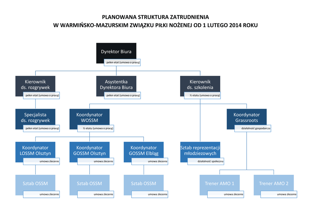 PLANOWANA STRUKTURA ZATRUDNIENIA W WARMIŃSKO-MAZURSKIM ZWIĄZKU PIŁKI NOŻENEJ OD 1 LUTEGO 2014 ROKU Dyrektor Biura pełen etat (umowa o pracę) Kierownik ds. rozgrywek Asystentka Dyrektora Biura pełen etat (umowa o pracę) Specjalista ds. rozgrywek pełen etat (umowa o pracę) Koordynator LOSSM Olsztyn umowa zlecenie Sztab OSSM umowa zlecenie Kierownik ds. szkolenia pełen etat (umowa o pracę) ½ etatu (umowa o pracę) Koordynator WOSSM Koordynator Grassroots ½ etatu (umowa o pracę) Koordynator GOSSM Olsztyn umowa zlecenie Sztab OSSM umowa zlecenie działalność gospodarcza Koordynator GOSSM Elbląg umowa zlecenie Sztab OSSM umowa zlecenie Sztab reprezentacji młodziezowych działalność społeczna Trener AMO 1 umowa zlecenie Trener AMO 2 umowa zlecenie Dyrektor Biura Sprawy dotyczące działalności następujących ciał: o Zarząd o Prezydium o Związkowa Komisja Odwoławcza o Komisja Rewizyjna o Komisja Odznaczeń o Delegaci PZPN Koordynacja pracy całego Biura W-MZPN i podległych pracowników Nadzór nad księgowością zewnętrzną Nadzór nad sprawami kadrowymi Działania marketingowe i promocyjne Komunikacja zewnętrzna Kierownik ds. rozgrywek Sprawy dotyczące działalności następujących ciał: o Wydział Gier i Ewidencji o Wydział Dyscypliny o Kolegium Sędziów o Komisja ds. Licencji Sędziowskich o Wydział Bezpieczeństwa o Komisja ds. Licencji Klubowych o Komisja Odwoławcza ds. Licencji Klubowych o Komisja Futsalu Koordynacja pracy podległych pracowników Kierownik ds. szkolenia Sprawy dotyczące działalności następujących ciał: o Wydział Szkolenia o Komisja ds. Licencji Trenerskich Koordynacja pracy podległych pracowników Asystentka Dyrektora Biura Prowadzenie sekretariatu Współpraca z księgowością zewnętrzną Prowadzenie spraw kadrowych Specjalista ds. rozgrywek Zakres obowiązków ustalony przez kierownika ds. rozgrywek Koordynator Wojewódzkiego Ośrodka Szkolenia Sportowego Młodzieży (opłaca MSIT i PZPN) Zarządzenie WOSSM i podległymi pracownikami Współpraca z PZPN odnośnie sporządzania wniosków i raportów Koordynator Grassroots (opłaca PZPN) Turniej „Z podwórka na stadion” Akademia Młodych Orłów Akademia Piłkarska Grassroots Grassroots Day 2014 Portal edukacyjny ExtraTime Koordynator OSSM (opłaca MSIT i PZPN) Zarządzanie danym OSSM i podległymi pracownikami Sztab reprezentacji młodzieżowych Prowadzenie selekcji do reprezentacji Konsultacje, mecze i zgrupowania reprezentacji Sztab OSSM (opłaca MSIT i PZPN) Prowadzenie zajęć i innych działań związanych z funkcjonowanie OSSM Trener AMO (opłaca PZPN) Prowadzenie zajęć na Orlikach w ramach Akademii Młodych Orłów