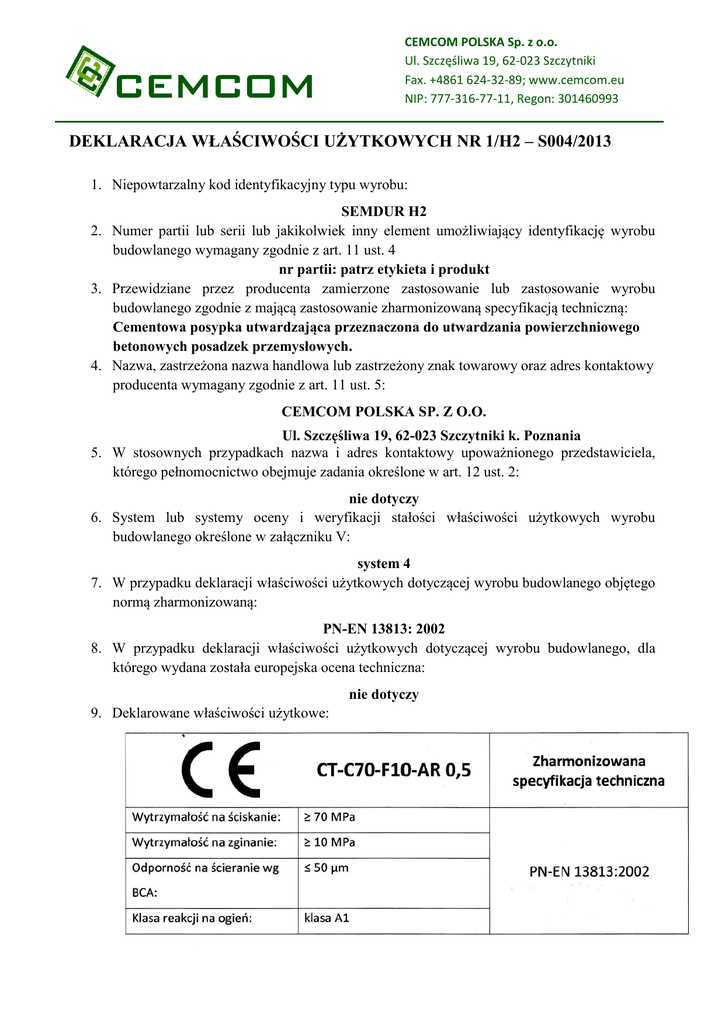 CEMCOM POLSKA Sp. z o.o. Ul. Szczęśliwa 19, 62-023 Szczytniki Fax. +4861 624-32-89; www.cemcom.eu NIP: 777-316-77-11, Regon: 301460993 DEKLARACJA WŁAŚCIWOŚCI UŻYTKOWYCH NR 1/H2 – S004/2013 1. Niepowtarzalny kod identyfikacyjny typu wyrobu: SEMDUR H2 2. Numer partii lub serii lub jakikolwiek inny element umożliwiający identyfikację wyrobu budowlanego wymagany zgodnie z art. 11 ust. 4 nr partii: patrz etykieta i produkt 3. Przewidziane przez producenta zamierzone zastosowanie lub zastosowanie wyrobu budowlanego zgodnie z mającą zastosowanie zharmonizowaną specyfikacją techniczną: Cementowa posypka utwardzająca przeznaczona do utwardzania powierzchniowego betonowych posadzek przemysłowych. 4. Nazwa, zastrzeżona nazwa handlowa lub zastrzeżony znak towarowy oraz adres kontaktowy producenta wymagany zgodnie z art. 11 ust. 5: CEMCOM POLSKA SP. Z O.O. Ul. Szczęśliwa 19, 62-023 Szczytniki k. Poznania 5. W stosownych przypadkach nazwa i adres kontaktowy upoważnionego przedstawiciela, którego pełnomocnictwo obejmuje zadania określone w art. 12 ust. 2: nie dotyczy 6. System lub systemy oceny i weryfikacji stałości właściwości użytkowych wyrobu budowlanego określone w załączniku V: system 4 7. W przypadku deklaracji właściwości użytkowych dotyczącej wyrobu budowlanego objętego normą zharmonizowaną: PN-EN 13813: 2002 8. W przypadku deklaracji właściwości użytkowych dotyczącej wyrobu budowlanego, dla którego wydana została europejska ocena techniczna: nie dotyczy 9. Deklarowane właściwości użytkowe: CEMCOM POLSKA Sp. z o.o. Ul. Szczęśliwa 19, 62-023 Szczytniki Fax. +4861 624-32-89; www.cemcom.eu NIP: 777-316-77-11, Regon: 301460993 10. Właściwości użytkowe wyrobu określone w pkt. 1 i 2 są zgodne z właściwościami użytkowanymi deklarowanymi w pkt. 9. Niniejsza deklaracja właściwości użytkowych zostaje wydana na wyłączną odpowiedzialność producenta określonego w pkt. 4. Szczytniki, dn. 01.07.2013r. mgr inż. Krzysztof Gielnik Prezes Zarządu