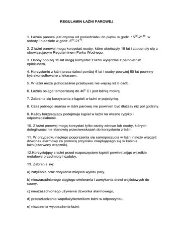 REGULAMIN ŁAŹNI PAROWEJ 1. Łaźnia parowa jest czynna od poniedziałku do piątku w godz. 1500-2145, w soboty i niedziele w godz. 800-2145. 2. Z łaźni parowej mogą korzystać osoby, które ukończyły 15 lat i zapoznały się z obowiązującym Regulaminem Parku Wodnego. 3. Osoby poniżej 15 lat mogą korzystać z łaźni wyłącznie z pełnoletnim opiekunem. 4. Korzystanie z łaźni przez dzieci poniżej 6 lat i osoby powyżej 50 lat powinny być skonsultowane z lekarzem. 5. W łaźni może jednocześnie przebywać nie więcej niż 8 osób. 6. Łaźnia osiąga temperaturę do 40o C i jest łaźnią mokrą. 7. Zabrania się korzystania z kąpieli w łaźni w pojedynkę. 8. Czas jednego seansu w łaźni parowej nie powinien być dłuższy niż pół godziny. 9. Każdy korzystający podejmuje kąpiel w łaźni na własne ryzyko i odpowiedzialność. 10. Z łaźni parowej mogą korzystać tylko osoby zdrowe lub osoby, których dolegliwości nie stanowią przeciwwskazań do korzystania z łaźni. 11. W przypadku nagłego pogorszenia się samopoczucia w łaźni należy włączyć dzwonek alarmowy za pomocą przycisku znajdującego się w kabinie łaźni(czerwony włącznik). 12.Korzystający z łaźni przed rozpoczęciem kąpieli powinni zdjąć wszelkie metalowe przedmioty i ozdoby. 13. Zabrania się: a) zatykania oraz dotykania miejsca wylotu pary, b) nieuzasadnionego ciągłego otwierania i zamykania drzwi wejściowych do sauny, c) nieuzasadnionego używania dzwonka alarmowego, d) przeszkadzania współużytkownikom łaźni w odpoczynku, e) niszczenia wyposażenia łaźni. 14. Nie wolno korzystać z łaźni pod wpływem alkoholu lub innych środków odurzających. 15. O każdej sytuacji zagrażającej bezpieczeństwu w łaźni oraz jej uszkodzeniu należy niezwłocznie powiadomić obsługę Parku Wodnego.