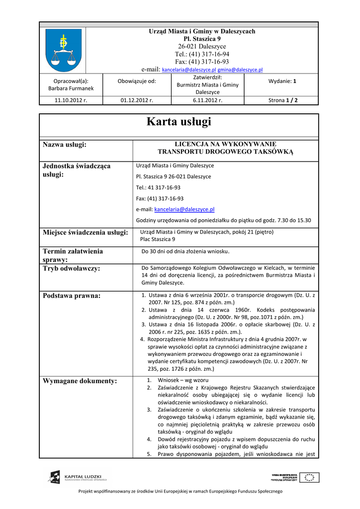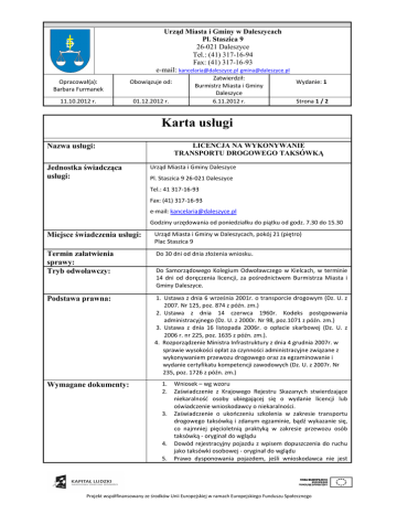 Urząd Miasta i Gminy w Daleszycach Pl. Staszica 9 26-021 Daleszyce Tel.: (41) 317-16-94 Fax: (41) 317-16-93 e-mail: [email protected] [email protected] Opracował(a): Barbara Furmanek Obowiązuje od: 11.10.2012 r. 01.12.2012 r. Zatwierdził: Burmistrz Miasta i Gminy Daleszyce 6.11.2012 r. Wydanie: 1 Strona 1 / 2 Karta usługi LICENCJA NA WYKONYWANIE TRANSPORTU DROGOWEGO TAKSÓWKĄ Nazwa usługi: Jednostka świadcząca usługi: Urząd Miasta i Gminy Daleszyce Pl. Staszica 9 26-021 Daleszyce Tel.: 41 317-16-93 Fax: (41) 317-16-93 e-mail: [email protected] Godziny urzędowania od poniedziałku do piątku od godz. 7.30 do 15.30 Miejsce świadczenia usługi: Urząd Miasta i Gminy w Daleszycach, pokój 21 (piętro) Plac Staszica 9 Termin załatwienia sprawy: Tryb odwoławczy: Do 30 dni od dnia złożenia wniosku. Podstawa prawna: Wymagane dokumenty: Do Samorządowego Kolegium Odwoławczego w Kielcach, w terminie 14 dni od doręczenia licencji, za pośrednictwem Burmistrza Miasta i Gminy Daleszyce. 1. Ustawa z dnia 6 września 2001r. o transporcie drogowym (Dz. U. z 2007. Nr 125, poz. 874 z późn. zm.) 2. Ustawa z dnia 14 czerwca 1960r. Kodeks postępowania administracyjnego (Dz. U. z 2000r. Nr 98, poz.1071 z późn. zm.) 3. Ustawa z dnia 16 listopada 2006r. o opłacie skarbowej (Dz. U. z 2006 r. nr 225, poz. 1635 z późn. zm.). 4. Rozporządzenie Ministra Infrastruktury z dnia 4 grudnia 2007r. w sprawie wysokości opłat za czynności administracyjne związane z wykonywaniem przewozu drogowego oraz za egzaminowanie i wydanie certyfikatu kompetencji zawodowych (Dz. U. z 2007r. Nr 235, poz. 1726 z późn. zm.) 1. 2. 3. 4. 5. Wniosek – wg wzoru Zaświadczenie z Krajowego Rejestru Skazanych stwierdzające niekaralność osoby ubiegającej się o wydanie licencji lub oświadczenie wnioskodawcy o niekaralności. Zaświadczenie o ukończeniu szkolenia w zakresie transportu drogowego taksówką i zdanym egzaminie, bądź wykazanie się, co najmniej pięcioletnią praktyką w zakresie przewozu osób taksówką - oryginał do wglądu Dowód rejestracyjny pojazdu z wpisem dopuszczenia do ruchu jako taksówki osobowej - oryginał do wglądu Prawo dysponowania pojazdem, jeśli wnioskodawca nie jest Projekt współfinansowany ze środków Unii Europejskiej w ramach Europejskiego Funduszu Społecznego Urząd Miasta i Gminy w Daleszycach Pl. Staszica 9 26-021 Daleszyce Tel.: (41) 317-16-94 Fax: (41) 317-16-93 e-mail: [email protected] [email protected] Opracował(a): Barbara Furmanek Obowiązuje od: 11.10.2012 r. 01.12.2012 r. Zatwierdził: Burmistrz Miasta i Gminy Daleszyce 6.11.2012 r. Wydanie: 1 Strona 2 / 2 właścicielem pojazdu Oświadczenie o zamiarze zatrudniania kierowców posiadających świadectwa kwalifikacji oraz niekaranych za przestępstwa wskazane w ustawie 7. Oświadczenie o braku przeciwwskazań lekarskich do wykonywania zawodu 8. Kserokopia prawa jazdy. 9. Świadectwo legalizacji taksometru – oryginał do wglądu. 10. Dowód uiszczenia opłaty za udzielenie licencji - oryginał do wglądu Opłata za udzielenie licencji płatna w kasie Urzędu lub na rachunek Urzędu od każdego pojazdu wynosi: b. 200 zł przy licencji wydanej na okres 2-15 lat c. 250 zł przy licencji wydanej na okres 15-30 lat d. 300 zł przy licencji wydanej na okres 30-50 lat Potwierdzenie opłaty stanowi załącznik do wniosku 6. Opłaty: Licencji udziela się na czas oznaczony, nie krótszy niż 2 lata i nie dłuższy niż 50 lat, uwzględniając wniosek przedsiębiorcy Uwagi: Numer konta bankowego: Bank Spółdzielczy Daleszyce – Górno w Daleszycach: 55 8485 0009 0000 0130 2000 0004 Wzory wniosków: Wniosek dostępny na www.daleszyce.pl oraz w załączeniu Projekt współfinansowany ze środków Unii Europejskiej w ramach Europejskiego Funduszu Społecznego Daleszyce, dnia ....................... ......................................... /Imię i nazwisko/ ........................................ ........................................ /adres/ Regon. Nr ................................... NIP Nr ................................. Nr w rejestrze przedsiębiorców lub ewidencji działalności gospodarczej.............................. URZĄD MIASTA GMINY w DALESZYCACH Proszę o udzielenie mi na okres ........ lat, licencji na wykonywanie transportu drogowego taksówką na obszar miasta i gminy Daleszyce, który wykonywał będę samochodem osobowym marki ...................nr rej. ........................................będący własnością..................................................................................................................................... ..... Do wniosku załączam następujące dokumenty: 1. Odpis: /z rejestru przedsiębiorców, z ewidencji działalności gospodarczej * wydany przez.................................................................................................................................. ........................................................................................................................................... ......../ 2. Kserokopię zaświadczenia o nadaniu numeru identyfikacji statystycznej /REGON/ wydanego przez .................................................................................................................... 3. Kserokopię zaświadczenia o nadaniu numeru identyfikacji podatkowej /NIP/ wydanego Urząd Skarbowy w .............................................................................................. 4. Zaświadczenie z rejestru skazanych z dnia ................................................................................. 5. Zaświadczenie o ukończeniu szkolenia w zakresie transportu drogowego taksówką Nr ............wydanego przez.................................................................................................... dnia.................potwierdzonego zdanym egzaminem w dniu ................................................ 6. Kserokopia dowodu rejestracyjnego ..............................