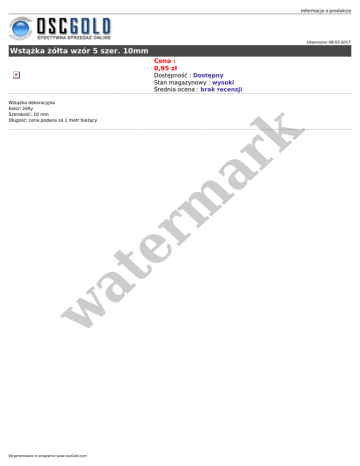 Informacje o produkcie Utworzono 08-03-2017 Wstążka żółta wzór 5 szer. 10mm Cena : 0,95 zł Dostępność : Dostępny Stan magazynowy : wysoki Średnia ocena : brak recenzji w at er m ar k Wstążka dekoracyjna Kolor: żółty Szerokość: 10 mm Długość: cena podana za 1 metr bieżący Wygenerowano w programie www.oscGold.com