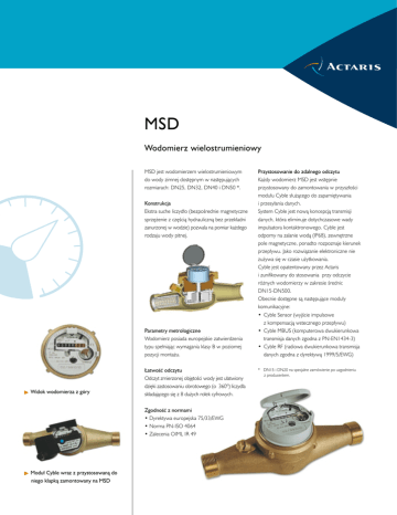 MSD Wodomierz wielostrumieniowy MSD jest wodomierzem wielostrumieniowym do wody zimnej dost´pnym w nast´pujàcych rozmiarach: DN25, DN32, DN40 i DN50 *. Konstrukcja Ekstra suche liczyd∏o (bezpoÊrednie magnetyczne sprz´˝enie z cz´Êcià hydraulicznà bez przek∏adni zanurzonej w wodzie) pozwala na pomiar ka˝dego rodzaju wody pitnej. Parametry metrologiczne Wodomierz posiada europejskie zatwierdzenia typu spe∏niajàc wymagania klasy B w poziomej pozycji monta˝u. Widok wodomierza z góry ¸atwoÊç odczytu Odczyt zmierzonej obj´toÊci wody jest u∏atwiony dzi´ki zastosowaniu obrotowego (o 360º) liczyd∏a sk∏adajàcego si´ z 8 du˝ych rolek cyfrowych. ZgodnoÊç z normami • Dyrektywa europejska 75/33/EWG • Norma PN-ISO 4064 • Zalecenia OIML IR 49 Modu∏ Cyble wraz z przystosowanà do niego klapkà zamontowany na MSD Przystosowanie do zdalnego odczytu Ka˝dy wodomierz MSD jest wst´pnie przystosowany do zamontowania w przysz∏oÊci modu∏u Cyble s∏u˝àcego do zapami´tywania i przesy∏ania danych. System Cyble jest nowà koncepcjà transmisji danych, która eliminuje dotychczasowe wady impulsatora kontaktronowego. Cyble jest odporny na zalanie wodà (IP68), zewn´trzne pole magnetyczne, ponadto rozpoznaje kierunek przep∏ywu. Jako rozwiàzanie elektroniczne nie zu˝ywa si´ w czasie u˝ytkowania. Cyble jest opatentowany przez Actaris i zunifikowany do stosowania przy odczycie ró˝nych wodomierzy w zakresie Êrednic DN15-DN500. Obecnie dost´pne sà nast´pujàce modu∏y komunikacyjne: • Cyble Sensor (wyjÊcie impulsowe z kompensacjà wstecznego przep∏ywu) • Cyble MBUS (komputerowa dwukierunkowa transmisja danych zgodna z PN-EN1434-3) • Cyble RF (radiowa dwukierunkowa transmisja danych zgodna z dyrektywà 1999/5/EWG) * DN15 i DN20 na specjalne zamówienie po uzgodnieniu z producentem. DN Próg rozruchu B + 30 E D 25 30 40 cal 1" 1" 1/4 1" 1/2 2" 70 90 l/h Dzia∏ka elementarna 25 l Zakres liczyd∏a C mm 0,05 m3 50 MSD_Cyble_1.2/2007 Parametry techniczne 0,5 99999.999 999999.99 Maksymalna temperatura °C 50 Maksymalne ciÊnienie bar 16 Zatwierdzone wartoÊci zgodne z dyrektywà 75/33/EWG i normà PN-ISO4064 A Qmax m3/h 7 10 20 30 Qn m3/h 3,5 5 10 15 Qt m3/h 0,28 0,4 0,8 3 Qmin m3/h 0,07 0,1 0,2 0,45 Strata ciÊnienia przy Qmax bar 0,6 1 1 1 Maksymalna temperatura °C 50 30 Zatwierdzenie europejskie F99 G382.008 F Wymiary DN A ISO mm 25 30 40 cal 1" 1" 1/4 1" 1/2 2" mm 260 B mm 190 222 C mm 124 155 182 D mm G 2" G 2" 1/2 E mm 34,5 45 53 F mm 103 128 132 4,5 10 Waga G 1" 1/4 kg 300 G 1" 1/2 2,1 2,2 250 Dost´pna wersja ko∏nierzowa dla DN 50 o d∏ugoÊci 300 mm. Strata ciÊnienia DN 50 25 DN DN 40 DN 0.3 30 bar 1 0.9 0.8 0.7 0.6 0.5 0.4 0.2 0.1 m3/h 0 10 20 30 Actaris Polska Sp. z o.o. 30-702 Kraków ul. T. Romanowicza 6 Wi´cej informacji: www.actaris.pl, e-mail: [email protected] t e l : (12) 257 10 27 257 10 28 257 10 29 fax: (12) 257 10 25 WA-0061.0-PL-10.04 - © Copyright 2004, Actaris. Wszystkie prawa zastrze˝one. - Actaris zastrzega sobie prawo dokonywania zmian i ulepszeƒ w produkowanych urzàdzeniach. - Zdj´cia: Mohamed Khalfi. Wymiary