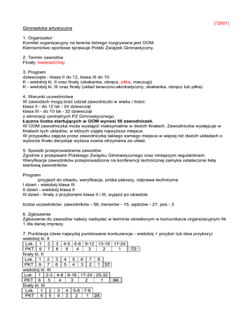(*2007) Gimnastyka artystyczna 1. Organizator Komitet organizacyjny na terenie którego rozgrywana jest OOM. Kierownictwo sportowe sprawuje Polski Związek Gimnastyczny. 2. Termin zawodów Finały: kwiecień/maj 3. Program dziewczęta - klasa II do 12, klasa III do 10 K - wielobój kl. II oraz finały (skakanka, obręcz, piłka, maczugi) K - wielobój kl. III oraz finały (układ taneczno-akrobatyczny, skakanka, obręcz lub piłka) 4. Warunki uczestnictwa W zawodach mogą brać udział zawodniczki w wieku i ilości: klasa II - do 12 lat - 24 dziewcząt klasa III - do 10 lat - 32 dziewcząt z eliminacji centralnych PZ Gimnastycznego. Łączna liczba startujących w OOM wynosi 56 zawodniczek. W OOM zawodniczka może wystąpić maksymalnie w dwóch finałach. Zawodniczka występuje w finałach tych układów, w których zajęła najwyższe miejsce. W przypadku zajęcia przez zawodniczkę takiego samego miejsca w więcej niż dwóch układach o wyborze finału decyduje wyższa ocena otrzymana za układ. 5. Sposób przeprowadzenia zawodów Zgodnie z przepisami Polskiego Związku Gimnastycznego oraz niniejszym regulaminem. Weryfikacja zawodników przeprowadzona na konferencji technicznej zamyka ostatecznie listę startową zawodników. Program przyjazd do obiadu, weryfikacja, próba planszy, odprawa techniczna I dzień - wielobój klasa III II dzień - wielobój klasa II III dzień - finały z przyborami klasa II i III, wyjazd po obiedzie liczba uczestników: zawodników - 56, trenerów - 15, sędziów - 27, pzs - 3 6. Zgłoszenia Zgłoszenie do zawodów należy nadsyłać w terminie określonym w komunikacie organizacyjnym Nr 1 dla danej imprezy. 7. Punktacja (dwie najwyżej punktowane konkurencje - wielobój + przybór lub dwa przybory) wielobój kl. II Lok. 1 2 3 4-5 6-8 9-12 13-16 17-24 PKT 9 7 6 5 4 3 2 1 72 finały kl. II Lok. 1 2 3 4 5 6 7 8 PKT 9 7 6 5 4 3 2 1 37 wielobój kl. III Lok. 1 2-3 4-8 9-16 17-24 25-32 PKT 6 5 4 3 2 1 84 finały kl. III Lok. 1 2 3 4 5-6 7-8 PKT 6 5 4 3 2 1 24 Gimnastyka sportowa 1. Organizator Komitet organizacyjny na terenie którego rozgrywana jest OOM. Kierownictwo sportowe sprawuje Polski Związek Gimnastyczny. 2. Termin zawodów Finały: kwiecień/maj 3. Program dziewczęta kl.II do 14 chłopcy kl. II do 15 lat K - wielobój kl. II oraz finały (skok, poręcze, równoważnia, ćw. wolne) M - wielobój kl. II oraz finały (ćw. wolne, koń z łękami, kółka, skok, poręcze, drążek) dziewczęta kl.III do 12 chłopcy kl. III do 13 lat K - wielobój kl. III oraz finały (skok, poręcze, równoważnia, ćw. wolne) M - wielobój kl. III oraz finały (ćw. wolne, koń z łękami, kółka, skok, poręcze, drążek) 4. Warunki uczestnictwa W zawodach mogą brać udział zawodniczki w wieku: klasa II - K - do 14 lat; M – do 15 lat w ilości: 24 dziewcząt, 24 chłopców klasa III - K - do 12 lat; M – do 13 lat w ilości: 32 dziewcząt, 32 chłopców z eliminacji centralnych PZ Gimnastycznego. Łączna liczba startujących w OOM wynosi 112 zawodniczek i zawodników. 5. Sposób przeprowadzenia zawodów Zgodnie z przepisami Polskiego Związku Gimnastycznego oraz niniejszym regulaminem. Weryfikacja zawodników przeprowadzona na konferencji technicznej zamyka ostatecznie listę startową zawodników. Program I dzień - przyjazd do obiadu, próba przyrządów, weryfikacja, odprawa techniczna II dzień - wielobój klasa III i II M III dzień – wielobój klasa III i II K IV dzień - finały na przyrządach klasa II i III K i M, wyjazd po obiedzie liczba uczestników: zawodników 56 dziewcząt + 56 chłopców, trenerów 12+12, sędziów 17+25, pzs 3 6. Zgłoszenia Zgłoszenie do zawodów należy nadsyłać w terminie określonym w komunikacie organizacyjnym Nr 1 dla danej imprezy. 7. Punktacja - (dwie najwyżej punktowane konkurencje - wielobój + przyrząd lub dwa przyrządy) wielobój kl. II Lok. 1 2 3 4-5 6-8 9-12 13-16 17-24 PKT 9 7 6 5 4 3 2 1 72 finały kl. II Lok. 1 2 3 4 5 6 7 8 PKT 9 7 6 5 4 3 2 1 37 wielobój kl. III Lok. 1 2-3 4-8 9-16 17-24 25-32 PKT 6 5 4 3 2 1 84 finały kl. III Lok. 1 2 3 4 5-6 7-8 PKT 6 5 4 3 2 1 24 D. System ocen Gimnastyka artystyczna I. Młodzieżowe Mistrzostwa Polski K - do 18 lat 1. Program K - wielobój kl. mistrzowska 2. Punktacja Lok. 1 2 3 4 5 6 7 8 9-12 PKT 25 21 18 16 14 12 11 10 8 159 II. Mistrzostwa Polski Juniorów K - do 15 lat 1. Program K - wielobój kl. I oraz finały (skakanka, obręcz, piłka, wstążka), układy zbiorowe 2. Punktacja (trzy najwyżej punktowane konkurencje - wielobój + dwa przybory lub trzy przybory) wielobój Lok. 1 2 3 4 5 6 7 8 9 10-11 12-13 14-16 PKT 15 12 10 9 8 7 6 5 4 3 2 1 89 finały, układy zbiorowe Lok. 1 2 3 4 5 6 7 8 PKT 15 12 10 8 6 4 3 2 60 III. Olimpiada Młodzieży - Mistrzostwa Polski Juniorów młodszych Klasa II - K – do 12 lat, Klasa III K – do 10 lat 1. Program K - wielobój kl. II oraz finały (skakanka, obręcz, piłka, maczugi) K - wielobój kl. III oraz finały (układ taneczno-akrobatyczny, skakanka, obręcz lub piłka) 2. Punktacja (dwie najwyżej punktowane konkurencje - wielobój + przybór lub dwa przybory) wielobój kl. II Lok. 1 2 3 4-5 6-8 9-12 13-16 17-24 PKT 9 7 6 5 4 3 2 1 72 finały kl. II Lok. 1 2 3 4 5 6 7 8 PKT 9 7 6 5 4 3 2 1 37 wielobój kl. III Lok. 1 2-3 4-8 9-16 17-24 25-32 PKT 6 5 4 3 2 1 84 finały kl. III Lok. 1 2 3 4 5-6 7-8 PKT 6 5 4 3 2 1 24 Eliminacje do OOM – eliminacje centralne III. Mistrzostwa Polski Juniorów młodszych Klasa II - K – do 12 lat Klasa III K – do 10 lat 1. Program K – układy zbiorowe klasa II, III 2. Punktacja układy zbiorowe klasa II Lok. 1 2 3 4 5 6 7 8 PKT 9 7 6 5 4 3 2 1 37 układy zbiorowe kl. III Lok. 1 2 3 4 PKT 6 5 4 3 5-6 2 7-8 1 24 IV. Międzywojewódzkie Mistrzostwa Młodzików klasa młodzieżowa K - do 9 lat 1. Program K - wielobój kl. Młodzieżowa oraz finały (układ taneczno-akrobatyczny, skakanka, obręcz) 2. Punktacja - (dwie najwyżej punktowane konkurencje - wielobój + przybór lub dw