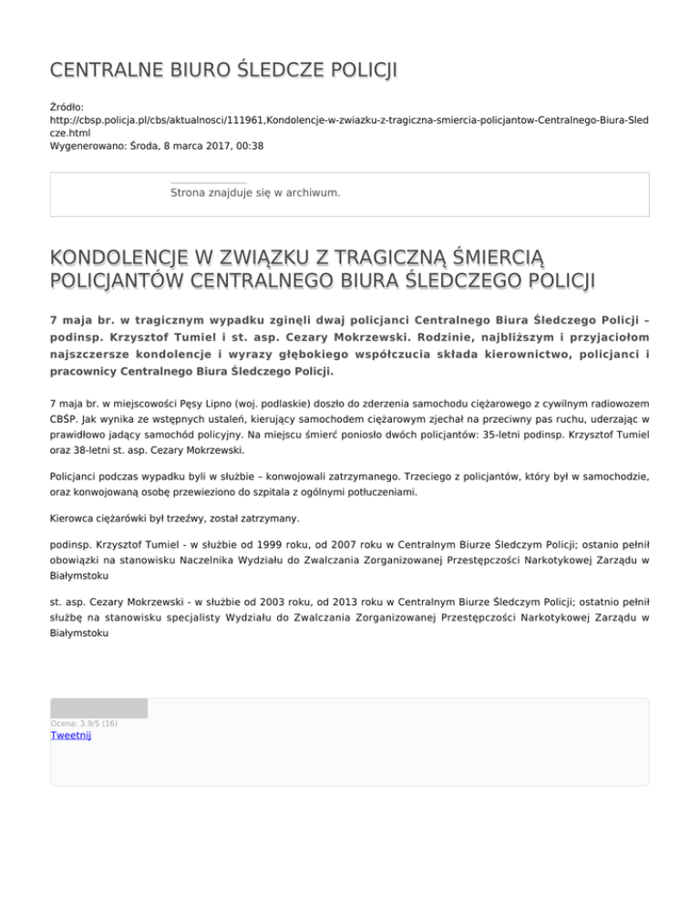 CENTRALNE BIURO ŚLEDCZE POLICJI Źródło: http://cbsp.policja.pl/cbs/aktualnosci/111961,Kondolencje-w-zwiazku-z-tragiczna-smiercia-policjantow-Centralnego-Biura-Sled cze.html Wygenerowano: Środa, 8 marca 2017, 00:38 Strona znajduje się w archiwum. KONDOLENCJE W ZWIĄZKU Z TRAGICZNĄ ŚMIERCIĄ POLICJANTÓW CENTRALNEGO BIURA ŚLEDCZEGO POLICJI 7 maja br. w tragicznym wypadku zginęli dwaj policjanci Centralnego Biura Śledczego Policji – podinsp. Krzysztof Tumiel i st. asp. Cezary Mokrzewski. Rodzinie, najbliższym i przyjaciołom najszczersze kondolencje i wyrazy głębokiego współczucia składa kierownictwo, policjanci i pracownicy Centralnego Biura Śledczego Policji. 7 maja br. w miejscowości Pęsy Lipno (woj. podlaskie) doszło do zderzenia samochodu ciężarowego z cywilnym radiowozem CBŚP. Jak wynika ze wstępnych ustaleń, kierujący samochodem ciężarowym zjechał na przeciwny pas ruchu, uderzając w prawidłowo jadący samochód policyjny. Na miejscu śmierć poniosło dwóch policjantów: 35-letni podinsp. Krzysztof Tumiel oraz 38-letni st. asp. Cezary Mokrzewski. Policjanci podczas wypadku byli w służbie – konwojowali zatrzymanego. Trzeciego z policjantów, który był w samochodzie, oraz konwojowaną osobę przewieziono do szpitala z ogólnymi potłuczeniami. Kierowca ciężarówki był trzeźwy, został zatrzymany. podinsp. Krzysztof Tumiel - w służbie od 1999 roku, od 2007 roku w Centralnym Biurze Śledczym Policji; ostanio pełnił obowiązki na stanowisku Naczelnika Wydziału do Zwalczania Zorganizowanej Przestępczości Narkotykowej Zarządu w Białymstoku st. asp. Cezary Mokrzewski - w służbie od 2003 roku, od 2013 roku w Centralnym Biurze Śledczym Policji; ostatnio pełnił służbę na stanowisku specjalisty Wydziału do Zwalczania Zorganizowanej Przestępczości Narkotykowej Zarządu w Białymstoku Ocena: 3.9/5 (16) Tweetnij