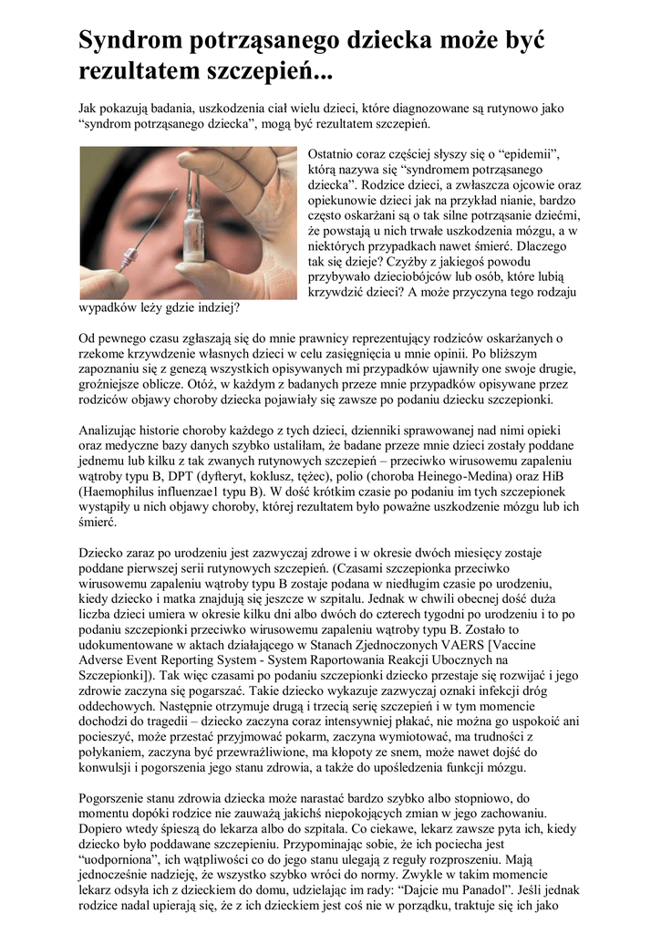 Syndrom potrząsanego dziecka może być rezultatem szczepień... Jak pokazują badania, uszkodzenia ciał wielu dzieci, które diagnozowane są rutynowo jako “syndrom potrząsanego dziecka”, mogą być rezultatem szczepień. Ostatnio coraz częściej słyszy się o “epidemii”, którą nazywa się “syndromem potrząsanego dziecka”. Rodzice dzieci, a zwłaszcza ojcowie oraz opiekunowie dzieci jak na przykład nianie, bardzo często oskarżani są o tak silne potrząsanie dziećmi, że powstają u nich trwałe uszkodzenia mózgu, a w niektórych przypadkach nawet śmierć. Dlaczego tak się dzieje? Czyżby z jakiegoś powodu przybywało dzieciobójców lub osób, które lubią krzywdzić dzieci? A może przyczyna tego rodzaju wypadków leży gdzie indziej? Od pewnego czasu zgłaszają się do mnie prawnicy reprezentujący rodziców oskarżanych o rzekome krzywdzenie własnych dzieci w celu zasięgnięcia u mnie opinii. Po bliższym zapoznaniu się z genezą wszystkich opisywanych mi przypadków ujawniły one swoje drugie, groźniejsze oblicze. Otóż, w każdym z badanych przeze mnie przypadków opisywane przez rodziców objawy choroby dziecka pojawiały się zawsze po podaniu dziecku szczepionki. Analizując historie choroby każdego z tych dzieci, dzienniki sprawowanej nad nimi opieki oraz medyczne bazy danych szybko ustaliłam, że badane przeze mnie dzieci zostały poddane jednemu lub kilku z tak zwanych rutynowych szczepień – przeciwko wirusowemu zapaleniu wątroby typu B, DPT (dyfteryt, koklusz, tężec), polio (choroba Heinego-Medina) oraz HiB (Haemophilus influenzae1 typu B). W dość krótkim czasie po podaniu im tych szczepionek wystąpiły u nich objawy choroby, której rezultatem było poważne uszkodzenie mózgu lub ich śmierć. Dziecko zaraz po urodzeniu jest zazwyczaj zdrowe i w okresie dwóch miesięcy zostaje poddane pierwszej serii rutynowych szczepień. (Czasami szczepionka przeciwko wirusowemu zapaleniu wątroby typu B zostaje podana w niedługim czasie po urodzeniu, kiedy dziecko i matka znajdują się jeszcze w szpitalu. Jednak w chwili obecnej dość duża liczba dzieci umiera w okresie kilku dni albo dwóch do czterech tygodni po urodzeniu i to po podaniu szczepionki przeciwko wirusowemu zapaleniu wątroby typu B. Zostało to udokumentowane w aktach działającego w Stanach Zjednoczonych VAERS [Vaccine Adverse Event Reporting System - System Raportowania Reakcji Ubocznych na Szczepionki]). Tak więc czasami po podaniu szczepionki dziecko przestaje się rozwijać i jego zdrowie zaczyna się pogarszać. Takie dziecko wykazuje zazwyczaj oznaki infekcji dróg oddechowych. Następnie otrzymuje drugą i trzecią serię szczepień i w tym momencie dochodzi do tragedii – dziecko zaczyna coraz intensywniej płakać, nie można go uspokoić ani pocieszyć, może przestać przyjmować pokarm, zaczyna wymiotować, ma trudności z połykaniem, zaczyna być przewrażliwione, ma kłopoty ze snem, może nawet dojść do konwulsji i pogorszenia jego stanu zdrowia, a także do upośledzenia funkcji mózgu. Pogorszenie stanu zdrowia dziecka może narastać bardzo szybko albo stopniowo, do momentu dopóki rodzice nie zauważą jakichś niepokojących zmian w jego zachowaniu. Dopiero wtedy śpieszą do lekarza albo do szpitala. Co ciekawe, lekarz zawsze pyta ich, kiedy dziecko było poddawane szczepieniu. Przypominając sobie, że ich pociecha jest “uodporniona”, ich wątpliwości co do jego stanu ulegają z reguły rozproszeniu. Mają jednocześnie nadzieję, że wszystko szybko wróci do normy. Zwykle w takim momencie lekarz odsyła ich z dzieckiem do domu, udzielając im rady: “Dajcie mu Panadol”. Jeśli jednak rodzice nadal upierają się, że z ich dzieckiem jest coś nie w porządku, traktuje się ich jako przesadnie przewrażliwionych lub kogoś, kto szuka kłopotów. Tak więc rodzice idą do domu, a ich dziecko pozostaje w tym samym stanie co poprzednio, a w skrajnych przypadkach umiera. Do niedawna śmierć dziecka z powodu podania mu szczepionki była określana jako “nagła śmierć noworodka”, zwłaszcza gdy brak było wyraźnych symptomów oraz wyników badań patologicznych. Obecnie z uwagi na rosnącą liczbę przypadków przedwczesnej śmierci noworodków rodzice (głównie ojciec) często oskarżani są o spowodowanie śmierci dziecka z powodu zbyt mocnego potrząsania nim. “Uzasadnieniem” oskarżeń wysuwanych pod adresem rodziców jest domniemanie, że rodzice, widząc, że ich dziecko się nie porusza, nie oddycha, ma szkliste spojrzenie, zaczynają nagle odruchowo nim potrząsać, aby przywrócić je do życia. Czasami – co zakrawa trochę na ironię – chcąc ratować życie swojemu dziecku rodzice oskarżani są potem o spowodowanie obrażeń wewnętrznych, które doprowadziły rzekomo do utraty przez nie oddechu. W rzeczywistości obrażenia te istniały już wcześniej, przed potrząsaniem dziecka mającym na celu przywrócenie go do życia. Nieważne co powiedzą lub zrobią rodzice pokrzywdzonego dziecka. I tak wszystko świadczy przeciwko nim. Jeśli będą płakać i okazywać zbyt wiele emocji, sąd uzna to za oznakę ich winy. Jeśli będą zachowywać się spokojnie nie okazując żadnych emocji, sąd uzna, że są wyrachowani i winni. Innym razem przerażeni rodzice starają się opisać symptomy choroby dziecka towarzyszącemu im w szpitalu lekarzowi lub chirurgowi, zupełnie nie rozumiejąc, co tak naprawdę przytrafiło się ich dziecku. Zdezorientowani i będący w szoku dopiero po pewnym czasie odkrywają, że kiedy opisywali lekarzowi dostrzeżone przez siebie objawy, on albo inny członek zespołu lekarskiego diagnozował je jako syndrom potrząsanego dziecka. Wielu z tych rodziców oskarżanych jest często o spowodowanie obrażeń u swojego dziecka, a nawet osadzanych w więzieniu za coś, czego w rzeczywistości nie popełnili, a co było udziałem kogoś zupełnie innego. Niektóre z tego rodzaju przypadk
