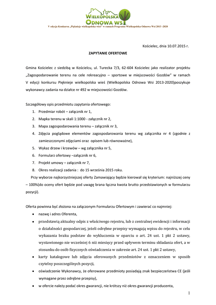 V edycja Konkursu „Pięknieje wielkopolska wieś” w ramach Programu Wielkopolska Odnowa Wsi 2013 -2020 Kościelec, dnia 10.07.2015 r. ZAPYTANIE OFERTOWE Gmina Kościelec z siedzibą w Kościelcu, ul. Turecka 7/3, 62-604 Kościelec jako realizator projektu „Zagospodarowanie terenu na cele rekreacyjno – sportowe w miejscowości Gozdów” w ramach V edycji konkursu Pięknieje wielkopolska wieś (Wielkopolska Odnowa Wsi 2013-2020)poszykuje wykonawcy zadania na działce nr 492 w miejscowości Gozdów. Szczegółowy opis przedmiotu zapytania ofertowego: 1. Przedmiar robót – załącznik nr 1, 2. Mapka terenu w skali 1:1000 - załącznik nr 2, 3. Mapa zagospodarowania terenu – załącznik nr 3, 4. Zdjęcia poglądowe elementów zagospodarowania terenu wg załącznika nr 4 (zgodnie z zamieszczonymi zdjęciami oraz opisem lub równoważne), 5. Wykaz drzew i krzewów – wg załącznika nr 5, 6. Formularz ofertowy –załącznik nr 6, 7. Projekt umowy – załącznik nr 7, 8. Okres realizacji zadania : do 15 września 2015 roku. Przy wyborze najkorzystniejszej oferty Zamawiający będzie kierował się kryterium: najniższej ceny – 100%(do oceny ofert będzie pod uwagę brana łączna kwota brutto przedstawionych w formularzu pozycji). Oferta powinna być złożona na załączonym Formularzu Ofertowym i zawierać co najmniej: nazwę i adres Oferenta, przedstawią aktualny odpis z właściwego rejestru, lub z centralnej ewidencji i informacji o działalności gospodarczej, jeżeli odrębne przepisy wymagają wpisu do rejestru, w celu wykazania braku podstaw do wykluczenia w oparciu o art. 24 ust. 1 pkt 2 ustawy, wystawionego nie wcześniej 6 niż miesięcy przed upływem terminu składania ofert, a w stosunku do osób fizycznych oświadczenia w zakresie art. 24 ust. 1 pkt 2 ustawy, karty katalogowe lub zdjęcia oferowanych przedmiotów z oznaczeniem w sposób czytelny poszczególnych pozycji, oświadczenie Wykonawcy, że oferowane przedmioty posiadają znak bezpieczeństwa CE (jeśli wymagane przez odrębne przepisy), w ofercie należy podać okres gwarancji, nie krótszy niż okres gwarancji producenta, 1 V edycja Konkursu „Pięknieje wielkopolska wieś” w ramach Programu Wielkopolska Odnowa Wsi 2013 -2020 formularz ofertowy oraz projekt umowy powinien być parafowany na każdej stronie przez upoważnioną osobę do reprezentowania oferenta, oferta powinna być złożona w zamkniętej kopercie w sekretariacie Urzędu Gminy. Przesłane oferty traktować będziemy jednocześnie jako deklarację gotowości realizacji w/w przedmiotu zamówienia zgodnie ze wszystkimi wskazanymi założeniami. Nie dopuszcza się złożenia oferty częściowej lub oferty wariantowej. Prosimy o przesłanie stosownej oferty najpóźniej do dnia 24 lipca 2015 roku do godziny 15.00 na adres(liczy się data wpływu do urzędu): Urząd Gminy Kościelec Ul. Turecka 7/3 62-604 Kościelec tel. (063) 27 16 222 z dopiskiem: „Zapytanie ofertowe- Zagospodarowanie ternu na cele rekreacyjno – sportowe w miejscowości Gozdów” Osoba do kontaktu: Justyna Sobczak Tel. (063) 27 16 222 wew.31 e-mail: [email protected] Z poważaniem Wójt Gminy Kościelec /-/ Dariusz Ostrowski 2