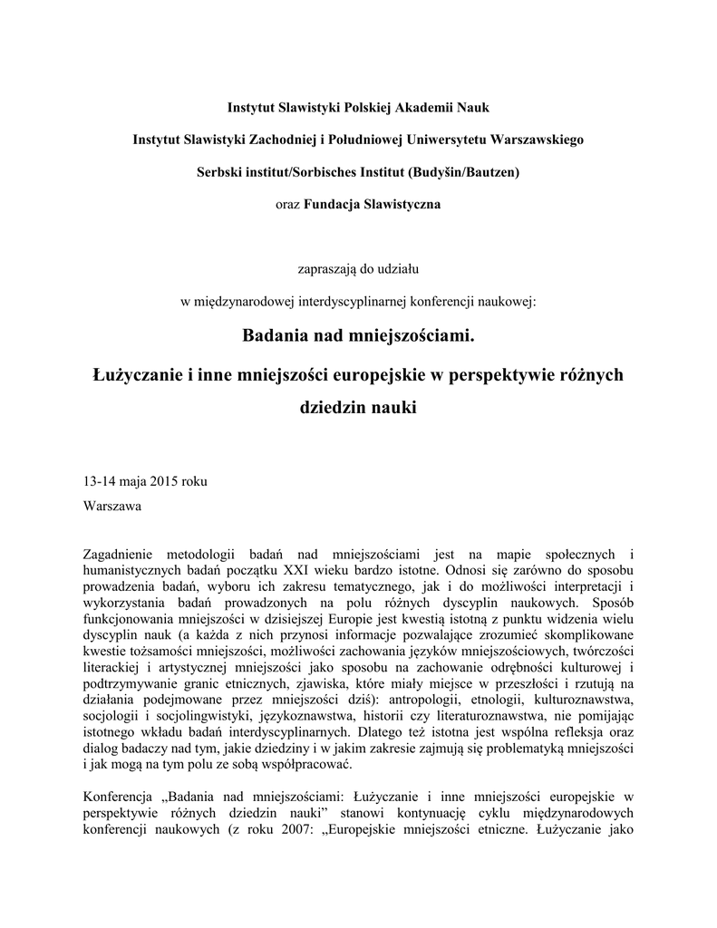 Instytut Slawistyki Polskiej Akademii Nauk Instytut Slawistyki Zachodniej i Południowej Uniwersytetu Warszawskiego Serbski institut/Sorbisches Institut (Budyšin/Bautzen) oraz Fundacja Slawistyczna zapraszają do udziału w międzynarodowej interdyscyplinarnej konferencji naukowej: Badania nad mniejszościami. Łużyczanie i inne mniejszości europejskie w perspektywie różnych dziedzin nauki 13-14 maja 2015 roku Warszawa Zagadnienie metodologii badań nad mniejszościami jest na mapie społecznych i humanistycznych badań początku XXI wieku bardzo istotne. Odnosi się zarówno do sposobu prowadzenia badań, wyboru ich zakresu tematycznego, jak i do możliwości interpretacji i wykorzystania badań prowadzonych na polu różnych dyscyplin naukowych. Sposób funkcjonowania mniejszości w dzisiejszej Europie jest kwestią istotną z punktu widzenia wielu dyscyplin nauk (a każda z nich przynosi informacje pozwalające zrozumieć skomplikowane kwestie tożsamości mniejszości, możliwości zachowania języków mniejszościowych, twórczości literackiej i artystycznej mniejszości jako sposobu na zachowanie odrębności kulturowej i podtrzymywanie granic etnicznych, zjawiska, które miały miejsce w przeszłości i rzutują na działania podejmowane przez mniejszości dziś): antropologii, etnologii, kulturoznawstwa, socjologii i socjolingwistyki, językoznawstwa, historii czy literaturoznawstwa, nie pomijając istotnego wkładu badań interdyscyplinarnych. Dlatego też istotna jest wspólna refleksja oraz dialog badaczy nad tym, jakie dziedziny i w jakim zakresie zajmują się problematyką mniejszości i jak mogą na tym polu ze sobą współpracować. Konferencja „Badania nad mniejszościami: Łużyczanie i inne mniejszości europejskie w perspektywie różnych dziedzin nauki” stanowi kontynuację cyklu międzynarodowych konferencji naukowych (z roku 2007: „Europejskie mniejszości etniczne. Łużyczanie jako mniejszość wzorcowa” i 2011: „Łużyczanie i inne mniejszości językowe, kulturowe i etniczne w Europie”). Dlatego też punktem centralnym rozważań będą Łużyczanie – słowiańska mniejszość zamieszkująca w Niemczech. Chcielibyśmy jednak zaproponować perspektywę komparatystyczną refleksji nad zagadnieniami odnoszącymi się do mniejszości europejskich. Porównanie kondycji, problemów, sposobów radzenia sobie z nimi przez różne grupy kulturowe zamieszkujące stary kontynent, a także zestawienie i analiza różnych metodologii pozwoli na wyciągnięcie wniosków dotyczących nie tylko samych mniejszości, ale też najlepszych sposobów ich badań. Dlatego do udziału w konferencji zapraszamy przedstawicieli różnych dyscyplin zajmujących się badaniami nad wybranymi mniejszościami/aspektami/teorią funkcjonowania mniejszości w Europie. Proponujemy następujące zagadnienia, które będą punktem wyjścia przedstawianych referatów i towarzyszących im dyskusji: Dylematy badań nad mniejszościami: perspektywa emiczna i etyczna badań nad mniejszościami perspektywa badacza wewnętrznego i zewnętrznego wpływ badań nad mniejszościami na odbiór społeczny mniejszości badania nad mniejszościami a tworzenie zainteresowania sprawami mniejszości wykorzystywanie badań nad mniejszościami przez instytucje państwowe międzynarodowe odpowiedzialność badacza za losy mniejszości zaangażowanie badacza w sprawy mniejszości a etyka badawcza badania nad mniejszościami jako nauka zaangażowana wybór obszaru i sposób prezentowania wyników badań i Badania szczegółowe i badania interdyscyplinarne: literatura i twórczość artystyczna: świadectwo funkcjonowania mniejszości badania socjologiczne i socjolingwistyczne: metodologia i wykorzystanie wyników badań badania społeczne i kulturowe nad mniejszościami: nowe wyzwania w XXI wieku językoznawstwo: nowe/stare kierunki i metodologie badań nad językami mniejszościowymi historia: przeszłość jako klucz do teraźniejszości etnologia i antropologia: zrozumieć mniejszość i jej przedstawicieli Perspektywa komparatystyczna i interdyscyplinarność badań: sorabistyka a badania nad innymi mniejszościami europejskimi: podobieństwa i różnice wspólna metodologia – różne wnioski: czy perspektywa komparatystyczna badań nad mniejszościami jest konieczna mniejszości jako byt złożony: interdyscyplinarność badań nad mniejszościami jako wyzwanie XXI wieku Zaproponowane tematy nie wykluczają innych oryginalnych ujęć. Teksty pokonferencyjne opublikowane zostaną w piśmie „Zeszyty Łużyckie” znajdującym się na liście „B” Ministerstwa Nauki i Szkolnictwa Wyższego oraz na liście ERIH Plus. Komitet organizacyjny: Komitet honorowy: Dr Elżbieta Wrocławska Prof. dr hab. Jadwiga Zieniukowa Dr Nicole Dołowy-Rybińska Prof. dr hab. Zbigniew Greń Dr Jerzy Molas Prof. dr hab. Joanna Goszczyńska Dr hab. Ewa Golachowska, prof. IS PAN Dr hab. Anna Zielińska, prof. IS PAN Prof. dr hab. Dietrich Scholze Opłata konferencyjna wynosi 300 zł. Ulgowa opłata konferencyjna (dla doktorantów) wynosi 200 zł. Organizatorzy nie zapewniają miejsc noclegowych, umożliwiają rezerwację tańszych noclegów w hotelu UW „Hera”. Językami konferencji są języki słowiańskie, angielski i niemiecki. Zgłoszenia zawierające imię, nazwisko, afiliację i abstrakt referatu o długości nieprzekraczającej 2000 znaków prosimy wysyłać na adres [email protected] Ważne terminy: 1. Przyjmowanie zgłoszeń na konferencję – do 28 lutego 2015 roku 2. 15 marca – informacja o zakwalifikowaniu referatu 3. Do 1 kwietnia – opłata konferencyjna (szczegóły zostaną wysłane 15 marca) 4. 13-14 maja 2015 – konferencja 5. Do 1 grudnia 2015 – przyjmowanie artykułów pokonferencyjnych The Institute of Slavic Studies, Polish Academy of Sciences Institute of Western and Southern Slavic Studies, Warsaw University Sorbian Institute (Budyšin/Bautzen) and The Slavic Foundation cordially i