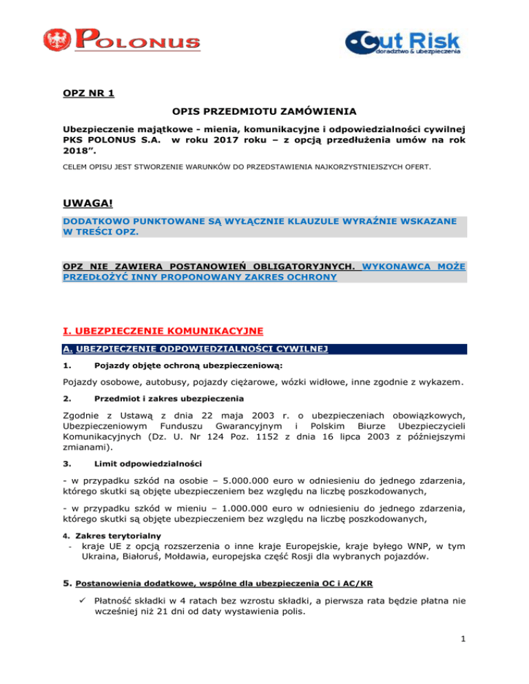 OPZ NR 1 OPIS PRZEDMIOTU ZAMÓWIENIA Ubezpieczenie majątkowe - mienia, komunikacyjne i odpowiedzialności cywilnej PKS POLONUS S.A. w roku 2017 roku – z opcją przedłużenia umów na rok 2018”. CELEM OPISU JEST STWORZENIE WARUNKÓW DO PRZEDSTAWIENIA NAJKORZYSTNIEJSZYCH OFERT. UWAGA! DODATKOWO PUNKTOWANE SĄ WYŁĄCZNIE KLAUZULE WYRAŹNIE WSKAZANE W TREŚCI OPZ. OPZ NIE ZAWIERA POSTANOWIEŃ OBLIGATORYJNYCH. WYKONAWCA MOŻE PRZEDŁOŻYĆ INNY PROPONOWANY ZAKRES OCHRONY I. UBEZPIECZENIE KOMUNIKACYJNE A. UBEZPIECZENIE ODPOWIEDZIALNOŚCI CYWILNEJ 1. Pojazdy objęte ochroną ubezpieczeniową: Pojazdy osobowe, autobusy, pojazdy ciężarowe, wózki widłowe, inne zgodnie z wykazem. 2. Przedmiot i zakres ubezpieczenia Zgodnie z Ustawą z dnia 22 maja 2003 r. o ubezpieczeniach obowiązkowych, Ubezpieczeniowym Funduszu Gwarancyjnym i Polskim Biurze Ubezpieczycieli Komunikacyjnych (Dz. U. Nr 124 Poz. 1152 z dnia 16 lipca 2003 z późniejszymi zmianami). 3. Limit odpowiedzialności - w przypadku szkód na osobie – 5.000.000 euro w odniesieniu do jednego zdarzenia, którego skutki są objęte ubezpieczeniem bez względu na liczbę poszkodowanych, - w przypadku szkód w mieniu – 1.000.000 euro w odniesieniu do jednego zdarzenia, którego skutki są objęte ubezpieczeniem bez względu na liczbę poszkodowanych, 4. Zakres terytorialny - kraje UE z opcją rozszerzenia o inne kraje Europejskie, kraje byłego WNP, w tym Ukraina, Białoruś, Mołdawia, europejska część Rosji dla wybranych pojazdów. 5. Postanowienia dodatkowe, wspólne dla ubezpieczenia OC i AC/KR Płatność składki w 4 ratach bez wzrostu składki, a pierwsza rata będzie płatna nie wcześniej niż 21 dni od daty wystawienia polis. 1 Ubezpieczyciel zagwarantuje możliwość wyrównania okresów ubezpieczenia dla wszystkich pojazdów, które zostaną zakupione w trakcie trwania umowy lub których obecny okres ubezpieczenia kończy się w okresie trwania nowej umowy ubezpieczenia. Składka za pojazd sprzedany lub złomowany, z innych powodów wycofany z eksploatacji w okresie obowiązywania umowy ubezpieczenia AC/KR lub OC będzie rozliczana na zasadach pro rata temporis. Ubezpieczyciel dokona zwrotu składki na podstawie wniosku brokera przekazanego za pośrednictwem poczty elektronicznej, na zasadach rozliczenia pro rata temporis. Stawki dla OC, AC/KR, ASS pozostają niezmienne przez cały okres ubezpieczenia. B. UBEZPIECZENIE AUTO-CASCO/ KRADZIEŻ 1. Pojazdy objęte ochroną ubezpieczeniową Przedmiotem ubezpieczenia są pojazdy własne, leasingowane, podlegające rejestracji w RP stosownie do przepisów ustawy Prawo o ruchu drogowym. Ochrona dotyczy pojazdów zgłoszonych do ubezpieczenia AUTO CASCO. Zamawiający nie jest zobowiązany do zgłaszania wszystkich pojazdów do ubezpieczenia AC/KR. Pojazdy ubezpieczane są z wyposażeniem podstawowym lub/i dodatkowym określonym we wniosku lub fakturze zakupu. Z tym, że wykonawca zaoferuje ubezpieczenie naklejek i oklejenia, które na użytek umowy traktowane są, jako wyposażenie dodatkowe z limitem na pierwsze ryzyko (opcja fakultatywna dodatkowo płatna). 2. Zakres ubezpieczenia Zakres ubezpieczenia: od wszystkich ryzyk. Wykonawca obejmie ubezpieczane pojazdy ochroną od wszelkich szkód polegających na uszkodzeniu, zniszczeniu lub utracie pojazdu lub jego elementów i wyposażenia, powstałych w związku z ruchem i postojem, a w szczególności na skutek: a) nagłego działania siły mechanicznej w chwili zetknięcia pojazdu z innym pojazdem, z osobami, zwierzętami lub przedmiotem pochodzącym z zewnątrz pojazdu, b) uszkodzenia pojazdu lub jego wyposażenia przez osoby trzecie wskutek dewastacji, celowego uszkodzenia, podpalenia, prób przemytu, nagłego działania czynnika termicznego lub chemicznego itp., c) powodzi, zatopienia, uderzenia pioruna, pożaru także wskutek zwarcia instalacji, wybuchu, opadu atmosferycznego, huraganu, wiatru, osuwania się ziemi, zassania wody do silnika, zalania, działania gryzoni, osunięcia się ze skarpy, upadku przedmiotów, gałęzi, przewrócenia się budynków i budowli, d) nagłego działania zewnątrz pojazdu, czynnika termicznego lub chemicznego pochodzącego z 2 e) uszkodzenia wnętrza pojazdu przez osoby, których przewóz wymagany był z uwagi na potrzebę udzielenia pomocy medycznej, f) kradzieży pojazdu lub jego wyposażenia albo uszkodzenia pojazdu w następstwie jego zabrania w celu krótkotrwałego użycia, g) kradzieży elementów zewnętrznych typu lusterka – zabór mienia wskutek uprzedniej dewastacji np. lusterka, kołpaki, prosimy o zaproponowanie ew. limitu odpowiedzialności, h) innych wyraźnie nie wyłączonych ryzyk, i) Wykonawca zapewni ochronę dla uszkodzenie pojazdu lub jego części w tym przewodów, instalacji wskutek działania zwierząt, gryzoni, także w następstwie dostania się zwierząt do komory silnika, j) Wykonawca zaoferuje ochronę dla szkód w silniku wskutek zassania cieczy, k) Zaoferowane warunki ochrony zapewnią wypłatę odszkodowania dla powstałych wskutek przesunięcia się ładunku, l) szkód Ochrona będzie zapewniona dla szkód wskutek użycia pojazdu w stanie wyższej konieczności przez uprawnione służby lub w następstwie udzielania pomocy osobom trzecim, także gdy szkoda polega na uszkodzeniu wnętrza pojazdu, jego zabrudzeniu, m) Ochrona dotyczy szkód powstałych w pojazdach wynajmowanych na rzecz osób trzecich. UWAGA ZAMAWIAJĄCY WYNAJMUJE AUTOBUSY WYŁĄCZNIE Z KIEROWCĄ, n) Samochód osobowy używany może być w celach służbowych, także dopuszczalny użytek prywatny; dopuszczalne kierowanie pojazdem przez inną osobę niż pracownik; za pracownika należy uznać każdą osobę wykonująca pracę na rzecz ubezpieczającego, niezależnie od formy zatrudnienia, o) Wykonawca poniesie dodatkowe koszty parkowania uszkodzonych pojazdów lub pojazdu unieruchomionego wskutek awarii. 3. Postanowienia dodatkowe a) Wykonawca zobowiązuje się objąć automatycznie ochron