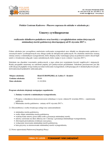 Polskie Centrum Kadrowo - Płacowe zaprasza do udziału w szkoleniu pt.: Umowy cywilnoprawne rozliczenie składkowo-podatkowe oraz korekty z uwzględnieniem zmian dotyczących minimalnej stawki godzinowej obowiązującej od 01 stycznia 2017 r. Celem szkolenia jest szczegółowe omówienie rozliczania wynagrodzeń oraz składek na ubezpieczenia społeczne z zawartych umów cywilnoprawnych oraz zbiegu tytułu do ubezpieczeń społecznych. Na szkoleniu omówione zostaną zmiany ustawy o minimalnym wynagrodzeniu, które obejmą osoby wykonujące pracę na podstawie umów zleceń bądź umów o świadczenie usług jak i samo zatrudnionych, które wejdą w życie z dniem 1 stycznia 2017 r. Szkolenie ma charakter warsztatów praktycznych, a jego celem jest wyjaśnienie kwestii wątpliwych i niejasnych. Każdy przypadek omawiany na szkoleniu poparty jest praktycznymi przykładami. Szkolenie przeznaczone jest dla osób chcących pogłębić swoją wiedzę na temat rozliczania wynagrodzeń, osób pracujących w działach płacowych jak i doświadczonych praktyków naliczania płac. Miejsce szkolenia: Hotel EUROPEJSKI, ul. Lubicz 5 - Kraków Godzina szkolenia: 09:00 Data szkolenia: 11.10.2016 Program szkolenia obejmuje następujące zagadnienia: I. Zmiany w ustawie o minimalnym wynagrodzeniu. 1. Przepisy o charakterze dostosowawczym wchodzące w życie z dniem 01 września 2016 r. - zamówienia publiczne. 2. Minimalna stawka godzinowa - zmiany od 01 stycznia 2017 r. 2.1 Zleceniobiorca i osoba świadcząca usługi oraz samozatrudnieni: minimalna stawka godzinowa, osoby objęte minimalną stawką godzinową, wykonywanie umowy przez kilka osób a gwarancja minimalnej stawki, umowy zawierane na okres dłuższy niż 1 miesiąc a gwarancja minimalnego wynagrodzenia, obowiązek prowadzenia ewidencji czasu pracy, wyłączenie stosowania minimalnej stawki godzinowej, kara grzywny za niestosowanie minimalnej stawki wynagrodzenia, 2.2 Nowe uprawnienia Państwowej Inspekcji Pracy: kontrola wypłacania wynagrodzenia w wysokości minimalnej. II. Rozliczenie składkowo – podatkowe w przypadku zbiegu tytułów do ubezpieczeń 1. Ogólne zasady podlegania ubezpieczeniom w przypadku zbiegu tytułów do ubezpieczeń społecznych. 2. Zgłoszenie i wyrejestrowanie z ubezpieczeń w przypadku zawarcia kilku umów zlecenia u tego samego zleceniodawcy. 3. Zbieg tytułów do ubezpieczeń na podstawie kilku zawartych umów zlecenia: rozpoczęcie wykonywania kilku umów zlecenia w różnych terminach, rozpoczęcie wykonywania kilku umów zlecenia w tym samym dniu, ustalenie łącznej podstawy wymiaru składek przy stawce godzinowej, akordowej, prowizyjnej, ustalenie łącznej podstawy wymiaru składek w przypadku wypłaty wynagrodzenia w miesiącu następnym, ustalenie łącznej podstawy wymiaru składek w przypadku wypłaty wynagrodzenia po zakończeniu zlecenia, brak wypłaty wynagrodzenia w danym miesiącu kalendarzowym, zmiana schematu podlegania ubezpieczeniom na wniosek zleceniobiorcy, objęcie ubezpieczeniami społecznymi w trakcie miesiąca kalendarzowego, przystąpienie do dobrowolnego ubezpieczenia chorobowego w trakcie miesiąca kalendarzowego, niezdolność do pracy w trakcie wykonywania kilku umów zlecenia przy stałej stawce wynagrodzenia, niezdolność do pracy w trakcie wykonywania kilku umów zlecenia przy zmiennych stawkach wynagrodzenia. 4. Zbieg tytułów do ubezpieczeń społecznych: umowa o pracę i umowa zlecenia umowa o pracę i jedna umowa zlecenia, umowa o pracę i kilka umów zlecenia, umowa o pracę z niepełnoetatowcem i umowa zlecenia bądź kilka umów. 5. Zbieg tytułów do ubezpieczeń społecznych: działalność gospodarcza i umowa zlecenia: ubezpieczenia społeczne z działalności gospodarczej, rozliczane na preferencyjnych zasadach a zawarcie dodatkowo umowy zlecenia, podwyższenie minimalnej podstawy składek a rozliczenie zawartej umowy zlecenia, ubezpieczenia społeczne z działalności gospodarczej rozliczane na zasadach ogólnych a zawarcie dodatkowo umowy zlecenia, umowa zlecenia zawarta w ramach prowadzonej działalności gospodarczej. 6. Zbieg tytułów do ubezpieczeń społecznych: rada nadzorcza i umowa zlecenia III. Korekta składek i podatku dochodowego 1. Korekta składek i podatku w związku z błędnym ustaleniem podstawy wymiaru. 2. Zakwalifikowanie umowy o dzieło jako umowy zlecenia. 3. Zapłata zaległych składek za zleceniobiorcę. 4. Zwrot przez zleceniobiorcę zapłaconych przez zleceniodawcę składek na ubezpieczenia. Cena szkolenia obejmuje: zajęcia dydaktyczne, materiały szkoleniowe przygotowane przez eksperta, dyplom ukończenia szkolenia, lunch, serwis kawowy. Rezerwacja wg kolejności zgłoszeń. Ilość miejsc ograniczona. W celu zgłoszenia udziału w szkoleniu należy wypełnić formularz zgłoszeniowy i przesłać go faksem na numer: (042) 683-21-25. Po otrzymaniu zgłoszenia odeślemy Państwu potwierdzenie przyjęcia rezerwacji. Dodatkowe informacje można uzyskać pod numerem (042) 235-30-60. Serdecznie zapraszamy. Powered by TCPDF (www.tcpdf.org) Rozpoczęcie szkolenia: 11.10.2016 09:00 Ilość godzin: 5 Miejsce szkolenia: Hotel EUROPEJSKI, ul. Lubicz 5 - Kraków Cena regularna uczestnictwa jednej osoby netto: 590,00 zł Cena regularna uczestnictwa jednej osoby brutto: 725,70 zł