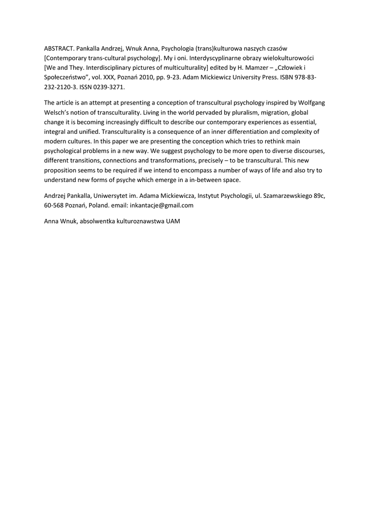 ABSTRACT. Pankalla Andrzej, Wnuk Anna, Psychologia (trans)kulturowa naszych czasów [Contemporary trans-cultural psychology]. My i oni. Interdyscyplinarne obrazy wielokulturowości [We and They. Interdisciplinary pictures of multiculturality] edited by H. Mamzer – „Człowiek i Społeczeństwo”, vol. XXX, Poznań 2010, pp. 9-23. Adam Mickiewicz University Press. ISBN 978-83232-2120-3. ISSN 0239-3271. The article is an attempt at presenting a conception of transcultural psychology inspired by Wolfgang Welsch’s notion of transculturality. Living in the world pervaded by pluralism, migration, global change it is becoming increasingly difficult to describe our contemporary experiences as essential, integral and unified. Transculturality is a consequence of an inner differentiation and complexity of modern cultures. In this paper we are presenting the conception which tries to rethink main psychological problems in a new way. We suggest psychology to be more open to diverse discourses, different transitions, connections and transformations, precisely – to be transcultural. This new proposition seems to be required if we intend to encompass a number of ways of life and also try to understand new forms of psyche which emerge in a in-between space. Andrzej Pankalla, Uniwersytet im. Adama Mickiewicza, Instytut Psychologii, ul. Szamarzewskiego 89c, 60-568 Poznań, Poland. email: [email protected] Anna Wnuk, absolwentka kulturoznawstwa UAM