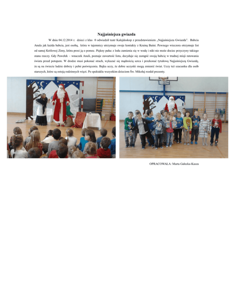 Najjaśniejsza gwiazda W dniu 04.12.2014 r. dzieci z klas 0 odwiedził teatr Kalejdoskop z przedstawieniem „Najjaśniejsza Gwiazda”. Babcia Anula jak każda babcia, jest osobą, która w tajemnicy utrzymuje swoje kontakty z Krainą Baśni. Pewnego wieczora otrzymuje list od samej Królowej Zimy, która prosi ją o pomoc. Piękny pałac z lodu zamienia się w wodę i nikt nie może dociec przyczyny takiego stanu rzeczy. Gdy Pawełek – wnuczek Anuli, poznaje zawartość listu, decyduje się zastąpić swoją babcię w trudnej misji ratowania świata przed potopem. W drodze musi pokonać strach, wykazać się mądrością serca i przekonać tytułową Najjaśniejszą Gwiazdę, że są na świecie ludzie dobrzy i pełni poświęcenia. Bajka uczy, że dobre uczynki mogą zmienić świat. Uczy też szacunku dla osób starszych, które są ostoją rodzinnych więzi. Po spektaklu wszystkim dzieciom Św. Mikołaj rozdał prezenty. OPRACOWAŁA: Marta Gałecka-Kasza