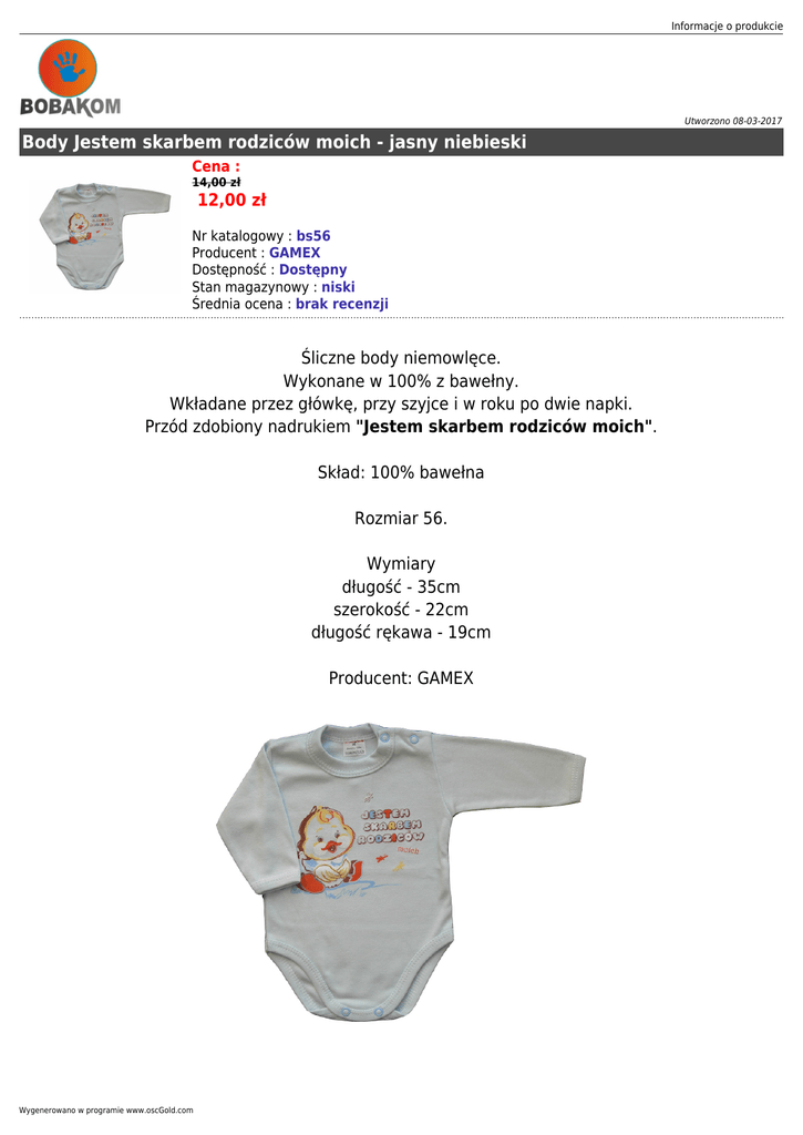Informacje o produkcie Utworzono 08-03-2017 Body Jestem skarbem rodziców moich - jasny niebieski Cena : 14,00 zł 12,00 zł Nr katalogowy : bs56 Producent : GAMEX Dostępność : Dostępny Stan magazynowy : niski Średnia ocena : brak recenzji Śliczne body niemowlęce. Wykonane w 100% z bawełny. Wkładane przez główkę, przy szyjce i w roku po dwie napki. Przód zdobiony nadrukiem "Jestem skarbem rodziców moich". Skład: 100% bawełna Rozmiar 56. Wymiary długość - 35cm szerokość - 22cm długość rękawa - 19cm Producent: GAMEX Wygenerowano w programie www.oscGold.com Dostępne opcje Body Jestem skarbem rodziców moich - jasny niebieski » kolor: niebieski.