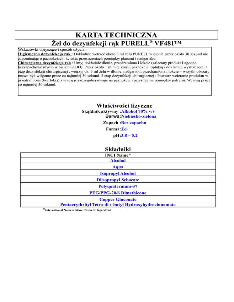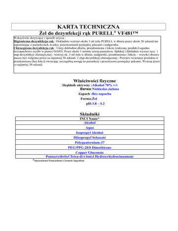 KARTA TECHNICZNA Żel do dezynfekcji rąk PURELL® VF481™ Wskazówki dotyczące i sposób użycia : Higieniczna dezynfekcja rak : Dokładnie wetrzeć około 3 ml żelu PURELL w dłonie przez około 30 sekund nie zapominając o paznokciach, kciuku, przestrzeniach pomiędzy placami i nadgarstku. Chirurgiczna dezynfekcja rak : Umyj dokładnie dłonie, przedramiona i łokcie (zalecany produkt Łagodne, bezzapachowe mydło w piance GOJO). Przez około 1 minutę szoruj paznokcie. Spłukaj i dokładnie wysusz ręce. 1 etap dezynfekcji chirurgicznej : wetrzyj ok. 3 ml żelu w dłonie, nadgarstki, przedramiona i łokcie – wszytki obszary musza być wilgotne przez co najmniej 30 sekund. 2 etap dezynfekcji chirurgicznej : Powtórz wcieranie produktu w przedramiona (bez łokci) zwracając szczególną uwagę na paznokcie i przestrzenie pomiędzy palcami. Wcieraj przez co najmniej 30 sekund. Właściwości fizyczne Skąldnik aktywny :Alkohol 70% v/v Barwa:Niebiesko-zielona Zapach :Bez zapachu Forma:Żel pH:3.8 – 5.2 Składniki INCI Name* Alcohol Aqua Isopropyl Alcohol Diisopropyl Sebacate Polyquaternium-37 PEG/PPG-20/6 Dimethicone Copper Gluconate Pentaerythrityl Tetra-di-t-butyl Hydroxyhydrocinnamate *International Nomenclature Cosmetic Ingredient Wyniki badań na podrażnienia i uczulenia powodowane przez 21 dniowy test kumulatywny Cel : Opis testu : Ocena podrażnień skóry u ludzi. Próbki były aplikowane każdego dnia z wyjątkiem niedziel przez 3 kolejne tygodnie. Wyniki były zbierane i zapisywane codziennie. Próbki z wizyt poniedziałkowych były zapisywane jako wyniki niedzielne co daje ciągłość testu 21-dniowego Laboratorium wykonujące test : Data: RCTS, INC. Irving, Texas USA Wyniki : Wnioski : Średni wynik = 0.07 (skala 0 – 4); Nie wystąpiły podrażnienia . Łagodny dla skóry rąk. Produkt nie wykazuje tendencji do podrażniania skóry. 14 czerwiec 2007 Test tolerancji po powtarzanej aplikacji Cel : Określenie ewentualności wystąpienia podrażnienia lub uczulenia. Opis testu : Test tolerancji po powtarzanej aplikacji Laboratorium wykonujące Clinical Research Laboratories, Inc., Piscataway, New Jersey test : USA Data: 3 maj 2007 Wyniki : Wnioski : Podczas żadnej z faz testu nie zaobserwowano negatywnych reakcji skóry. Testowany produkt nie stanowi potencjalnego zagrożenia wywołania podrażnienia lub uczulenia skóry. Test częstego użycia Cel : Opis testu : Ocena reakcji skóry przy bardzo częstym używaniu Podczas testu preparat był aplikowany na ręce 25 razy dziennie przez 4 kolejne dni aby zasymulować warunki służby zdrowia. Każdego dnia zbadane zostało nawilżenie skóry (korneometr), poziom utraty wody przez skórę, występowanie rumienia, suchości skóry. Jednocześnie uczestnicy sami oceniali stopień zaczerwienienia, suchości, napięcia skóry oraz ogólny stan skóry rak. Laboratorium wykonujące test : Data: RCTS, INC. Irving, Texas USA Wyniki : Badanie korneometrem oraz badanie poziomu utraty wody przez skórę wskazuje że po 100 użyciach PURELL® VF481™ nie występują zmiany w nawilżeniu skóry. Nie pojawiły się objawy rumienia i suchości skóry. Podczas samooceny uczestnicy ocenili ze nawilżenie skóry się poprawiło po około 50 użyciach. Uczestnicy nie zaobserwowali pojawienia się zaczerwienień ani zwiększonego napięcia skóry. Wnioski : Rezultaty wskazują, że regularne, częste używanie PURELL® VF481™ poprawia stan skóry rąk. 2 lipiec 2007 Badania skuteczności – Normy Europejskie EN 14476:2005 Cel : Opis testu : Laboratorium wykonujące test : Data: Wnioski : Ocean skuteczności przeciwko adenovirus typ 5. EN 14476:2005: Ilościowa zawiesinowa metoda określania wirusobójczego działania chemicznych środków dezynfekcyjnych i antyseptycznych stosowanych w obszarze medycznym (faza 2, etap 1) MikroLab GmbH, Bremen, Germany 29 czerwiec 2007 Zgodnie z wymaganiami normy EN 14476:2005, produkt wykazuje skuteczność przeciwko adenovirus typ 5 po 60 sekundach. W związku z tym można uznać że produkt jest skuteczny przeciwko adenovirus typ 5. EN 14476:2005 Cel : Opis testu : Laboratorium wykonujące test : Data: Wnioski : Ocean skuteczności przeciwko poliovirus type 1. EN 14476:2005: Ilościowa zawiesinowa metoda określania wirusobójczego działania chemicznych środków dezynfekcyjnych i antyseptycznych stosowanych w obszarze medycznym (faza 2, etap 1) MikroLab GmbH, Bremen, Germany 29 czerwiec 2007 Zgodnie z wymaganiami normy EN 14476:2005, produkt wykazuje skuteczność przeciwko poliovirus type 1 po 90 sekundach. W związku z tym można uznać że produkt jest skuteczny przeciwko poliovirus type 1 EN 13727 Cel : Opis testu : Laboratorium wykonujące test : Data: Wnioski : Ocena skuteczności przeciwko bakteriom. EN 13727 Ilościowa zawiesinowa metoda określania bakteriobójczego działania chemicznych środków przeznaczonych do dezynfekcji w obszarze medycznym –(faza 2, etap 1) HygCen Centrum für Hygiene und medizinische Produktsicherhelt GmbH, Schwerin, Germany 8 sierpnia 2007 Zgodnie z normą EN 13727, produkt posiada właściwości bakteriobójcze w warunkach czystych (0.03% albuminy) w 15 sekund w 20°C dla szczepów referencyjnych Staphylococcus aureus ATCC 6538, Enterococcus hirae ATCC 10541, Escherichia coli NCTC 10538 i Pseudomonas aeruginosa ATCC 15442 w roztworze 80% i 75% (v/v) w wodzie destylowanej. EN 1040 Cel : Opis testu : Laboratorium wykonujące test : Data: Wnioski : Ocena skuteczności przeciwko bakteriom. EN 1040 : Chemiczne środki dezynfekcyjne i antyseptyczne. Podstawowe działanie bakteriobójcze. Metoda badania i wymagania (faza 1) HygCen Centrum für Hygiene und medizinische Produktsicherhelt GmbH, Schwerin, Germany 8 maja 2007 Zgodnie z EN 1040 produkt posiada produkt posiada właściwości bakteriobójcz w 20°C w czasie 30 sekund dla szczepów referencyjnych Staphylococcus aureus ATCC 6538 i Pseudomonas aeruginosa ATCC 15442 w roztworze 90% i 50% (v/v) w wodzie destylowa
