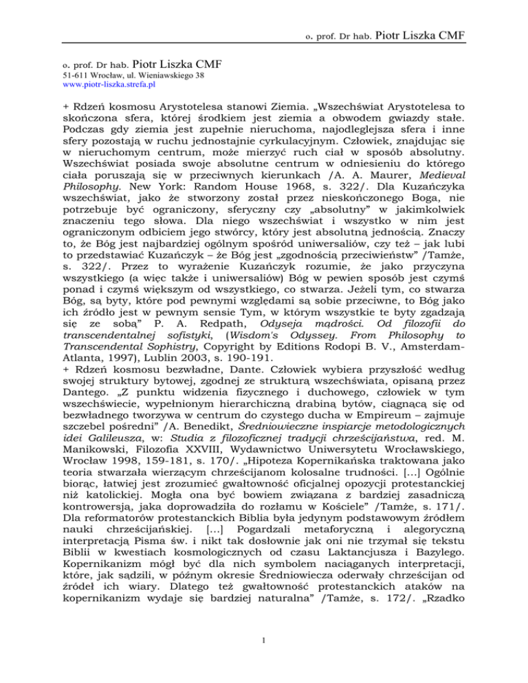 o. prof. Dr hab. Piotr Liszka CMF o. prof. Dr hab. Piotr Liszka CMF 51-611 Wrocław, ul. Wieniawskiego 38 www.piotr-liszka.strefa.pl + Rdzeń kosmosu Arystotelesa stanowi Ziemia. „Wszechświat Arystotelesa to skończona sfera, której środkiem jest ziemia a obwodem gwiazdy stałe. Podczas gdy ziemia jest zupełnie nieruchoma, najodleglejsza sfera i inne sfery pozostają w ruchu jednostajnie cyrkulacyjnym. Człowiek, znajdując się w nieruchomym centrum, może mierzyć ruch ciał w sposób absolutny. Wszechświat posiada swoje absolutne centrum w odniesieniu do którego ciała poruszają się w przeciwnych kierunkach /A. A. Maurer, Medieval Philosophy. New York: Random House 1968, s. 322/. Dla Kuzańczyka wszechświat, jako że stworzony został przez nieskończonego Boga, nie potrzebuje być ograniczony, sferyczny czy „absolutny” w jakimkolwiek znaczeniu tego słowa. Dla niego wszechświat i wszystko w nim jest ograniczonym odbiciem jego stwórcy, który jest absolutną jednością. Znaczy to, że Bóg jest najbardziej ogólnym spośród uniwersaliów, czy też – jak lubi to przedstawiać Kuzańczyk – że Bóg jest „zgodnością przeciwieństw” /Tamże, s. 322/. Przez to wyrażenie Kuzańczyk rozumie, że jako przyczyna wszystkiego (a więc także i uniwersaliów) Bóg w pewien sposób jest czymś ponad i czymś większym od wszystkiego, co stwarza. Jeżeli tym, co stwarza Bóg, są byty, które pod pewnymi względami są sobie przeciwne, to Bóg jako ich źródło jest w pewnym sensie Tym, w którym wszystkie te byty zgadzają się ze sobą” P. A. Redpath, Odyseja mądrości. Od filozofii do transcendentalnej sofistyki, (Wisdom's Odyssey. From Philosophy to Transcendental Sophistry, Copyright by Editions Rodopi B. V., AmsterdamAtlanta, 1997), Lublin 2003, s. 190-191. + Rdzeń kosmosu bezwładne, Dante. Człowiek wybiera przyszłość według swojej struktury bytowej, zgodnej ze strukturą wszechświata, opisaną przez Dantego. „Z punktu widzenia fizycznego i duchowego, człowiek w tym wszechświecie, wypełnionym hierarchiczną drabiną bytów, ciągnącą się od bezwładnego tworzywa w centrum do czystego ducha w Empireum – zajmuje szczebel pośredni” /A. Benedikt, Średniowieczne inspiarcje metodologicznych idei Galileusza, w: Studia z filozoficznej tradycji chrześcijaństwa, red. M. Manikowski, Filozofia XXVIII, Wydawnictwo Uniwersytetu Wrocławskiego, Wrocław 1998, 159-181, s. 170/. „Hipoteza Kopernikańska traktowana jako teoria stwarzała wierzącym chrześcijanom kolosalne trudności. […] Ogólnie biorąc, łatwiej jest zrozumieć gwałtowność oficjalnej opozycji protestanckiej niż katolickiej. Mogła ona być bowiem związana z bardziej zasadniczą kontrowersją, jaka doprowadziła do rozłamu w Kościele” /Tamże, s. 171/. Dla reformatorów protestanckich Biblia była jedynym podstawowym źródłem nauki chrześcijańskiej. […] Pogardzali metaforyczną i alegoryczną interpretacją Pisma św. i nikt tak dosłownie jak oni nie trzymał się tekstu Biblii w kwestiach kosmologicznych od czasu Laktancjusza i Bazylego. Kopernikanizm mógł być dla nich symbolem naciąganych interpretacji, które, jak sądzili, w późnym okresie Średniowiecza oderwały chrześcijan od źródeł ich wiary. Dlatego też gwałtowność protestanckich ataków na kopernikanizm wydaje się bardziej naturalna” /Tamże, s. 172/. „Rzadko 1 o. prof. Dr hab. Piotr Liszka CMF podnosi się kwestie, że potępienie heliocentryzmu przyniosło Kościołowi wielkie szkody” /Tamże, s. 174. + Rdzeń kosmosu Chrystus „Aspekty chrystologii przedmiotowy i podmiotowy. Jezus Chrystus jest nie tylko przedmiotem chrystologii uniwersalnej, ale i podmiotem, choć ten drugi aspekt jest trudniej uchwytny i zarazem słabiej opracowany, chyba najlepiej przez mistyków. Sam dogmat chrystologiczny stanowi jedynie odcinek chrystologii powszechnej, przedmiotowej i podmiotowej. Chrystologia uniwersalna obejmuje rozwój Bytu Chrystusa (esse Christi) jako „struktury” świata i ośrodka ludzkości, i w tym sensie „Chrystus staje się coraz większy i coraz bardziej Zasadą Wszechświata i Wszechdziejów” (P. Teilhard de Chardin). Chodzi tu głównie o rozwój Kościoła Chrystusa. Jednocześnie następuje pewien rozwój świadomości ludzkiej o Chrystusie, miłości do Niego, kultury chrześcijańskiej i całej praktyki ludzkiej, związanej z tą Postacią. Tymi drogami ludzkość coraz bardziej zapodmiotowuje się niejako w Chrystusie, zwłaszcza poprzez Kościół. Chrystus jako Byt pro-ludzki jest współrozciągły względem całej historii ludzkiej: Ciało Jezusa z Nazaretu, Ciało-Kościół, przed-Ciało – Kahal Jahwe, po-Ciało – cała przyszłość Ducha. Jednocześnie główna tematyka ludzkości ześrodkowuje się na osobowym „Ja” Chrystusa. Od pierwszej grupy ludzkiej na ziemi rodziła się antycypacja poznania Chrystusa na kształt pierwszych promyków, które w momencie Wcielenia miały się zlać w jedno Światło Chrystyczne. W „pełni czasu1' (Ga 4, 4) przyszło subsystentne zaistnienie samoświadomości mesjańskiej w Jezusie: samopoznanie się jako Mesjasza i Odkupiciela (W. Kwiatkowski, Ph. Kaiser, J. Galot, B. Radomski, W. Hładowski, J. Marias, B. Forte). Następnie przyszło rozpoznanie samoświadomości i samorealizacji Jezusa Chrystusa ze strony Jego Eklezji jako rodzaj chrystycznej świadomości społecznej. Tu wreszcie rodzi się pytanie, czy i na ile cały proces podmiotowy historii nie jest dalszym ciągiem tegoż procesu chrystogenetycznego, zmierzającego do absolutnego samopoznania się ludzkości w Jezusie Chrystusie i zarazem samopoznania się Jezusa w historii jako Chrystusa ludzkości i świata. I tak w perspektywie mistycznej człowiek żyje i realizuje się w Jezusie Chrystusie jako podmiocie i pod firmamentem Osoby Syna Bożego” /Cz. S. Bartnik, Dogmatyka Katolicka, t. 1, Redakcja Wydawnictw KUL, Lublin 1999, s. 608. + Rdzeń kosmos