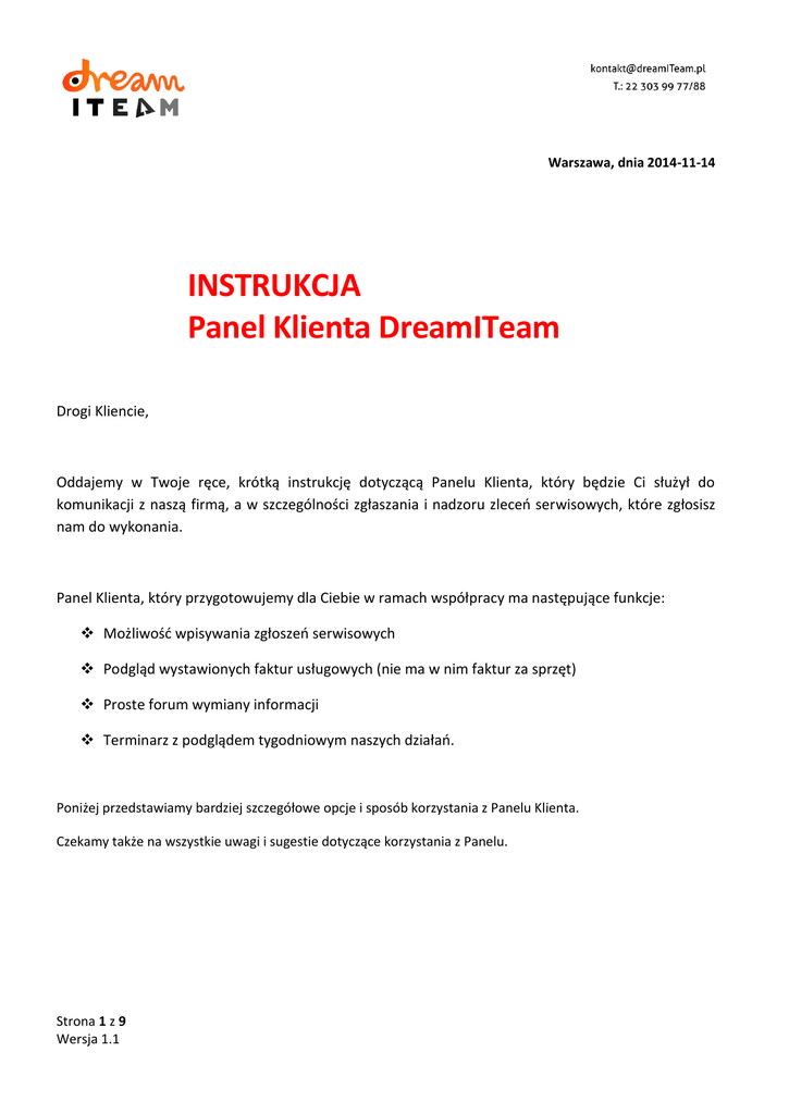 Warszawa, dnia 2014-11-14 INSTRUKCJA Panel Klienta DreamITeam Drogi Kliencie, Oddajemy w Twoje ręce, krótką instrukcję dotyczącą Panelu Klienta, który będzie Ci służył do komunikacji z naszą firmą, a w szczególności zgłaszania i nadzoru zleceń serwisowych, które zgłosisz nam do wykonania. Panel Klienta, który przygotowujemy dla Ciebie w ramach współpracy ma następujące funkcje: Możliwość wpisywania zgłoszeń serwisowych Podgląd wystawionych faktur usługowych (nie ma w nim faktur za sprzęt) Proste forum wymiany informacji Terminarz z podglądem tygodniowym naszych działań. Poniżej przedstawiamy bardziej szczegółowe opcje i sposób korzystania z Panelu Klienta. Czekamy także na wszystkie uwagi i sugestie dotyczące korzystania z Panelu. Strona 1 z 9 Wersja 1.1 Terminarz: W terminarzu widać wszystkie zgłoszenia w układzie kalendarza. Można zaobserwować dwa rodzaje zgłoszeń: 1. Różowe kafelki przestawiają zgłoszenia planowane 2. Czerwone kafelki przedstawiają zgłoszenia zrealizowane Zgłoszenia: Lista zgłoszeń serwisowych i możliwość ich zgłaszania, monitorowania i w przyszłości akceptowania to najważniejsza możliwość Panelu Klienta. Sekcja zgłoszenia domyślnie zawiera widok wszystkich zgłoszeń serwisowych. Zgłoszenia posortowane są według statusu zgłoszenia. Najwyżej na liście znajdują się zgłoszenia ze statusem zgłoszone, czyli zgłoszenia jeszcze nie przejęte przez DreamITeam. Poniżej będą zgłoszenia ze statusami: Prośba o dodatkowe informacje Jeśli zgłoszenie było niejasne dla InfoMagików mogą oni poprosić o dodatkowe informacje Analiza Jeśli rozwiązanie problemu wymaga więcej czasu InfoMagicy mogą ustawić taki status. Przekazano firmie zewnętrznej Jeśli Twój sprzęt wymaga odesłania do serwisu firmy trzeciej. Rozwiązanie tymczasowe Jeśli InfoMagicy zastosowali rozwiązanie zastępczo-prowizoryczne na czas rozwiązania problemu. Strona 2 z 9 Wersja 1.1 Reklamacja Jeśli coś zostało uznane jako reklamacja. Rozwiązanie ostateczne Zadanie zostało wykonane do końca. Ten ekran zgłoszeń umożliwia wejście w każde ze zgłoszeń klikając na numer zgłoszenia. Na ekranie zgłoszenia widzimy więcej informacji, a w szczególności: Wpisujący: Osoba wpisująca zgłoszenie – może to być pracownik DreamITeam, jeśli nie miałeś możliwości wpisać zgłoszenia samodzielnie. Numer zgłoszenia: kolejny numer zgłoszenia Data wprowadzenia: kiedy zgłoszenie zostało wprowadzone do systemu Data planowanej realizacji: na kiedy przewidziana jest realizacja zgłoszenia Data realizacji: kiedy zgłoszenie zostało faktycznie zrealizowane Rodzaj usługi: Serwis u klienta Jeśli do naprawy sprzętu doszło w siedzibie klienta Serwis u klienta zdalny Jeśli pomoc udzielona została za pomocą pulpitu zdalnego Serwis lokalny Gdy sprzęt klienta został naprawiony w serwisie Dojazd do klienta Jak w nazwie Strona 3 z 9 Wersja 1.1 Usługa bezpłatna Gdy naprawa zajęła tylko kilka minut – w przypadku serwisu zdalnego mniej niż 10 Serwis Expert Gdy Pomoc klientowi wymagała niebywałej wiedzy oraz zaangażowania Usługa doradcza Pomoc klientowi w wyborze odpowiednich rozwiązań do jego potrzeb oraz rozwianie wątpliwości Wypożyczenie sprzętu zastępczego Wypożyczenie laptopa lub komputera w na określony czas Jednostka zlecająca: jednostka organizacyjna klienta zlecająca nam prace Status: etap realizacji na którym znajduje się obecnie zgłoszenie – statusy wyjaśniono na początku tego punktu Osoba zlecająca: Osoba w firmie klienta zlecająca nam zajęcie się zgłoszeniem Adres: Siedziba jednostki organizacyjnej danej firmy której zgłoszenie dotyczy Wykonawcy: Którzy z naszych pracowników zajmowali się zgłoszeniem Placówka DIT: Który wydział DreamITeam zajmował się zgłoszeniem: Centrala Serwis lokalny I Linia wsparcia Pomoc zdalna, II Linia wsparcia Serwis u klienta – opiekunowie klienta Expert Gdy sprawa jest tak zawiła, iż zajmuje się nią nasz firmowy Ekspert Opiekun DIT: Pracownik DIT przeznaczony do opieki nad klientem – główna osoba do kontaktu Strona 4 z 9 Wersja 1.1 Kliknięcie na numer zgłoszenia przenosi nas do okna z bardziej szczegółowymi informacjami dotyczącymi wybranego zgłoszenia. W górnej części podobnie jak na głównym ekranie zgłoszeń widoczne są informacje dotyczące konkretnego zgłoszenia. Są one jednak nieco uszczegółowione. Pracownik zlecający: sekcja wzbogacona o dane kontaktowe Opis zgłoszenia: element nieobecny na głównym ekranie – krótki opis problemu będącego przedmiotem zgłoszenia W prawym górnym rogu znajduje się zakładka Dokumenty Po kliknięciu na Dodaj otworzy się okno z możliwością dodania do zgłoszenia dowolnego dokumentu wraz z opisem Aby dodać plik klikamy Przeglądaj i wybieramy jego lokalizację W polu o nazwie opis można zamieścić jeszcze notatkę czego dotyczy dokument Strona 5 z 9 Wersja 1.1 Aby zakończyć należy kliknąć dodaj Poniżej środka okna zgłoszenia znajduje się sekcja o nazwie: Kalkulacja- dotycząca rozliczeń z klientem za widoczne zgłoszenie Ilość serwisantów – ilość pracowników DIT których udział był konieczny do zakończenia zgłoszenia Wykonawcy – imiona oraz nazwiska serwisantów którzy pracowali przy zgłoszeniu Strona 6 z 9 Wersja 1.1 Rodzaj usługi – ten sam który widoczny jest na ekranie głównym zgłoszeń (na przykładzie Serwis u klienta zdalny) Data realizacji – podobnie jak na głównym ekranie zgłoszeń tyle że uszczegółowiona o czas w jakim doszło do realizacji zgłoszenia Pola zaznaczenia expres oraz poza godzinami pracy – związane z dodatkowymi kosztami jakie ponosi klient (chyba że umowa stanowi inaczej) – rodzaje usługi gdy do realizacji dochodzi natychmiast lub na życzenie klienta poza godzinami pracy. Opis wykonywanych prac: streszczenie czynności wykonanych przez pracownika DIT w celu realizacji zgłoszenia Liczb