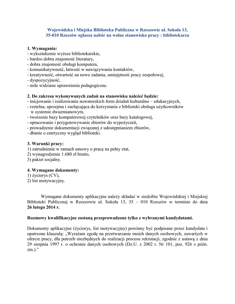 Wojewódzka i Miejska Biblioteka Publiczna w Rzeszowie ul. Sokoła 13, 35-010 Rzeszów ogłasza nabór na wolne stanowisko pracy : bibliotekarza 1. Wymagania: - wykształcenie wyższe bibliotekarskie, - bardzo dobra znajomość literatury, - dobra znajomość obsługi komputera, - komunikatywność, łatwość w nawiązywaniu kontaktów, - kreatywność, otwartość na nowe zadania, umiejętność pracy zespołowej, - dyspozycyjność, - mile widziane uprawnienia pedagogiczne. 2. Do zakresu wykonywanych zadań na stanowisku należeć będzie: - inicjowanie i realizowanie nowatorskich form działań kulturalno – edukacyjnych, - rzetelna, uprzejma i zachęcająca do korzystania z biblioteki obsługa użytkowników w systemie dwuzmianowym, - tworzenie bazy komputerowej czytelników oraz bazy katalogowej, - opracowanie i przygotowywanie zbiorów do wypożyczeń, - prowadzenie dokumentacji związanej z udostępnianiem zbiorów, - dbanie o estetyczny wygląd biblioteki. 3. Warunki pracy: 1) zatrudnienie w ramach umowy o pracę na pełny etat, 2) wynagrodzenie 1.680 zł brutto, 3) pakiet socjalny. 4. Wymagane dokumenty: 1) życiorys (CV), 2) list motywacyjny. Wymagane dokumenty aplikacyjne należy składać w siedzibie Wojewódzkiej i Miejskiej Biblioteki Publicznej w Rzeszowie ul. Sokoła 13, 35 – 010 Rzeszów w terminie do dnia 26 lutego 2014 r. Rozmowy kwalifikacyjne zostaną przeprowadzone tylko z wybranymi kandydatami. Dokumenty aplikacyjne (życiorys, list motywacyjny) powinny być podpisane przez kandydata i opatrzone klauzulą: „Wyrażam zgodę na przetwarzanie moich danych osobowych, zawartych w ofercie pracy, dla potrzeb niezbędnych do realizacji procesu rekrutacji, zgodnie z ustawą z dnia 29 sierpnia 1997 r. o ochronie danych osobowych (Dz.U. z 2002 r. Nr 101, poz. 926 z późn. zm.).”