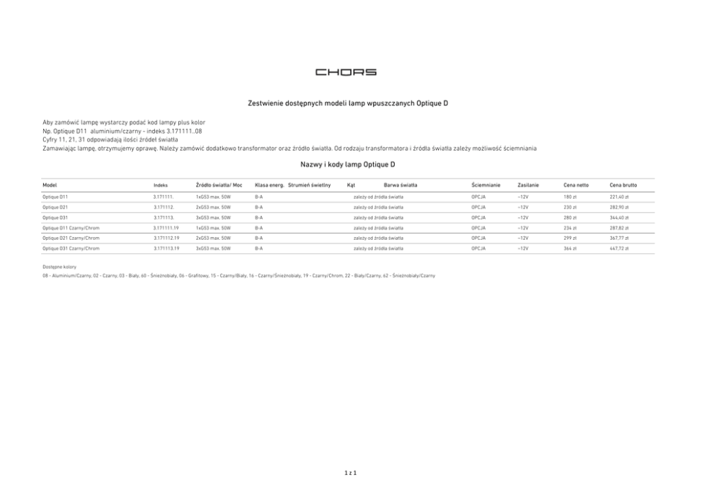Zestwienie dostępnych modeli lamp wpuszczanych Optique D Aby zamówić lampę wystarczy podać kod lampy plus kolor Np. Optique D11 aluminium/czarny - indeks 3.171111..08 Cyfry 11, 21, 31 odpowiadają ilości źródeł światła Zamawiając lampę, otrzymujemy oprawę. Należy zamówić dodatkowo transformator oraz źródło światła. Od rodzaju transformatora i źródła światła zależy możliwość ściemniania Nazwy i kody lamp Optique D Model Indeks Źródło światła/ Moc Klasa energ. Strumień świetlny Ściemnianie Zasilanie Cena netto Cena brutto Optique D11 3.171111. 1xG53 max. 50W B-A Kąt zależy od źródła światła Barwa światła OPCJA ~12V 180 zł 221,40 zł Optique D21 3.171112. 2xG53 max. 50W B-A zależy od źródła światła OPCJA ~12V 230 zł 282,90 zł Optique D31 3.171113. 3xG53 max. 50W B-A zależy od źródła światła OPCJA ~12V 280 zł 344,40 zł Optique D11 Czarny/Chrom 3.171111.19 1xG53 max. 50W B-A zależy od źródła światła OPCJA ~12V 234 zł 287,82 zł Optique D21 Czarny/Chrom 3.171112.19 2xG53 max. 50W B-A zależy od źródła światła OPCJA ~12V 299 zł 367,77 zł Optique D31 Czarny/Chrom 3.171113.19 3xG53 max. 50W B-A zależy od źródła światła OPCJA ~12V 364 zł 447,72 zł Dostępne kolory 08 - Aluminium/Czarny, 02 - Czarny, 03 - Biały, 60 - Śnieżnobiały, 06 - Grafitowy, 15 - Czarny/Biały, 16 - Czarny/Śnieżnobiały, 19 - Czarny/Chrom, 22 - Biały/Czarny, 62 - Śnieżnobiały/Czarny 1 z 1