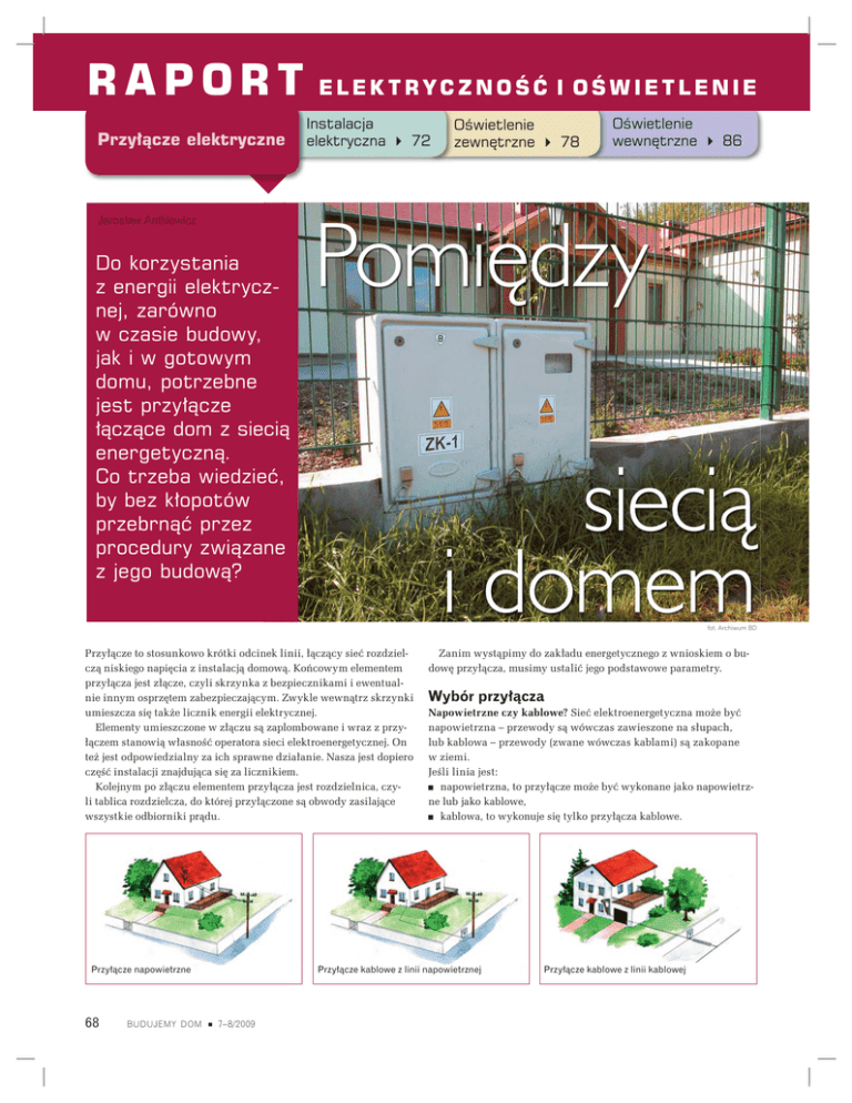 RAPORT RAPORT ElektrycznoĂÊ i oĂwietlenie PrzyïÈcze elektryczne Jarosïaw Antkiewicz Do korzystania z energii elektrycznej, zarówno w czasie budowy, jak i w gotowym domu, potrzebne jest przyïÈcze ïÈczÈce dom z sieciÈ energetycznÈ. Co trzeba wiedzieÊ, by bez kïopotów przebrnÈÊ przez procedury zwiÈzane z jego budowÈ? ELEKTRYCZNO¥m I O¥WIETLENIE Instalacja elektryczna 72 OĂwietlenie zewnÚtrzne 78 OĂwietlenie wewnÚtrzne 86 PomiÚdzy sieciÈ i domem fot. Archiwum BD PrzyïÈcze to stosunkowo krótki odcinek linii, ïÈczÈcy sieÊ rozdzielczÈ niskiego napiÚcia z instalacjÈ domowÈ. Koñcowym elementem przyïÈcza jest zïÈcze, czyli skrzynka z bezpiecznikami i ewentualnie innym osprzÚtem zabezpieczajÈcym. Zwykle wewnÈtrz skrzynki umieszcza siÚ takĝe licznik energii elektrycznej. Elementy umieszczone w zïÈczu sÈ zaplombowane i wraz z przyïÈczem stanowiÈ wïasnoĂÊ operatora sieci elektroenergetycznej. On teĝ jest odpowiedzialny za ich sprawne dziaïanie. Nasza jest dopiero czÚĂÊ instalacji znajdujÈca siÚ za licznikiem. Kolejnym po zïÈczu elementem przyïÈcza jest rozdzielnica, czyli tablica rozdzielcza, do której przyïÈczone sÈ obwody zasilajÈce wszystkie odbiorniki prÈdu. PrzyïÈcze napowietrzne 68 BUDUJEMY DOM Zanim wystÈpimy do zakïadu energetycznego z wnioskiem o budowÚ przyïÈcza, musimy ustaliÊ jego podstawowe parametry. Wybór przyïÈcza Napowietrzne czy kablowe? SieÊ elektroenergetyczna moĝe byÊ napowietrzna – przewody sÈ wówczas zawieszone na sïupach, lub kablowa – przewody (zwane wówczas kablami) sÈ zakopane w ziemi. JeĂli linia jest: napowietrzna, to przyïÈcze moĝe byÊ wykonane jako napowietrzne lub jako kablowe, kablowa, to wykonuje siÚ tylko przyïÈcza kablowe. PrzyïÈcze kablowe z linii napowietrznej 7–8/2009 PrzyïÈcze kablowe z linii kablowej PrzyïÈcze elektryczne PrzyïÈczenie do sieci energetycznej wymaga zaïatwienia pewnych formalnoĂci. Nieuniknione sÈ wydatki, a niekiedy trzeba teĝ wykazaÊ sporo determinacji. Pierwszym krokiem jest ustalenie, wïaĂciwego dla lokalizacji naszej dziaïki zakïadu energetycznego, czyli firmy zajmujÈcej siÚ dystrybucjÈ energii (tzw. operatora systemu dystrybucyjnego). Drugi krokiem jest zïoĝenie wniosku o podanie warunków przyïÈczenia. Moĝna go wysïaÊ pocztÈ, zïoĝyÊ osobiĂcie lub powierzyÊ to zadanie upowaĝnionej osobie. W praktyce lepiej jednak nie robiÊ tego za poĂrednictwem poczty, bo wystarczy drobny bïÈd w formularzu, by wniosek zostaï do nas odesïany. Ponadto w razie wÈtpliwoĂci moĝemy liczyÊ na pomoc osób przyjmujÈcych wnioski, a gdy siÚ wypeïnia wniosek samemu, nietrudno o pomyïkÚ. Tym bardziej ĝe nie ma jednego wzoru wniosku obowiÈzujÈcego w caïym kraju, w róĝnych zakïadach energetycznych wymagany moĝe byÊ teĝ nieco inny zestaw zaïÈczników, choÊ wszÚdzie konieczny bÚdzie dokument potwierdzajÈcy tytuï prawny do nieruchomoĂci, np. akt wïasnoĂci dziaïki oraz plan zabudowy lub szkic sytuacyjny, okreĂlajÈcy poïoĝenie budynku wzglÚdem istniejÈcej sieci oraz sÈsiednich zabudowañ. W ciÈgu 14 dni powinniĂmy otrzymaÊ decyzjÚ okreĂlajÈcÈ warunki przyïÈczenia. Zakïad energetyczny bardzo czÚsto przedstawia wówczas projekt umowy o przyïÈczenie, zawierajÈcej przewidywane wysokoĂci opïat za przyïÈczenie, terminy realizacji poszczególnych jej punktów itp. informacje. Podpisanie umowy nie oznacza wcale, ĝe rychïo bÚdziemy mieÊ prÈd na dziaïce. Czas oczekiwania na przygotowanie dokumentacji technicznej oraz wykonanie przyïÈcza wynosi zazwyczaj póï roku, choÊ bywa teĝ, ĝe trwa to znacznie dïuĝej. Dlatego lepiej co pewien czas przypominaÊ o sobie pracownikom zakïadu energetycznego, by nasza sprawa nie zostaïa zapomniana. ChoÊ linie napowietrzne wciÈĝ dominujÈ na obszarach pozamiejskich, to nawet tam w ostatnich latach coraz czÚĂciej wykonuje siÚ przyïÈcza kablowe. O rodzaju przyïÈcza ostatecznie decyduje firma bÚdÈca operatorem sieci. Wykonanie linii napowietrznych jest tañsze, jednak sÈ one bardziej naraĝone na uszkodzenia (burze, wichury, Ănieg). Ponadto nieco kïopotów moĝe przysporzyÊ wymóg zachowania minimalnych odlegïoĂci pomiÚdzy przewodami przyïÈcza a otworami okiennymi, balkonem czy kominem. Z tych wzglÚdów, jeĂli mamy moĝJeĂli dysponujemy tylko prowizorycznym liwoĂÊ wyboru, lepiej zdecy- przyïÈczem budowlanym, to po zakoñczeniu budowy bÚdziemy musieli powtórzyÊ caïÈ dowaÊ siÚ na przyïÈcze kaprocedurÚ zwiÈzanÈ z przyïÈczeniem do sieci blowe. Gdy trasa przyïÈcza przebiega przez cudzÈ dziaïkÚ, musimy siÚ jednak upewniÊ, czy jej wïaĂciciel zgodzi siÚ na to, by prace z tym zwiÈzane zostaïy na jego terenie. fot. M. Bïaĝejewski FormalnoĂci Tymczasowe czy docelowe? PrzyïÈcze moĝe byÊ tymczasowe, przewidziane do uĝytkowania tylko w czasie budowy i dlatego nazywane przyïÈczem budowlanym (tzw. prowizorka), lub docelowe, z którego bÚdziemy korzystaÊ równieĝ w gotowym domu. Rodzaj przyïÈcza musimy okreĂliÊ we wniosku o warunki przyïÈczenia. JeĂli wybierzemy przyïÈcze: docelowe – zostaniemy przypisani do V grupy odbiorców, tymczasowe – do grupy VI. Stosownie do tego naleĝy wybraÊ formularz wniosku. PrzyïÈcze kablowe najczÚĂciej moĝna wykonaÊ jako docelowe, umieszczajÈc skrzynkÚ zïÈcza w linii ogrodzenia. Do przyïÈcze napowietrzne wykonuje siÚ zwykle tymczasowe zïÈcze na sïupie. Uwaga! Zmiana rodzaju przyïÈcza z budowlanego (tymczasowego) na docelowe wymaga zïoĝenia nowego wniosku i podpisania nowej umowy, a to oznacza dodatkowe formalnoĂci i opïaty. Za prÈd z przyïÈcza tymczasowego pïaci siÚ ponadto wedïug mniej korzystnej taryfy. Jedno– czy trójfazowe? PrzyïÈcza jednofazowe stosuje siÚ obecnie tylko w niewielkich domach rekreacyjnych, a w domach jednorodzinnych najczÚĂciej wykonuje siÚ przyïÈcza trójfazowe, czyli „siïowe”. SÈ w