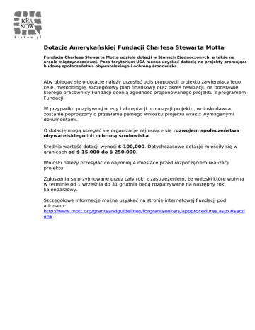 Dotacje Amerykańskiej Fundacji Charlesa Stewarta Motta Fundacja Charlesa Stewarta Motta udziela dotacji w Stanach Zjednoczonych, a także na arenie międzynarodowej. Poza terytorium USA można uzyskać dotację na projekty promujące budowę społeczeństwa obywatelskiego i ochronę środowiska. Aby ubiegać się o dotację należy przesłać opis propozycji projektu zawierający jego cele, metodologię, szczegółowy plan finansowy oraz okres realizacji, na podstawie którego pracownicy Fundacji ocenią zgodność proponowanego projektu z programem Fundacji. W przypadku pozytywnej oceny i akceptacji propozycji projektu, wnioskodawca zostanie poproszony o przesłanie pełnego wniosku projektu wraz z wymaganymi dokumentami. O dotację mogą ubiegać się organizacje zajmujące się rozwojem społeczeństwa obywatelskiego lub ochroną środowiska. Średnia wartość dotacji wynosi $ 100,000. Dotychczasowe dotacje mieściły się w granicach od $ 15.000 do $ 250.000. Wnioski należy przesyłać co najmniej 4 miesiące przed rozpoczęciem realizacji projektu. Zgłoszenia są przyjmowane przez cały rok, z zastrzeżeniem, że wnioski które wpłyną w terminie od 1 września do 31 grudnia będą rozpatrywane na następny rok kalendarzowy. Szczegółowe informacje możne uzyskać na stronie internetowej Fundacji pod adresem: http://www.mott.org/grantsandguidelines/forgrantseekers/appprocedures.aspx#secti on6 Powered by TCPDF (www.tcpdf.org)