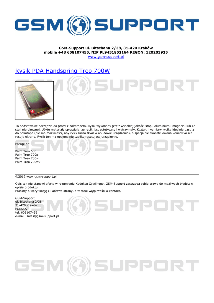GSM-Support ul. Bitschana 2/38, 31-420 Kraków mobile +48 608107455, NIP PL9451852164 REGON: 120203925 www.gsm-support.pl Rysik PDA Handspring Treo 700W To podstawowe narzędzie do pracy z palmtopem. Rysik wykonany jest z wysokiej jakości stopu aluminium i magnezu lub ze stali nierdzewnej. Użyte materiały sprawiają, że rysik jest estetyczny i wytrzymały. Kształt i wymiary rysika idealnie pasują do palmtopa (nie ma możliwości, aby rysik luźno tkwił w obudowie urządzenia), a specjalnie skonstruowana końcówka nie rysuje ekranu. Rysik ten ma opcjonalnie szpilkę resetującą urządzenie. Pasuje do: Palm Palm Palm Palm Treo Treo Treo Treo 650 700p 700w 700wx ©2012 www.gsm-support.pl Opis ten nie stanowi oferty w rozumieniu Kodeksu Cywilnego. GSM-Support zastrzega sobie prawo do możliwych błędów w opisie produktu. Prosimy o weryfikację z Państwa strony, a w razie wątpliwości o kontakt. GSM-Support ul. Bitschana 2/38 31-420 Kraków POLSKA tel. 608107455 e-mail: [email protected] Powered by TCPDF (www.tcpdf.org)