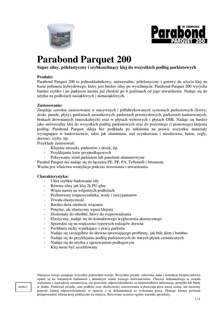 Parabond Parquet 200 Super silny, półelastyczny i szybkoschnący klej do wszystkich podłóg parkietowych Produkt: Parabond Parquet 200 to jednoskładnikowy, uniwersalny, półelastyczny i gotowy do użycia klej na bazie polimeru hybrydowego, który jest bardzo silny po wyschnięciu. Parabond Parquet 200 wysycha bardzo szybko i po parkiecie można już chodzić po 8 godzinach od jego utwardzenia. Nadaje się do użytku na podłożach nasiąkliwych i nienasiąkliwych. Zastosowanie: Znajduje szerokie zastosowanie w masywnych i półfabrykowanych systemach parkietowych (listwy, deski, panele, płyty), parkietach mozaikowych, parkietach przemysłowych, parkietach laminowanych, brukach drewnianych (mieszkalnych) oraz w płytach wiórowych i płytach OSB. Nadaje się bardzo jako uniwersalny klej do wszystkich podłóg parkietowych oraz do poziomego (i pionowego) klejenia podłóg. Parabond Parquet skleja bez podkładu po nałożeniu na prawie wszystkie materiały występujące w budownictwie, takie jak aluminium, stal ocynkowana i nierdzewna, beton, cegły, drewno, szyby, itp. Przykłady zastosowań: - Klejenie mozaiki, parkietów z desek, itp. - Przyklejanie listw przypodłogowych - Pokrywanie wind parkietem lub panelami aluminiowymi Parabol Parquet nie nadaje się do łączenia PE, PP, PA, Teflonu® i bitumenu. Ważna jest właściwa wentylacja podczas stosowania i utwardzania. Charakterystyka: - Ultra szybkie budowanie siły - Równie silny jak klej 2k PU-glue. - Wiąże nawet na wilgotnych podłożach - Pozbawiony rozpuszczalnika, wody i izocyjanianów - Trwała elastyczność - Bardzo duża zdolność wiązania - Potężny, ale elastyczny wpust klejony - Doskonały do obróbki, łatwy do rozprowadzania - Elastyczny, nadaje się do kontaktowego wygłuszenia akustycznego - Sprawdza się na większości typowych rodzajów drewna - Pochłania ruchy wynikające z pracy parkietu - Nadaje się szczególnie do drewna sprawiającego problemy, jak buk, klon i bambus - Nadaje się do przyklejania podłóg parkietowych do starych płytek ceramicznych - Nadaje się do użytku z ogrzewaniem podłogowym - Klej może być zeszlifowany 042013 Korekta Niniejsza wersja zastępuje wszystkie poprzednie wersje. Wszystkie porady, zalecenia, dane i instrukcje bezpieczeństwa oparte są na starannych badaniach i aktualnym stanie naszego doświadczenia. Chociaż dokumentacja ta została wykonana z największą starannością, nie ponosimy odpowiedzialności za nieprawidłowe informacje, pomyłki lub błędy w druku. Ponieważ projekt, stan podłoża oraz okoliczności zastosowania wykraczają poza naszą ocenę, nie możemy ponosić żadnej odpowiedzialności w oparciu o tę dokumentacji za wykonaną pracę. Dlatego klienci powinni przeprowadzić własne testy praktyczne na miejscu. Stosowane są nasze ogólne warunki sprzedaży. 1/4 Przygotowanie powierzchni i nakładanie uszczelniacza: Podłoże: musi być stałe i dość sztywne. Zawartość wilgoci podpory powinna być zmierzona przy użyciu miernika karbidowego lub higrometru cyfrowego i porównana z maksymalną wartością określoną przez producenta podłogi (to jest według NIT 218 WTCB maksymalnie 2,5% dla podłóg cementowych i 0,6% dla anhydrytu). Parkiet najlepiej pozostawić w oryginalnym opakowaniu w odpowiednim miejscu, aby zaaklimatyzował się przez kilka dni. Sprawdzić wilgotność drewna przeznaczonego do montażu i porównać ją z wartością określoną przez producenta. Montaż podłogi jest zdecydowanie odradzany przy wilgotności drewna poniżej 7% lub powyżej 11%. Bardzo porowate podłoża należy wcześniej zagruntować za pomocą podkładu Parquet Adhesive Primer. Obróbka wstępna: Materiały przeznaczone do łączenia muszą być czyste oraz wolne od kurzu i tłuszczu. W razie potrzeby odtłuścić za pomocą Parasilico Cleaner, MEK, alkoholu lub etanolu. Zaleca się przeprowadzenie testów klejenia. Na użytkowniku spoczywa odpowiedzialność, aby sprawdzić, czy produkt nadaje się do danego zastosowania. W razie potrzeby można skonsultować się z naszym działem technicznym. Stosowanie: Parabond Parquet 200 powinien być nakładany na podłoże za pomocą skrobaka do kleju. Nakładać klej do parkietu na suche, czyste, wolne od kurzu i tłuszczu podłoże, bez żadnych luźnych warstw. Nieprawidłowości, takie jak stare pozostałości kleju, należy usunąć mechanicznie. Nierówności podłogi należy najpierw wypoziomować za pomocą warstwy wyrównującej. Podłoże gładkie (np. anhydryt) najlepiej wpierw przeszlifować dla zwiększenia powierzchni kontaktu. Zaleca się zawsze przeprowadzać test wiązania na każdym podłożu. Nanosić klej za pomocą grubo ząbkowanego skrobaka do kleju (5 mm). Należy pamiętać, że czas ekspozycji kleju wynosi około 30 minut (w temperaturze 23° C i 50% wilg. wzgl.). Dlatego też nie należy nakładać zbyt dużo kleju za jednym zamachem. Wsunąć parkiet w mokry klej nałożony na podłoże i dobić gumowym młotkiem. Na tym etapie materiał można jeszcze dopasowywać, należy go po prostu dobrze docisnąć. Jeśli to konieczne, parkiet można lekko obciążyć, aby zapewnić doskonałe rozprzestrzenienie się kleju. Po 8 godzinach można chodzić po parkiecie i szlifować go. Temperatura podłoża: Podczas układania i do czasu całkowitego wyschnięcia kleju Parabond Parquet 200, temperatura podłoża i otoczenia musi wynosić co najmniej +15° C, maksymalnie +20° C z ogrzewaniem podłogowym (za wyjątkiem klejenia całej powierzchni). W odniesieniu do temperatury podłoża stosuje się standardowe instrukcje NIT 218 z WTCB. Temperatura otoczenia: - Temperatura pomieszczenia powinna wynosić od +15° C do +35° C. W odniesieniu do temperatury otoczenia stosuje się standardowe instrukcje NIT 218 z WTCB. - Klej Parabond Parquet 200 może być nakładany bezpośrednio z opakowania na przygotowane podłoże, a następnie rozsmarowywany równomiernie za pomocą skrobaka do kleju.