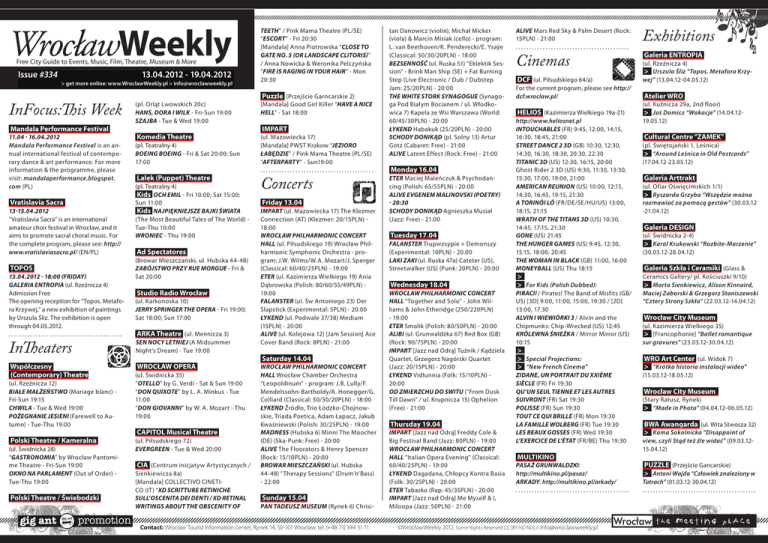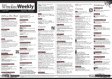 WrocławWeekly Free City Guide to Events, Music, Film, Theatre, Museum & More Issue #334 13.04.2012 - 19.04.2012 > get more online: www.WroclawWeekly.pl > [email protected] InFocus:This Week (pl. Orląt Lwowskich 20c) Hans, Dora i Wilk - Fri-Sun 19:00 Szajba - Tue & Wed 19:00 11.04 - 16.04.2012 Mandala Performance Festival is an annual international festival of contemporary dance & art performance. For more information & the programme, please visit: mandalaperformance.blogspot. com (PL) Komedia Theatre Mandala Performance Festival Vratislavia Sacra 13-15.04.2012 “Vratislavia Sacra" is an international amateur choir festival in Wrocław, and it aims to promote sacral choral music. For the complete program, please see: http:// www.vratislaviasacra.pl/ (EN/PL) TOPOS 13.04.2012 - 18:00 (Friday) Galeria ENTROPIA (ul. Rzeźnicza 4) Admission Free The opening reception for “Topos. Metafora Krzywej," a new exhibition of paintings by Urszula Śliz. The exhibition is open through 04.05.2012. InTheaters Współczesny (Contemporary) Theatre (ul. Rzeźnicza 12) Białe małżeństwo (Mariage blanc) Fri-Sun 19:15 Chwila - Tue & Wed 19:00 Pożegnanie jesieni (Farewell to Autumn) - Tue-Thu 19:00 Polski Theatre / Kameralna (ul. Świdnicka 28) “Gastronomia" by Wrocław Pantomime Theatre - Fri-Sun 19:00 Okno na parlament (Out of Order) Tue-Thu 19:00 Polski Theatre / Świebodzki (pl. Teatralny 4) Boeing Boeing - Fri & Sat 20:00; Sun 17:00 Lalek (Puppet) Theatre (pl. Teatralny 4) Kids Och Emil - Fri 10:00; Sat 15:00; Sun 11:00 Kids Najpiękniejsze bajki świata (The Most Beautiful Tales of The World) Tue-Thu 10:00 Wroniec - Thu 19:00 Ad Spectatores (Browar Mieszczański, ul. Hubska 44-48) Zabójstwo przy Rue Morgue - Fri & Sat 20:00 Studio Radio Wrocław (ul. Karkonoska 10) Jerry Springer The Opera - Fri 19:00; Sat 18:00; Sun 17:00 ARKA Theatre (ul. Mennicza 3) Sen nocy letniej (A Midsummer Night’s Dream) - Tue 19:00 WROCŁAW OPERA (ul. Świdnicka 35) “Otello" by G. Verdi - Sat & Sun 19:00 “Don Quixote" by L. A. Minkus - Tue 11:00 “Don Giovanni" by W. A. Mozart - Thu 19:00 CAPITOL Musical Theatre (ul. Piłsudskiego 72) Evergreen - Tue & Wed 20:00 CIA (Centrum inicjatyw Artystycznych / Sienkiewicza 8a) [Mandala] COLLECTIVO CINETICO (IT) “XD scritture retiniche sull’oscenita dei denti / XD retinal writings about the obscenity of teeth" / Pink Mama Theatre (PL/SE) “Escort" - Fri 20:30 [Mandala] Anna Piotrowska “Close to gate No. 5 (or landscape clitoris)" / Anna Nowicka & Weronika Pelczyńska “Fire is raging in your hair" - Mon 20:30 Puzzle (Przejście Garncarskie 2) [Mandala] Good Girl Killer “Have a Nice Hell" - Sat 18:00 IMPART (ul. Mazowiecka 17) [Mandala] PWST Krakow “Jezioro Łabędzie" / Pink Mama Theatre (PL/SE) “Afterparty" - Sun19:00 Concerts Friday 13.04 IMPART (ul. Mazowiecka 17) The Klezmer Connection (AT) (Klezmer: 20/15PLN) 18:00 WROCŁAW PHILHARMONIC CONCERT HALL (ul. Piłsudskiego 19) Wrocław Philharmonic Symphonic Orchestra - program: J.W. Wilms/W.A. Mozart/J. Sperger (Classical: 60/40/25PLN) - 19:00 ETER (ul. Kazimierza Wielkiego 19) Ania Dąbrowska (Polish: 80/60/55/49PLN) 19:00 FALANSTER (ul. Św Antoniego 23) Der Slapstick (Experimental: 5PLN) - 20.00 ŁYKEND (ul. Podwale 37/38) Medium (15PLN) - 20:00 ALIVE (ul. Kolejowa 12) [Jam Session] Ace Cover Band (Rock: 8PLN) - 21:00 Saturday 14.04 WROCŁAW PHILHARMONIC CONCERT HALL Wrocław Chamber Orchestra “Leopoldinum" - program: J.B. Lully/F. Mendelssohn-Bartholdy/A. Honegger/G. Colliard (Classical: 50/30/20PLN) - 18:00 ŁYKEND Źródło, Trio Łódzko-Chojnowskie, Triada Poetica, Adam Łapacz, Jakub Kwaśniewski (Polish: 30/25PLN) - 19:00 MADNESS (Hubska 6) Minni The Moocher (DE) (Ska-Punk: Free) - 20:00 ALIVE The Floorators & Henry Spencer (Rock: 15/10PLN) - 20:00 BROWAR MIESZCZAŃSKI (ul. Hubska 44-48) “Therapy Sessions" (Drum’n’Bass) - 22:00 Sunday 15.04 PAN TADEUSZ MUSEUM (Rynek 6) Chrisi- Contact: Wrocław Tourist Information Center, Rynek 14, 50-101 Wrocław, tel. (+48 71) 344 31 11 tan Danowicz (violin), Michał Micker (viola) & Marcin Misiak (cello) - program: L. van Beethoven/K. Penderecki/E. Ysaÿe (Classical: 50/30/20PLN) - 18:00 BEZSENNOŚĆ (ul. Ruska 51) “Eklektik Session" - Brink Man Ship (SE) + Fat Burning Step (Live Electronic / Dub / Dubstep Jam: 25/20PLN) - 20:00 THE WHITE STORK SYNAGOGUE (Synagoga Pod Białym Bocianem / ul. Włodkowica 7) Kapela ze Wsi Warszawa (World: 60/45/30PLN) - 20:00 ŁYKEND Habakuk (25/20PLN) - 20:00 SCHODY DONIKĄD (pl. Solny 13) Artur Gotz (Cabaret: Free) - 21:00 ALIVE Latent Effect (Rock: Free) - 21:00 Monday 16.04 ETER Maciej Maleńczuk & Psychodancing (Polish: 65/55PLN) - 20:00 ALIVE Evgenem Malinovski (Poetry) - 20:30 SCHODY DONIKĄD Agnieszka Musiał (Jazz: Free) - 21:00 Tuesday 17.04 FALANSTER Trupwzsypie + Demonszy (Experimental: 10PLN) - 20.00 LAKI ZAKI (ul. Ruska 47a) Cateter (US), Streetwalker (US) (Punk: 20PLN) - 20:00 Wednesday 18.04 WROCŁAW PHILHARMONIC CONCERT HALL “Together and Solo" - John Williams & John Etheridge (250/220PLN) - 19:00 ETER Smolik (Polish: 80/50PLN) - 20:00 ALIBI (ul. Grunwaldzka 67) Red Box (GB) (Rock: 90/75PLN) - 20:00 IMPART [Jazz nad Odrą] Tuźnik / Kądziela Quartet, Grzegorz Nagórski Quartet (Jazz: 20/15PLN) - 20:00 ŁYKEND Vidlunnia (Folk: 15/10PLN) 20:00 OD ZMIERZCHU DO SWITU (“From Dusk Till Dawn" / ul. Krupnicza 15) Ophelion (Free) - 21:00 Thursday 19.04 IMPART [Jazz nad Odrą] Freddy Cole & Big Festival Band (Jazz: 80PLN) - 19:00 WROCŁAW PHILHARMONIC CONCERT HALL “Italian Opera Evening" (Classical: 60/40/25PLN) - 19:00 ŁYKEND Dagadana, Chłopcy Kontra Basia (Folk: 30/25PLN) - 20:00 ETER Tabasko (Rap: 45/35PLN) - 20:00 IMPART [Jazz nad Odrą] Me Myself & I, Miloopa (Jazz: 50PLN) - 21:00 ALIVE Mars Red Sky & Palm Desert (Rock: 15PLN) - 21:00 Cinemas DCF (ul. Piłsudskiego 64/a) For the current program, please see http:// dcf.wroclaw.pl/ HELIOS (Kazimierza Wielkiego 19a-21) http://www.heliosnet.pl Intouchabl