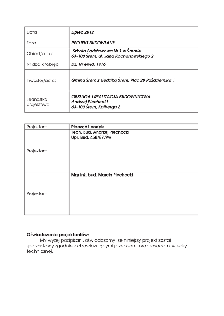 My wyej podpisani, oświadczamy, e niniejszy projekt został