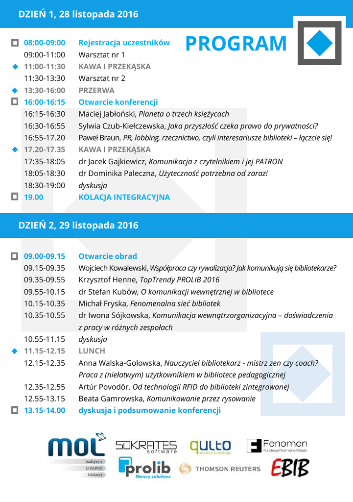 DZIEŃ 1, 28 listopada 2016 PROGRAM 08:00-09:00 Rejestracja uczestników 09:00-11:00 Warsztat nr 1 11:00-11:30 KAWA I PRZEKĄSKA 11:30-13:30 Warsztat nr 2 13:30-16:00 PRZERWA 16:00-16:15 Otwarcie konferencji 16:15-16:30 Maciej Jabłoński, Planeta o trzech księżycach 16:30-16:55 Sylwia Czub-Kiełczewska, Jaka przyszłość czeka prawo do prywatności? 16:55-17.20 Paweł Braun, PR, lobbing, rzecznictwo, czyli interesariusze biblioteki – łączcie się! 17.20-17.35 KAWA I PRZEKĄSKA 17:35-18:05 dr Jacek Gajkiewicz, Komunikacja z czytelnikiem i jej PATRON 18:05-18:30 dr Dominika Paleczna, Użyteczność potrzebna od zaraz! 18:30-19:00 dyskusja 19.00 KOLACJA INTEGRACYJNA DZIEŃ 2, 29 listopada 2016 09.00-09.15 Otwarcie obrad 09.15-09.35 Wojciech Kowalewski, Współpraca czy rywalizacja? Jak komunikują się bibliotekarze? 09.35-09.55 Krzysztof Henne, TopTrendy PROLIB 2016 09.55-10.15 dr Stefan Kubów, O komunikacji wewnętrznej w bibliotece 10.15-10.35 Michał Fryska, Fenomenalna sieć bibliotek 10.35-10.55 dr Iwona Sójkowska, Komunikacja wewnątrzorganizacyjna – doświadczenia z pracy w różnych zespołach 10.55-11.15 dyskusja 11.15-12.15 LUNCH 12.15-12.35 Anna Walska-Golowska, Nauczyciel bibliotekarz - mistrz zen czy coach? Praca z (niełatwym) użytkownikiem w bibliotece pedagogicznej 12.35-12.55 Artúr Povodör, Od technologii RFID do biblioteki zintegrowanej 12.55-13.15 Beata Gamrowska, Komunikowanie przez rysowanie 13.15-14.00 dyskusja i podsumowanie konferencji