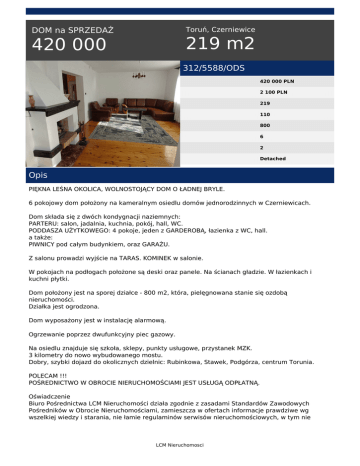 Toruń, Czerniewice DOM na SPRZEDAŻ 219 m2 420 000 312/5588/ODS 420 000 PLN 2 100 PLN 219 110 800 6 2 Detached Opis PIĘKNA LEŚNA OKOLICA, WOLNOSTOJĄCY DOM O ŁADNEJ BRYLE. 6 pokojowy dom położony na kameralnym osiedlu domów jednorodzinnych w Czerniewicach. Dom składa się z dwóch kondygnacji naziemnych: PARTERU: salon, jadalnia, kuchnia, pokój, hall, WC. PODDASZA UŻYTKOWEGO: 4 pokoje, jeden z GARDEROBĄ, łazienka z WC, hall. a także: PIWNICY pod całym budynkiem, oraz GARAŻU. Z salonu prowadzi wyjście na TARAS. KOMINEK w salonie. W pokojach na podłogach położone są deski oraz panele. Na ścianach gładzie. W łazienkach i kuchni płytki. Dom położony jest na sporej działce - 800 m2, która, pielęgnowana stanie się ozdobą nieruchomości. Działka jest ogrodzona. Dom wyposażony jest w instalację alarmową. Ogrzewanie poprzez dwufunkcyjny piec gazowy. Na osiedlu znajduje się szkoła, sklepy, punkty usługowe, przystanek MZK. 3 kilometry do nowo wybudowanego mostu. Dobry, szybki dojazd do okolicznych dzielnic: Rubinkowa, Stawek, Podgórza, centrum Torunia. POLECAM !!! POŚREDNICTWO W OBROCIE NIERUCHOMOŚCIAMI JEST USŁUGĄ ODPŁATNĄ. Oświadczenie Biuro Pośrednictwa LCM Nieruchomości działa zgodnie z zasadami Standardów Zawodowych Pośredników w Obrocie Nieruchomościami, zamieszcza w ofertach informacje prawdziwe wg wszelkiej wiedzy i starania, nie łamie regulaminów serwisów nieruchomościowych, w tym nie LCM Nieruchomosci publikuje celowo nieaktualnych i nieistniejących ofert, oraz stanowczo odcina się od praktyk nieetycznych i wprowadzających inne firmy oraz potencjalnych klientów w błąd. ZAPEWNIAMY BEZPŁATNE I PROFESJONALNE DORADZTWO W ZAKRESIE POZYSKIWANIA KREDYTÓW HIPOTECZNYCH NA ZAKUP NIERUCHOMOŚCI Powyższe informacje zostały sporządzone na podstawie oświadczeń i nie są ofertą w rozumieniu przepisów Kodeksu Cywilnego. Mają one jedynie charakter informacyjny. Joanna Bucewicz tel. 793941092 email: [email protected] LCM Nieruchomosci Powered by TCPDF (www.tcpdf.org)