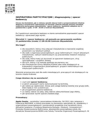 INSPIRATORIA PARTYCYPACYJNE | diagnozujemy | spacer badawczy Chcesz się dowiedzieć, jak w ciekawy sposób włączyć ludzi w przeprowadzenie lokalnej diagnozy w przestrzeni? Zapraszamy na warsztat, podczas którego poznasz narzędzie wspierania partycypacji obywatelskiej - spacer badawczy. Spotkanie odbędzie się 21 października w godz. 17.00 - 20.00 w Centrum Obywatelskim. Po 3-godzinnym warsztacie będziesz w stanie samodzielnie poprowadzić spacer badawczy i opracować jego wyniki. Warsztat 1 | spacer badawczy- od pomysłu po opracowanie wyników 21 października (środa) 17.00-20.00 Centrum Obywatelskie Dla kogo? dla wszystkich, którzy chcą włączać mieszkańców w tworzenie wspólnej przestrzeni czy lokalnych polityk, dla osób z organizacji pozarządowych, grup nieformalnych i innych aktywnych mieszkańców, radnych dzielnicowych czy pracowników mieskich instytucji publicznych, dla osób, które miały już styczność ze spacerem badawczym, chcą uporządkować i uzupełnić wiedzę, dla tych, którzy z tą metodą spotkają się pierwszy raz, dla mieszkańców Gminy Miejskiej Kraków albo osób działających w krakowskich organizacjach pozarządowych, grupach nieformalnych lub instytucjach publicznych. Warsztat przeznaczony jest dla osób mieszkających, pracujących lub działających na terenie miasta Krakowa. Czego dowiesz się na warsztacie? czym jest spacer badawczy, w jakich sytuacjach warto wykorzystywać tę technikę, jak należy go zaplanować, biorąc pod uwagę badaną kwestię oraz grupę osób, które będą w nim uczestniczyć, jak przygotować pytania badawcze, co należy zabrać ze sobą, żeby dobrze udokumentować jego efekty, jak opracować wyniki spaceru badawczego. Prowadzący Agata Sawka – socjolożka i pozarządowa działaczka. Od 2011 roku związana z Federacją MAZOWIA, w której pracowała na stanowisku specjalistki ds. współpracy z organizacjami pozarządowymi, koordynatorki projektów oraz dyrektorki biura. Aktualnie związana z Fundacją Wspierania Rozwoju i Edukacji „Innowatorium". Prezeska Stowarzyszenia ReAnimacja, absolwentka pozarządowej szkoły dla doradców Stowarzyszenia BORIS oraz Szkoły Trenerów Organizacji Pozarządowych. W pracy z mieszkańcami i organizacjami pozarządowymi stara się wykorzystywać metody aktywne. Spacery badawcze prowadziła m.in. z seniorami i seniorkami badając dostępność mazowieckich miast do ich potrzeb. Przemek Dziewitek - urodzony w Szczecinie w 1975 r. Trener i moderator. Absolwent socjologii UJ, ze specjalnością praca socjalna, absolwent Szkoły Liderów Polsko-Amerykańskiej Fundacji Wolności. Prezes Stowarzyszenia Pracownia Obywatelska, Prezes Federacji Małopolska Pozarządowa. Przewodniczący Krakowskiej Rady Działalności Pożytku Publicznego, zastępca przewodniczącego zespołu prezydenckiego ds. ustalenia zasad pierwszego budżetu partycypacyjnego w Krakowie. Członek zespołu eksperckiego ds. przygotowania Strategii Rozwoju Krakowa 2030 – odpowiedzialny za partycypacyjny proces powstania założeń z obszaru społeczeństwa obywatelskiego. Moderator procesu przygotowania zasad działania Centrum Obywatelskiego powierzonego przez Gminę Miejską Kraków do prowadzenia przez organizacje pozarządowe. Członek zespołu pilotażowego gminnego programu rehabilitacji osiedli. Jak będziemy pracować? Podczas warsztatów zostaną przeanalizowane konkretne przykłady zrealizowanych działań, a osoby uczestniczące zyskają okazję przeprowadzenia spaceru badawczego. Warsztat będzie prowadzony aktywnymi metodami: ćwiczenia, dyskusje, praca indywidualna i w grupach, studia przypadków. W trakcie zajęć zostaną omówione doświadczenia uczestniczek i uczestników, a także prowadzących. Gdzie? Warsztat odbędzie się w Centrum Obywatelskim w Krakowie - przestrzeni dla krakowskich inicjatyw i organizacji pozarządowych, w ramach cyklu IINSPIRATORIA PARTYCYPACYJNE – spotkań dla tych, którzy chcą włączać mieszkańców w zmienianie swojej okolicy. ul. Reymonta 20, wejście „LE" od strony Parku Jordana, I piętro, sala konferencyjna nr 40. Jak się zapisać? Prześlij wypełniony formularz zgłoszeniowy do 19 października 2015 r. W przypadku, gdy ilość zgłoszeń przekroczy pulę dostępnych miejsc o przyjęciu na warsztat decydować będzie pomysł na wykorzystanie zdobytej wiedzy w praktyce. Ponadto ograniczona zostanie ilość uczestników z jednej organizacji czy grupy. Szczegółowych informacji udziela Gosia Spasiewicz – Bulas (email: [email protected]). Powered by TCPDF (www.tcpdf.org)