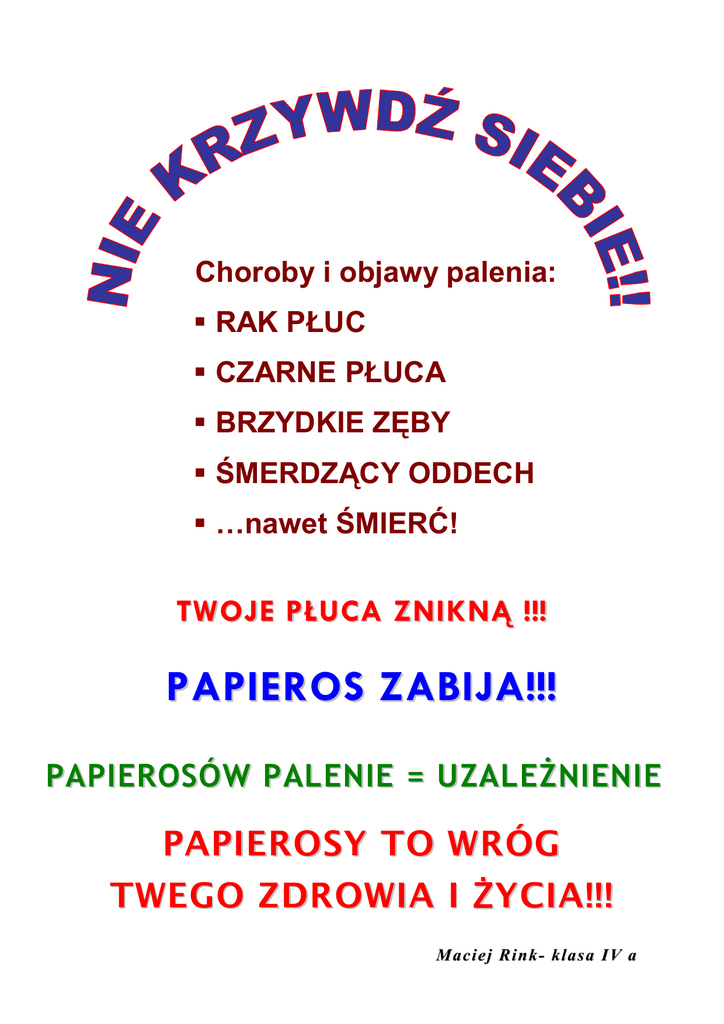 Choroby i objawy palenia: RAK PŁUC CZARNE PŁUCA BRZYDKIE ZĘBY ŚMERDZĄCY ODDECH …nawet ŚMIERĆ! TWOJE PŁUCA ZNIKNĄ !!! PAPIEROS ZABIJA!!! PAPIEROSÓ W PALENIE = UZAL EŻNI EN IE PAPIE ROSY TO WRÓG TWE GO ZDROWIA I Ż Y CIA!!! Maciej Rink- klasa IV a
