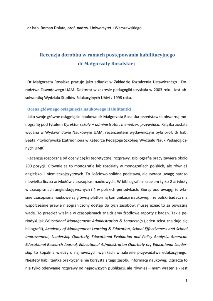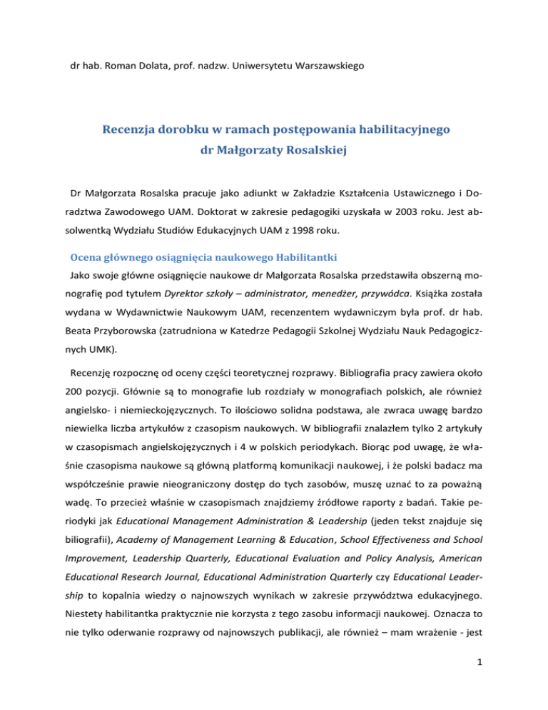 dr hab. Roman Dolata, prof. nadzw. Uniwersytetu Warszawskiego Recenzja dorobku w ramach postępowania habilitacyjnego dr Małgorzaty Rosalskiej Dr Małgorzata Rosalska pracuje jako adiunkt w Zakładzie Kształcenia Ustawicznego i Doradztwa Zawodowego UAM. Doktorat w zakresie pedagogiki uzyskała w 2003 roku. Jest absolwentką Wydziału Studiów Edukacyjnych UAM z 1998 roku. Ocena głównego osiągnięcia naukowego Habilitantki Jako swoje główne osiągnięcie naukowe dr Małgorzata Rosalska przedstawiła obszerną monografię pod tytułem Dyrektor szkoły – administrator, menedżer, przywódca. Książka została wydana w Wydawnictwie Naukowym UAM, recenzentem wydawniczym była prof. dr hab. Beata Przyborowska (zatrudniona w Katedrze Pedagogii Szkolnej Wydziału Nauk Pedagogicznych UMK). Recenzję rozpocznę od oceny części teoretycznej rozprawy. Bibliografia pracy zawiera około 200 pozycji. Głównie są to monografie lub rozdziały w monografiach polskich, ale również angielsko- i niemieckojęzycznych. To ilościowo solidna podstawa, ale zwraca uwagę bardzo niewielka liczba artykułów z czasopism naukowych. W bibliografii znalazłem tylko 2 artykuły w czasopismach angielskojęzycznych i 4 w polskich periodykach. Biorąc pod uwagę, że właśnie czasopisma naukowe są główną platformą komunikacji naukowej, i że polski badacz ma współcześnie prawie nieograniczony dostęp do tych zasobów, muszę uznać to za poważną wadę. To przecież właśnie w czasopismach znajdziemy źródłowe raporty z badań. Takie periodyki jak Educational Management Administration & Leadership (jeden tekst znajduje się biliografii), Academy of Management Learning & Education, School Effectiveness and School Improvement, Leadership Quarterly, Educational Evaluation and Policy Analysis, American Educational Research Journal, Educational Administration Quarterly czy Educational Leadership to kopalnia wiedzy o najnowszych wynikach w zakresie przywództwa edukacyjnego. Niestety habilitantka praktycznie nie korzysta z tego zasobu informacji naukowej. Oznacza to nie tylko oderwanie rozprawy od najnowszych publikacji, ale również – mam wrażenie - jest 1 główną przyczyną zaburzenia niezbędnej w nauce równowagi między rozważaniami pojęciowymi a empirią. I nie mam na myśli tylko badań własnych Habilitantki, ale generalnie „odarcie” dyskursu naukowego rozprawy z warstwy empirycznej. Przecież rola dyrektora, czy szerzej przywództwo w edukacji jest przedmiotem bardzo wielu badań krajowych i zagranicznych, w tym rozległych programów międzynarodowych takich jak OECD Teaching and Learning International Survey (TALIS) czy Programme for International Student Assessment (PISA). Badanie TALIS jest reprezentowane w bibliografii – co jest bardzo symptomatyczne jedynie przez Conceptual Framework. A wyniki badania? Przecież Polska brała udział w dwóch edycjach tego ciekawego projektu. Warstwa rozważań pojęciowych w recenzowanej książce jest bardzo bogata, choć nie bez wad, ale ich bardzo słabe powiązanie z wynikami badań nad przywództwem radykalnie obniża wartość naukową pracy. Tajemnicy przywództwa nie zgłębimy jedynie w drodze spekulacji. Najpoważniejszym mankamentem części teoretycznej ocenianej monografii jest gołosłowność. Zdecydowanie zbyt często Autorka formułuje mocne i ważne dla tematu pracy tezy bez niezbędnego w pracy naukowej udokumentowania, czy to poprzez wyniki explicite w przypisie wskazanych badań, czy też przez odwołanie się do konkretnej koncepcji czy teorii. Ocenę tę poprę kilkoma przykładami. Na stronie 53. w opisie wymiaru politycznego przywództwa znajdujemy tezę, że efektem funkcjonującego systemu nadzoru pedagogicznego, jest to, że szkołom „Na pogłębione analizy indywidualnej szkolnej rzeczywistości brakuje już czasu i motywacji.”. To ciekawa opinia, która mogłaby się stać hipotezą ukierunkowującą bardzo ważne badanie, ale tak sobie rzucona w tekście bez żadnego udokumentowania jest „obcym” ciałem w naukowej rozprawie. Inny przykład znajdujemy na stronie 122. Habilitantka omawiając aksjologiczny wymiar przywództwa edukacyjnego pisze: „Na podstawie przekazu medialnego można przyjąć, iż kwestie dotyczące wartości są omawiane z nauczycielami i rodzicami najczęściej wtedy, gdy wystąpi na ich tle konflikt.” Niestety znów brak jakiegokolwiek udokumentowania. Być może to trafny trop, ale bez bardziej precyzyjnego sformułowania i empirycznego udokumentowania jest to tylko słaba publicystyka. Również sformułowana na stronie 166. teza. „Można przyjąć, że konkursy na stanowisko dyrektora szkoły częściej są przejawem lokalnych, doraźnych gier politycznych, niż przemyślanym elementem długofalowej polityki oświatowej dla danej społeczności lokalnej.” nie jest poparta żadnymi argumentami empirycznymi. To jest 2 znów bardzo ciekawa teza, pewnie prawdziwa, ale bez empirycznego ugruntowania nie ma naukowej wartości. W niektórych przypadkach brak naukowego udokumentowania dotyczy tez jawnie nietrafnych lub mocno problematycznych. Na stronie 125. czytamy, że w polskich szkołach „... dyrektor nie jest oceniany przez pryzmat wyników uczniów w obszarach wybranych kompetencji.” Dziwna to teza, bo chociażby w wymaganiach państwa wobec szkoły, które są podstawą systemu ewaluacji szkół, takie wymaganie jest explicite wpisane. Z kolei na stronie 165. Autorka pisze, że: „Opisując relację władzy między dyrektorem a nauczycielami polskiej szkoły, należy także wskazać na czynnik silnie tę relację kształtujący (zaburzający). (...) Można przyjąć, że dyrektor działa w dyktacie ustawy Karta nauczyciela.” Znaczenie przywoływanej ustawy jest z pewnością w analizach roli dyrektora szkoły nie do przecenienia, ale „zbycie” tego tematu tezą jednostronną, naukowo nieudokumentowaną i na dodatek sformułowaną z użyciem silnie nacechowanyc
